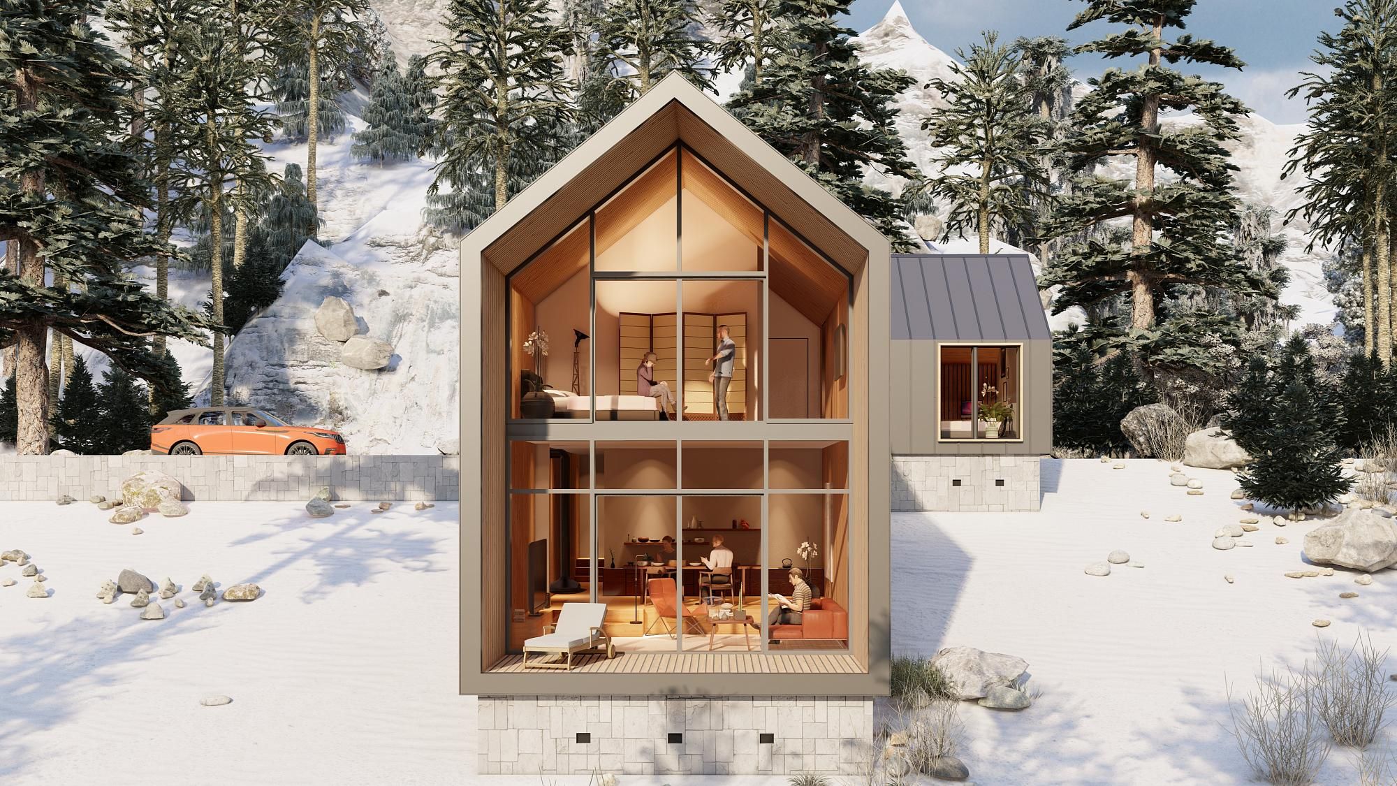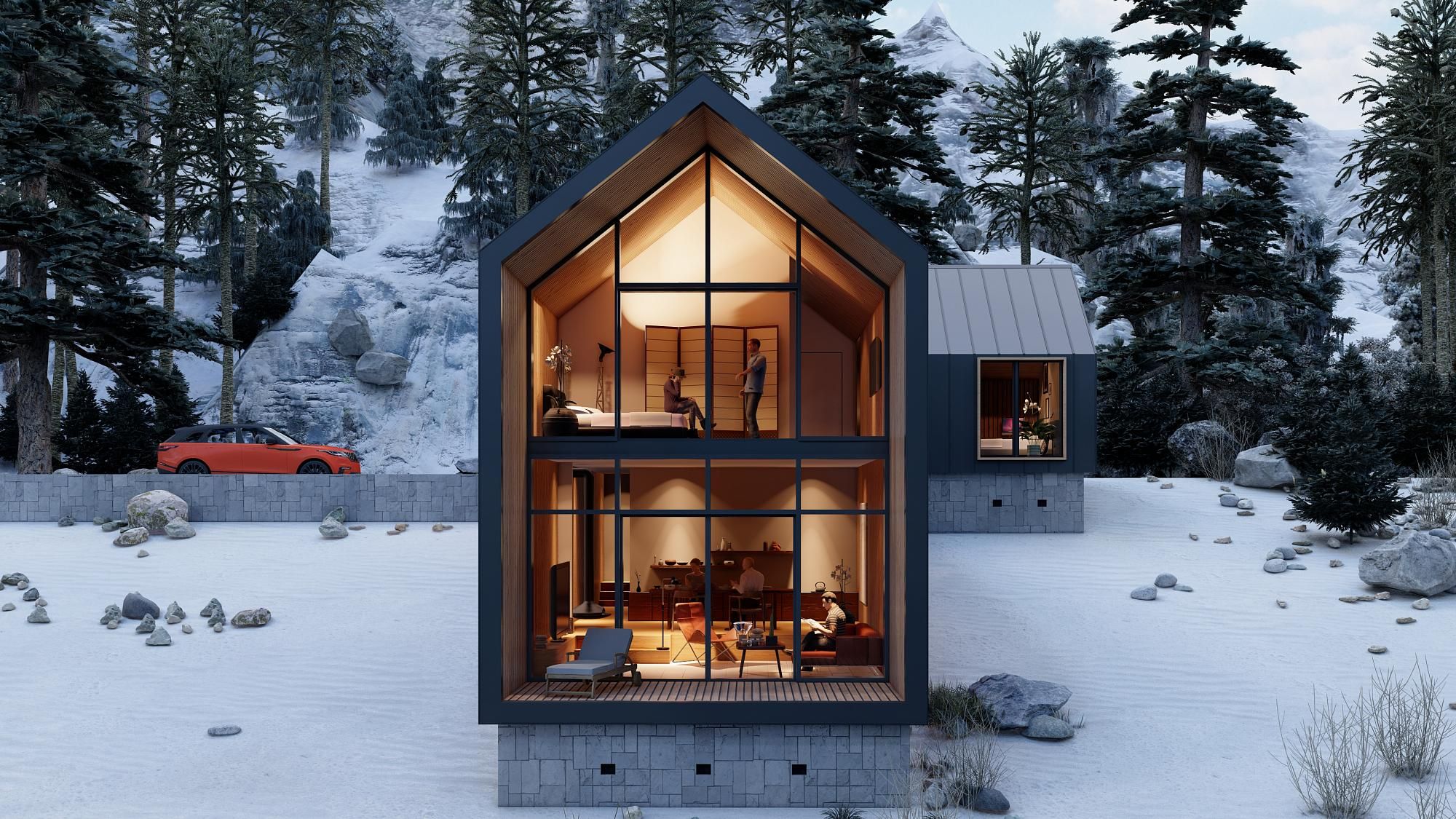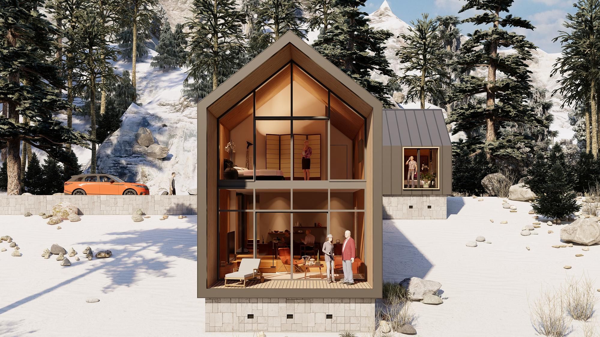 • Баланс приватности и открытости. Практически глухие торцы сосуществуют с одной полностью стеклянной стороной дома, из которой открывается живописный вид. В здании есть и полностью уединённые зоны.
