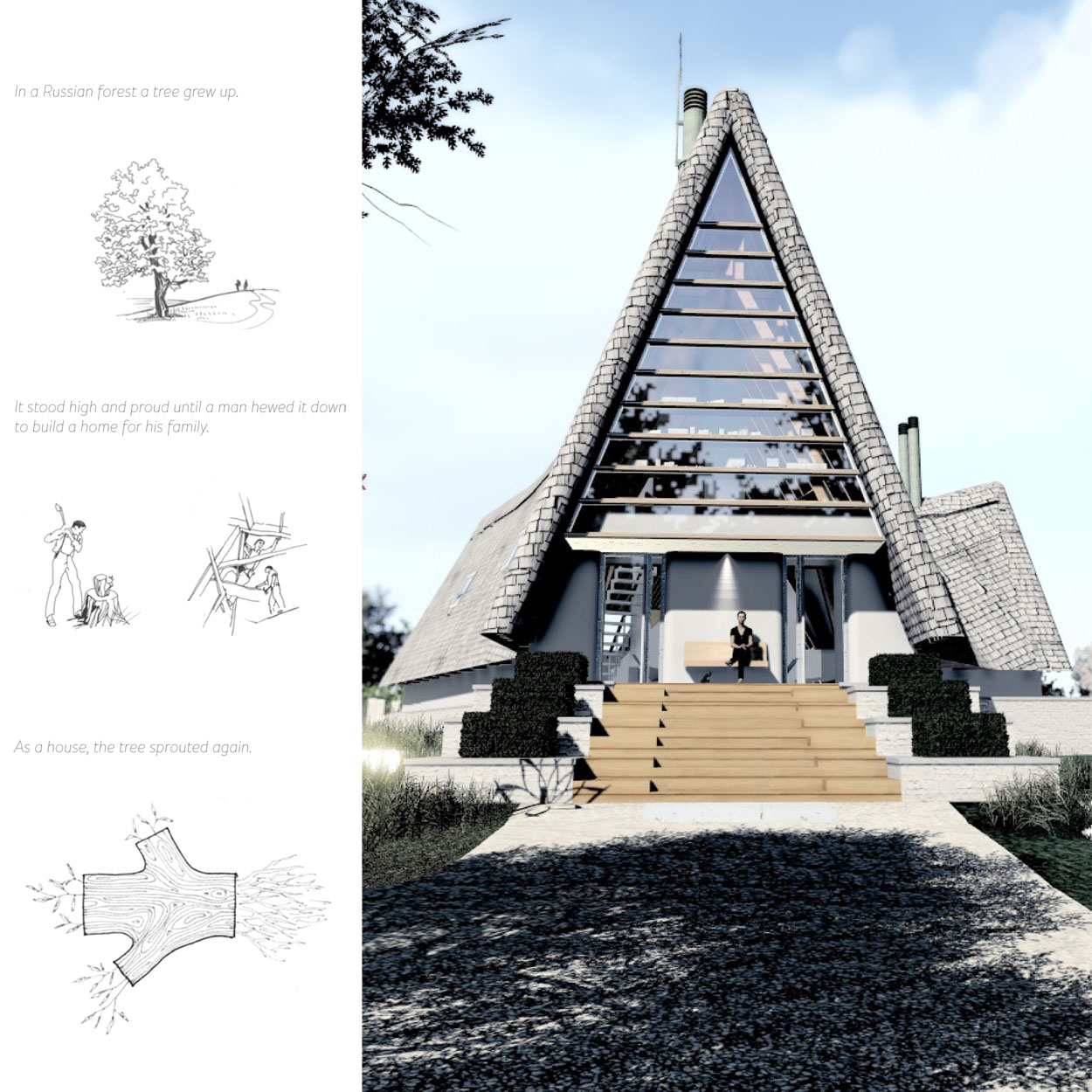 How does cultural heritage of an individual influence his or her personal awareness of the world around him or her? The Bent House depicts both the client’s personal values and cultural context of the Smolensk region with its appreciation of Russian folklore.