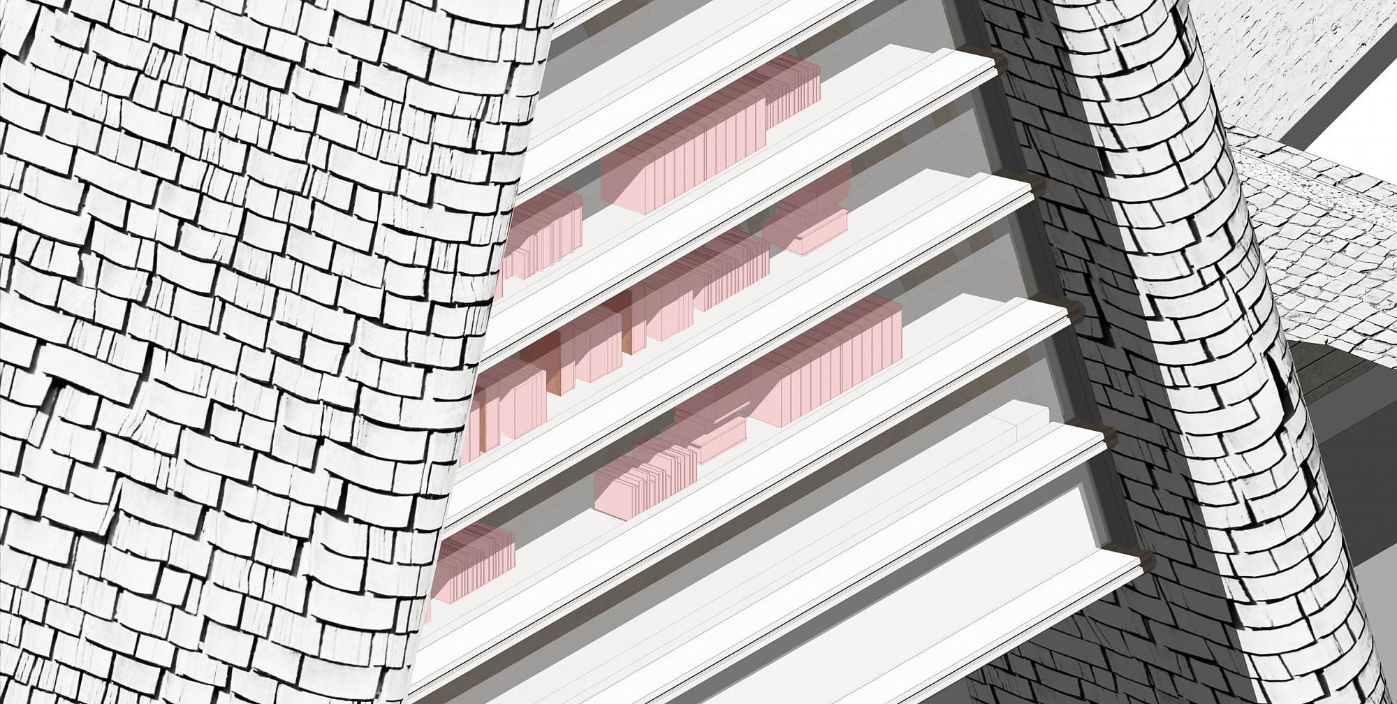 The form of the house embodies its organic reaction to the context. The client got the site with the pre-built concrete stylobate. We made this reconstruction of the previously dull shape, bending and twisting it in response to its surroundings.
