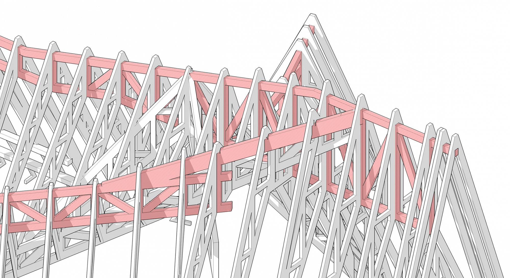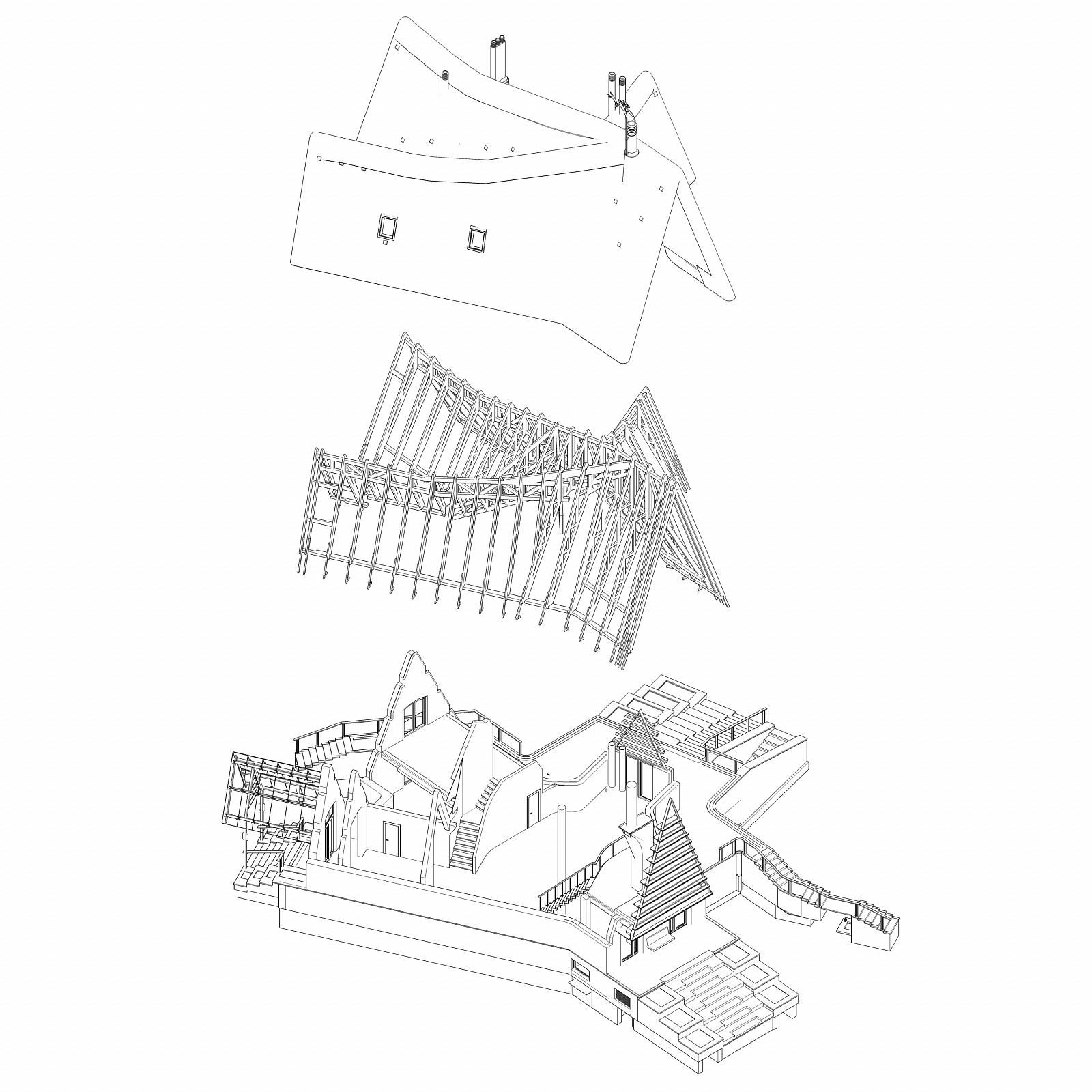 "Bent House" (Гибкий дом) представляет собой моно-пространство под высокой крышей: отражает предпочтение заказчика отдыхать и общаться чувствуя полную защищенность. Трех-головая форма продиктована окружением: "головы" имеют крупноформатное остекление и обращены в сторону лучших видов, ключевых подходов и осей генплана. Это гостевой дом, место для отдыха и центр социализации большой дружной семьи, живущей в главном доме, расположенном по соседству.