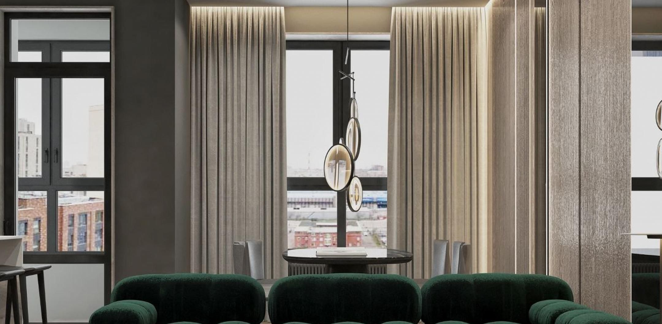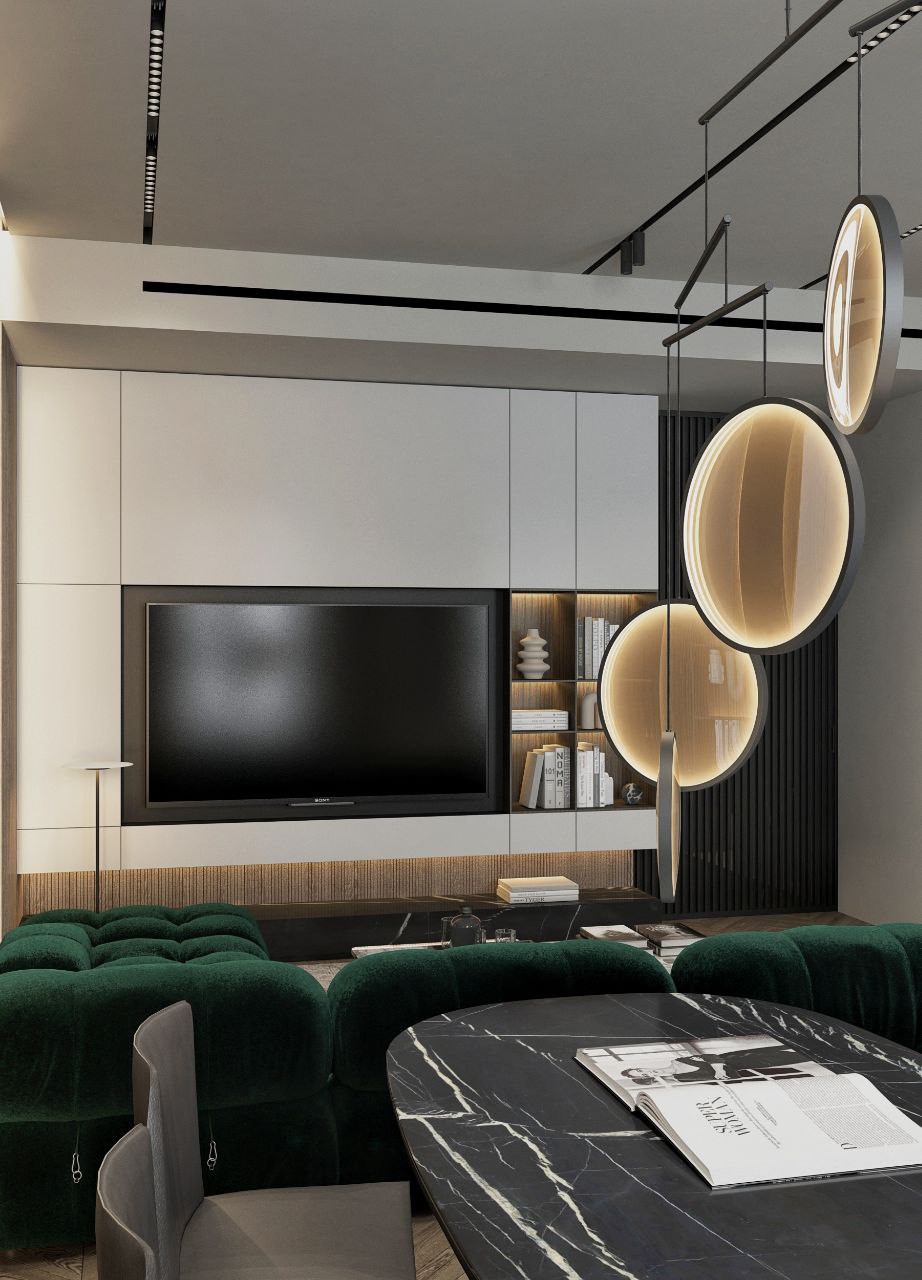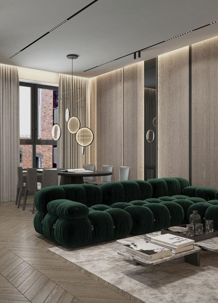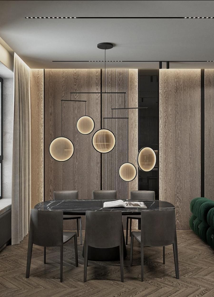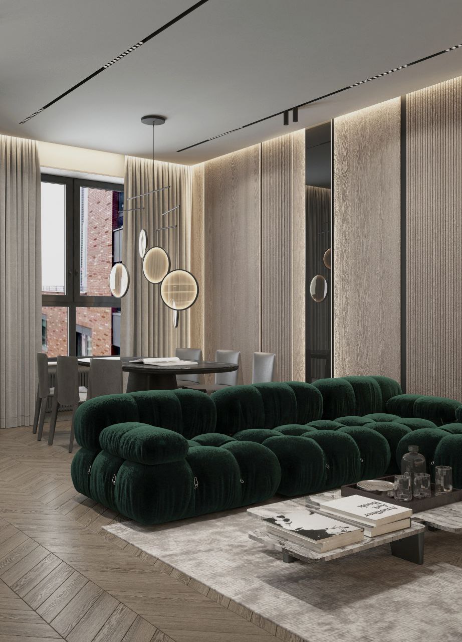 Современный стиль - минимализм гостиной и кухонной зоны. Классические молдинги на стенах гармонично дополняются минималистичной мебелью, создавая элегантный контраст. Мягкий диван с напористыми скругленными формами и акцентной обивкой становится центральным элементом комнаты, обеспечивая комфорт и приглашая к отдыху. Деревянные столики добавляют теплоты и природной текстуры, уравновешивая современные черты интерьера. Освещение, включая латунный подвесной светильник и напольный светильник, обеспечивает как функциональное, так и атмосферное освещение. Обеденная зона с темным столом и черными стульями подчеркивает лаконичность и стиль. В целом, дизайн этой гостиной отражает продуманный подход к созданию уютного и стильного пространства, где каждый элемент способствует созданию гармоничной и привлекательной атмосферы.