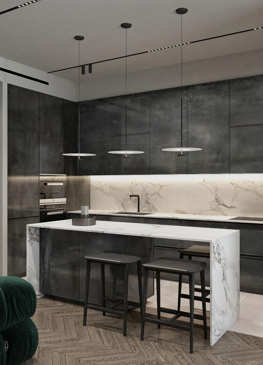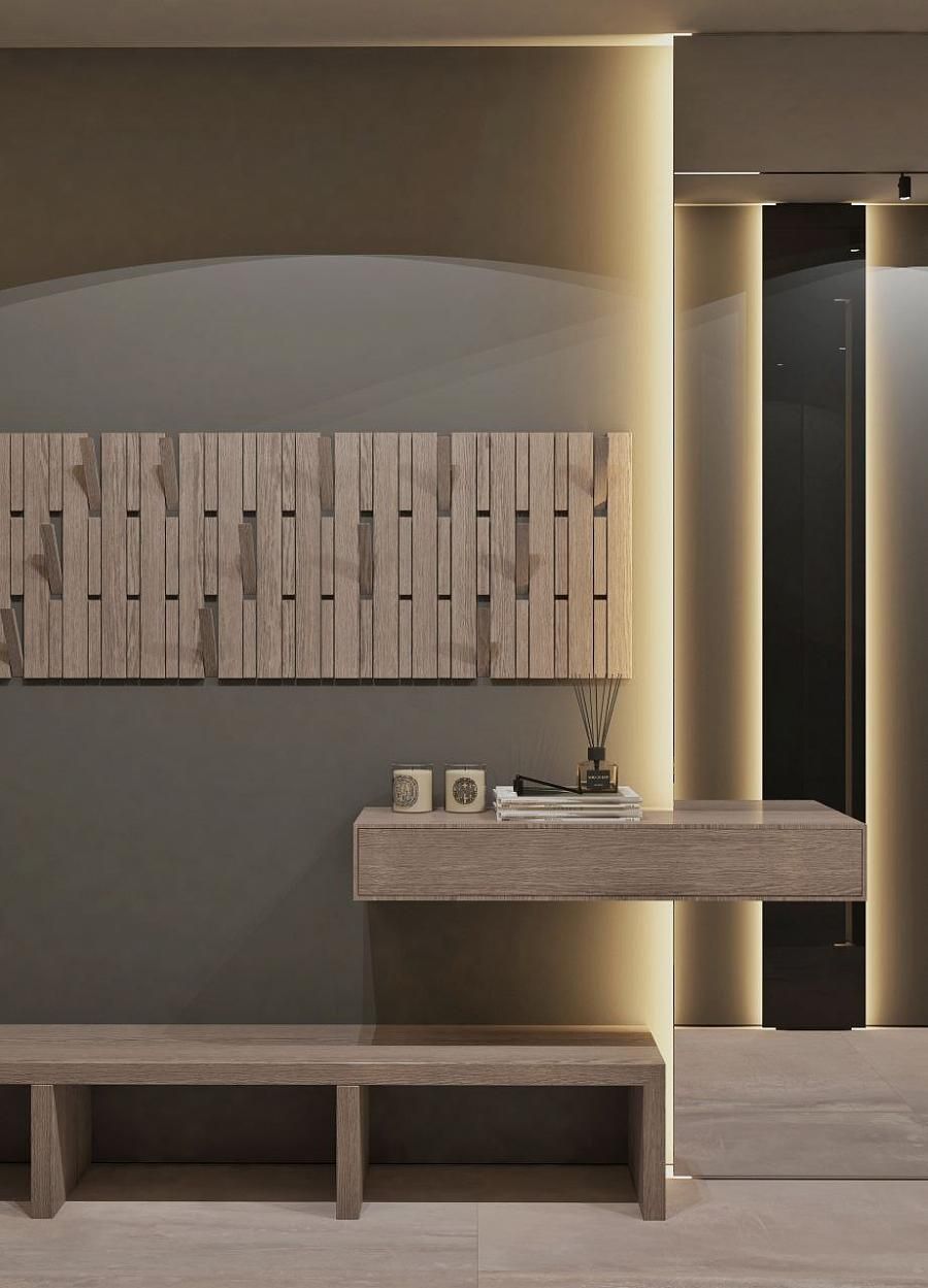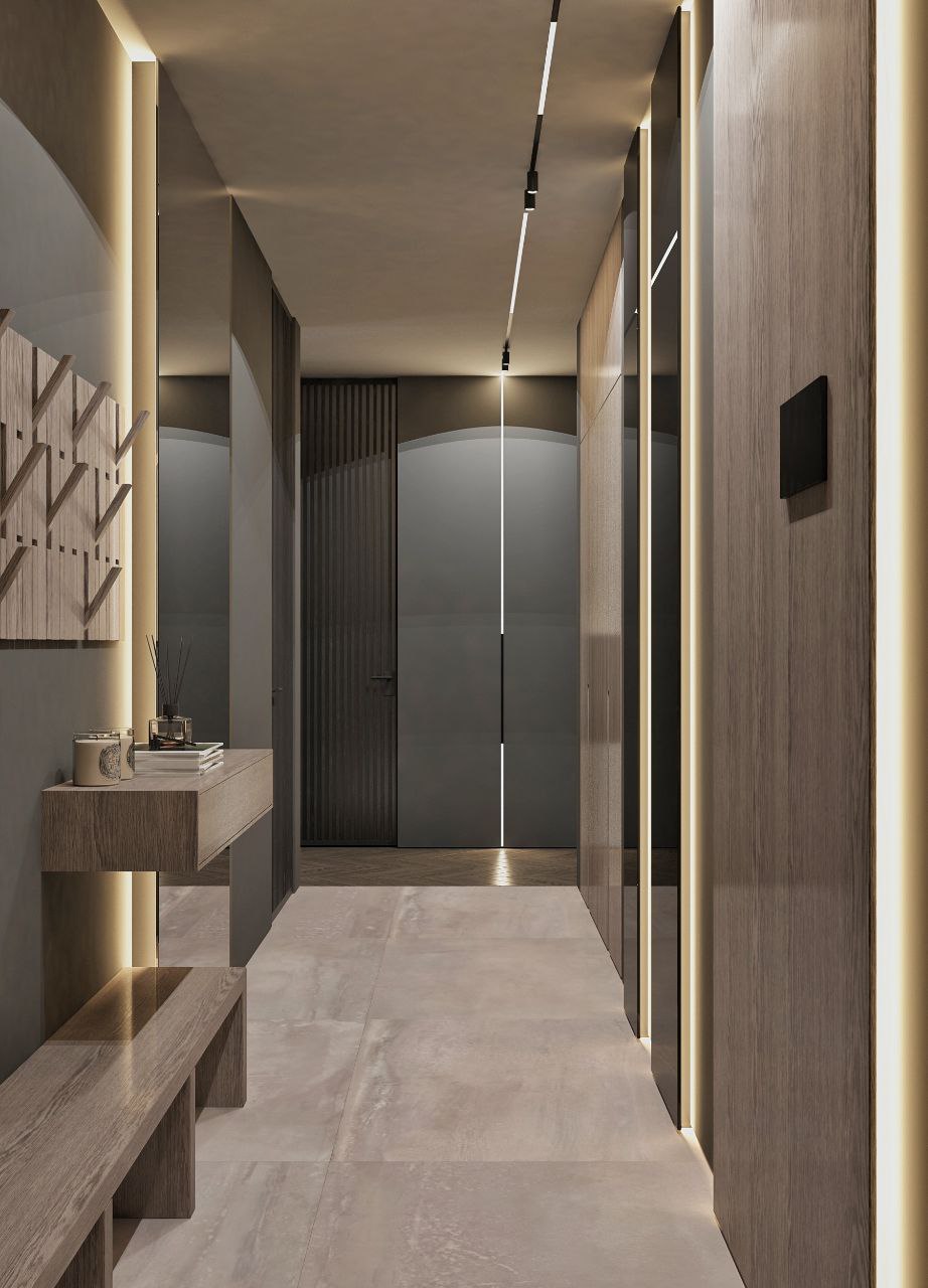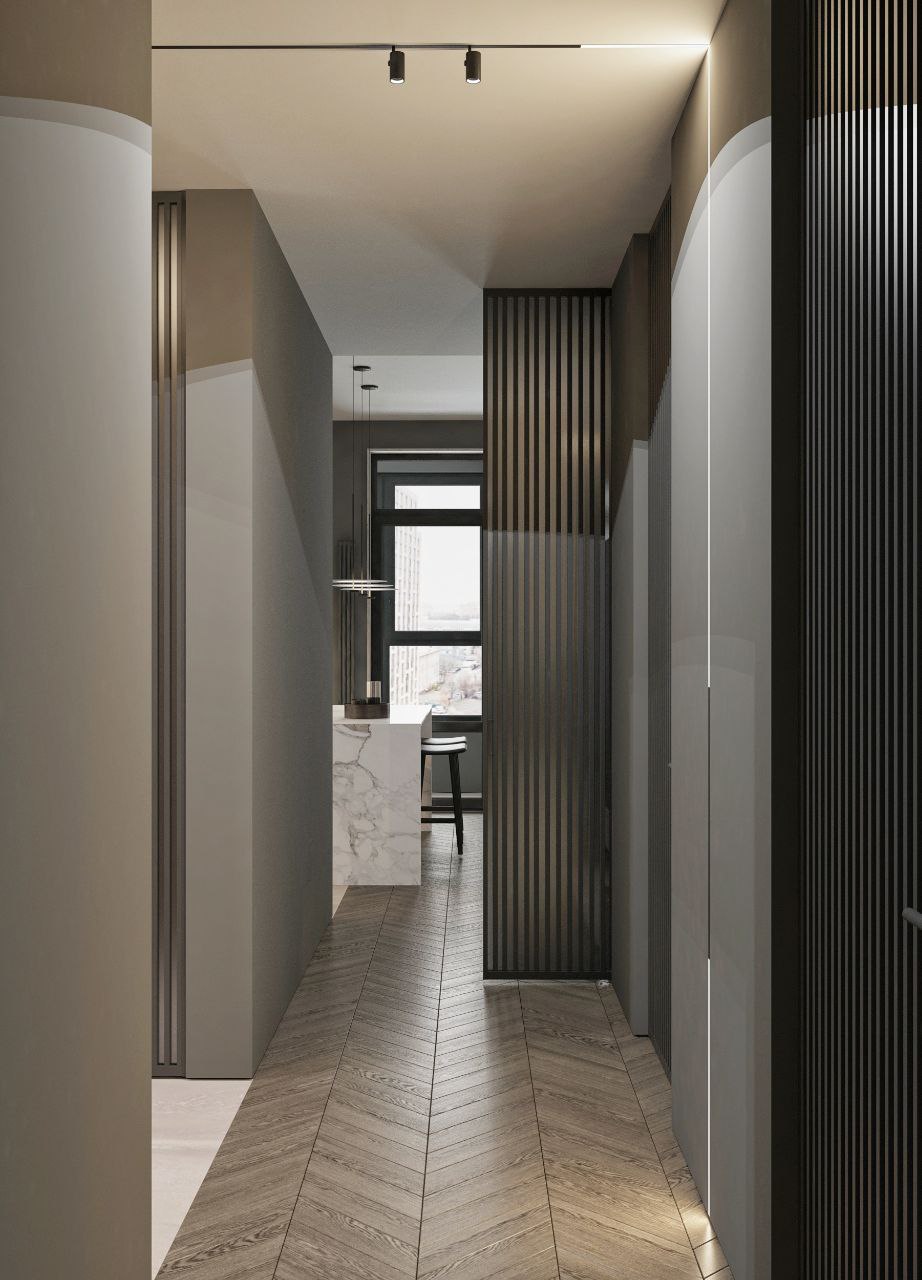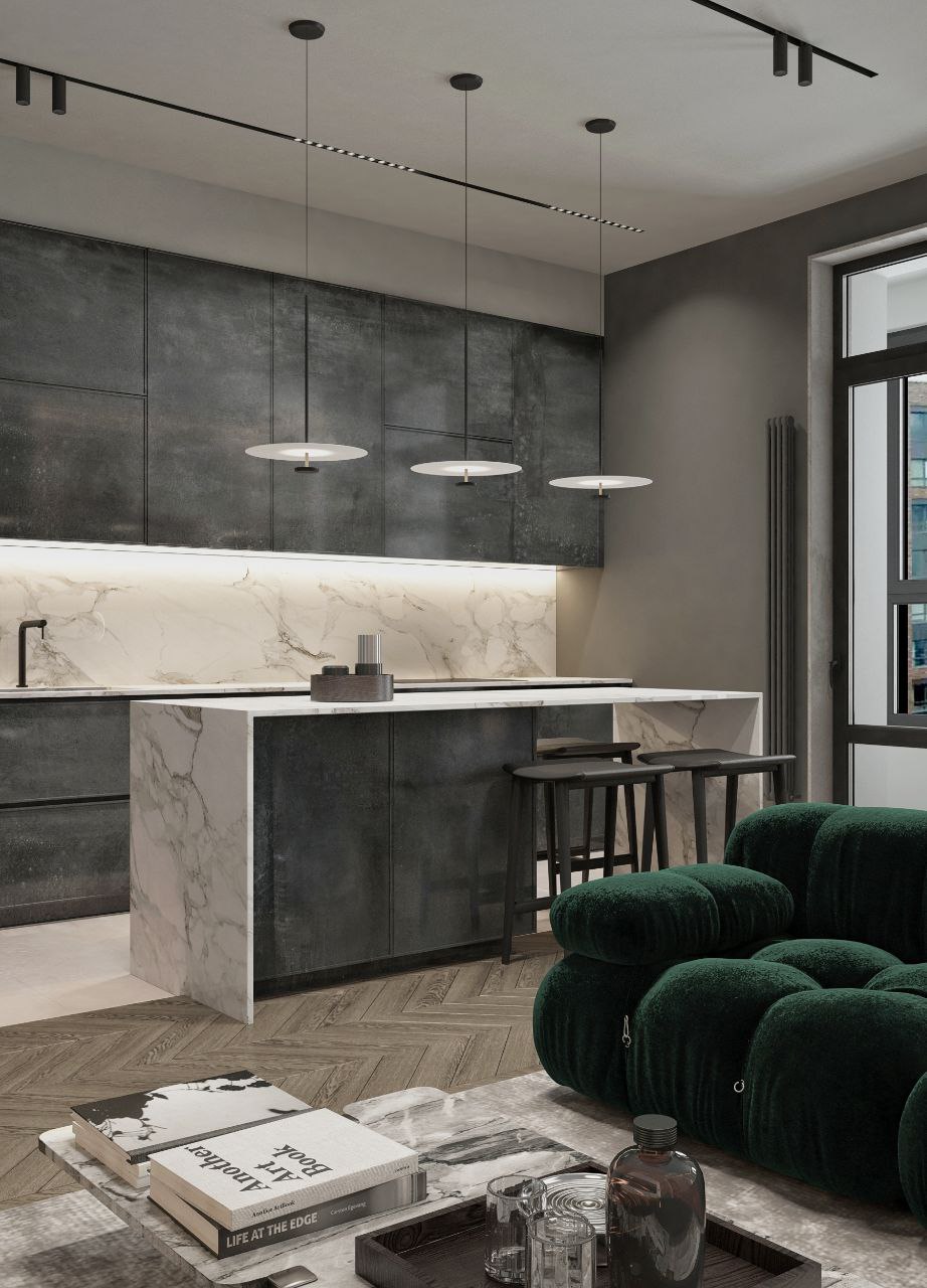 Современный стиль - минимализм гостиной и кухонной зоны. Классические молдинги на стенах гармонично дополняются минималистичной мебелью, создавая элегантный контраст. Мягкий диван с напористыми скругленными формами и акцентной обивкой становится центральным элементом комнаты, обеспечивая комфорт и приглашая к отдыху. Деревянные столики добавляют теплоты и природной текстуры, уравновешивая современные черты интерьера. Освещение, включая латунный подвесной светильник и напольный светильник, обеспечивает как функциональное, так и атмосферное освещение. Обеденная зона с темным столом и черными стульями подчеркивает лаконичность и стиль. В целом, дизайн этой гостиной отражает продуманный подход к созданию уютного и стильного пространства, где каждый элемент способствует созданию гармоничной и привлекательной атмосферы.