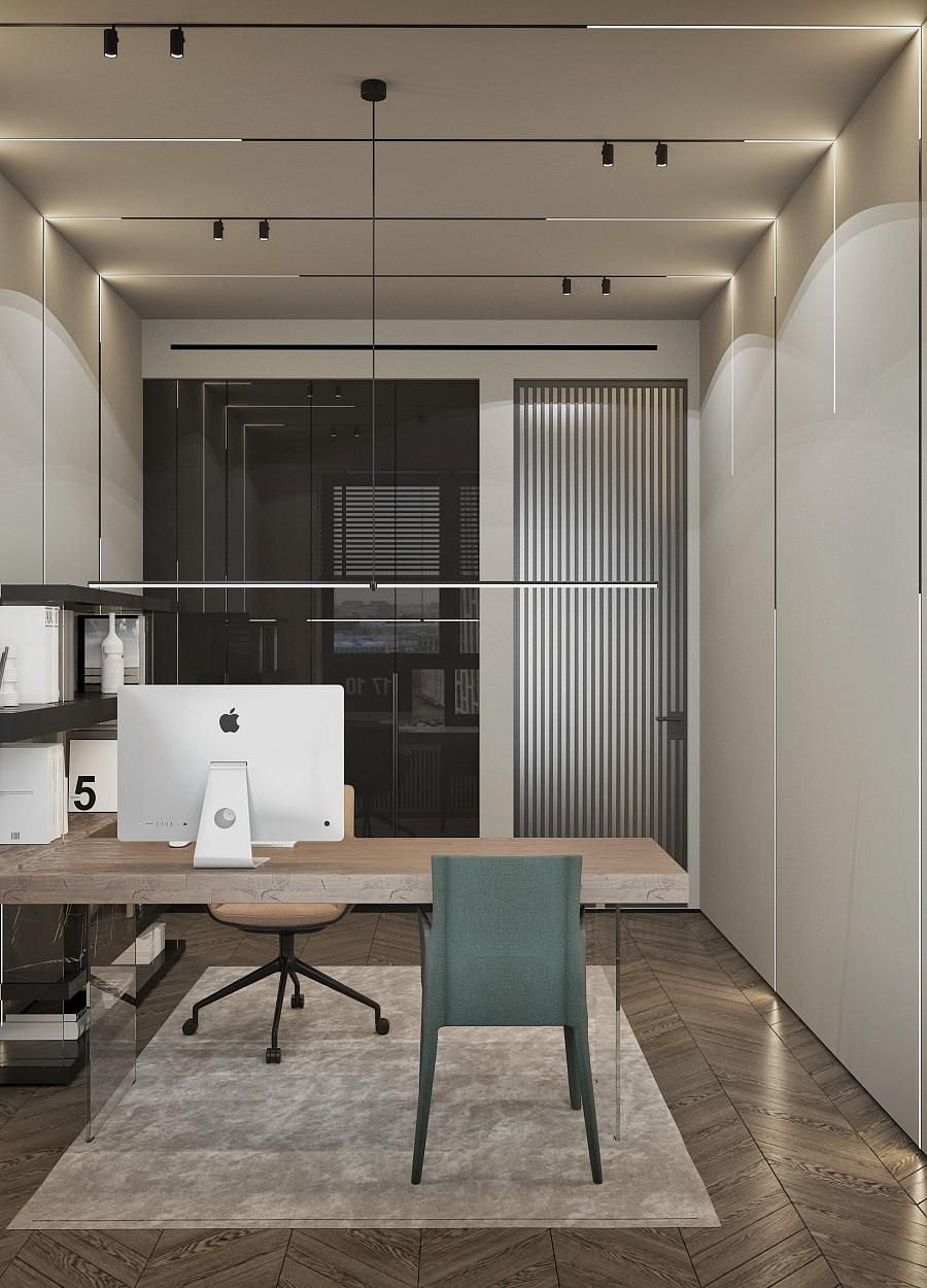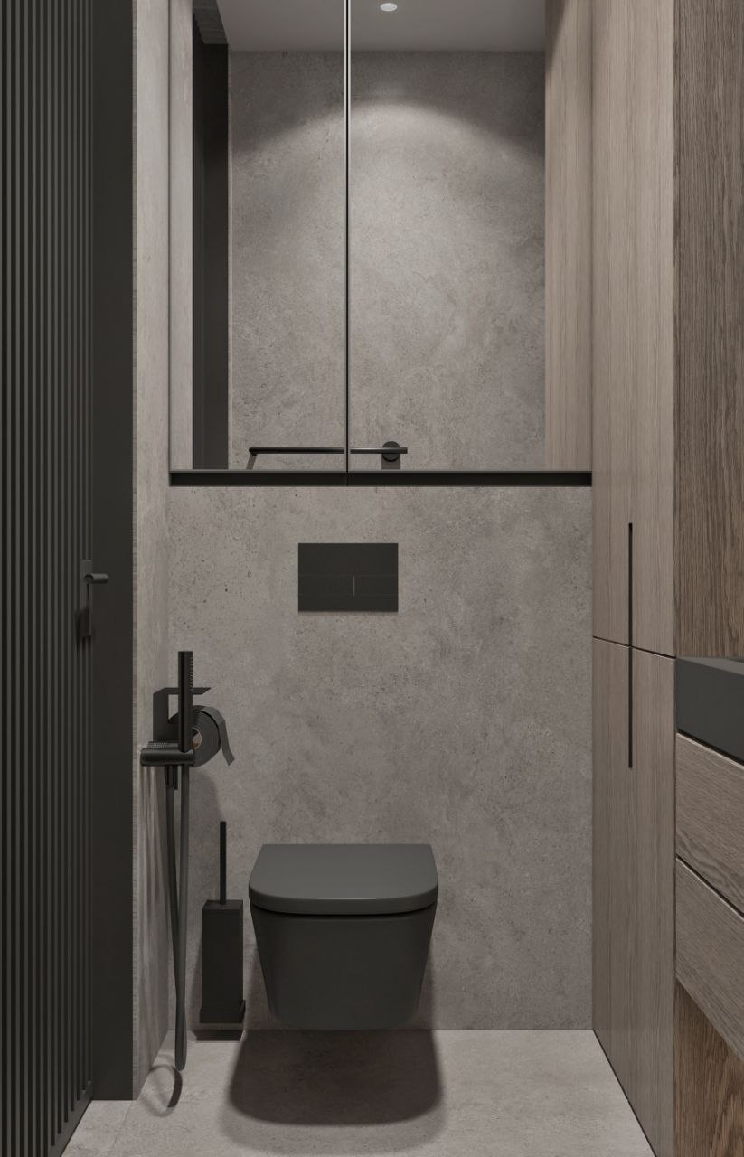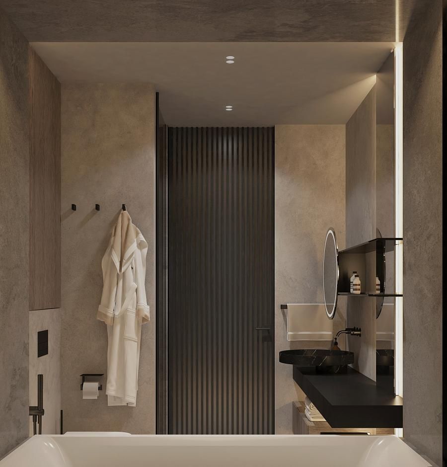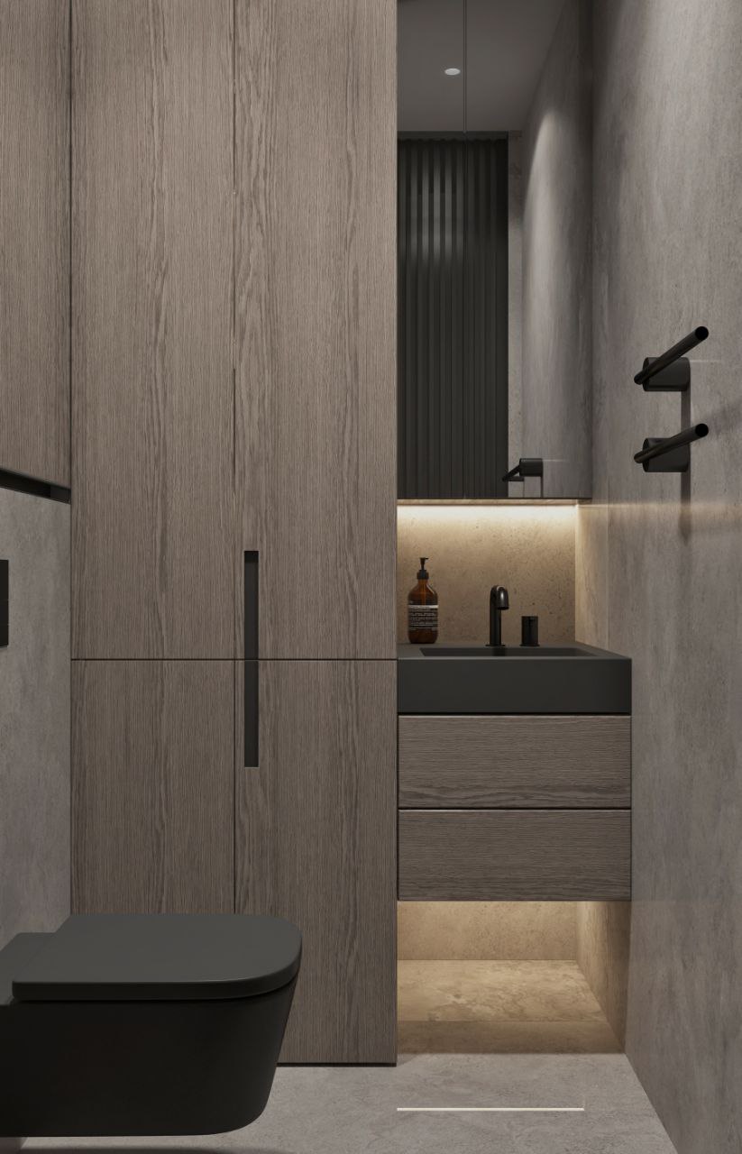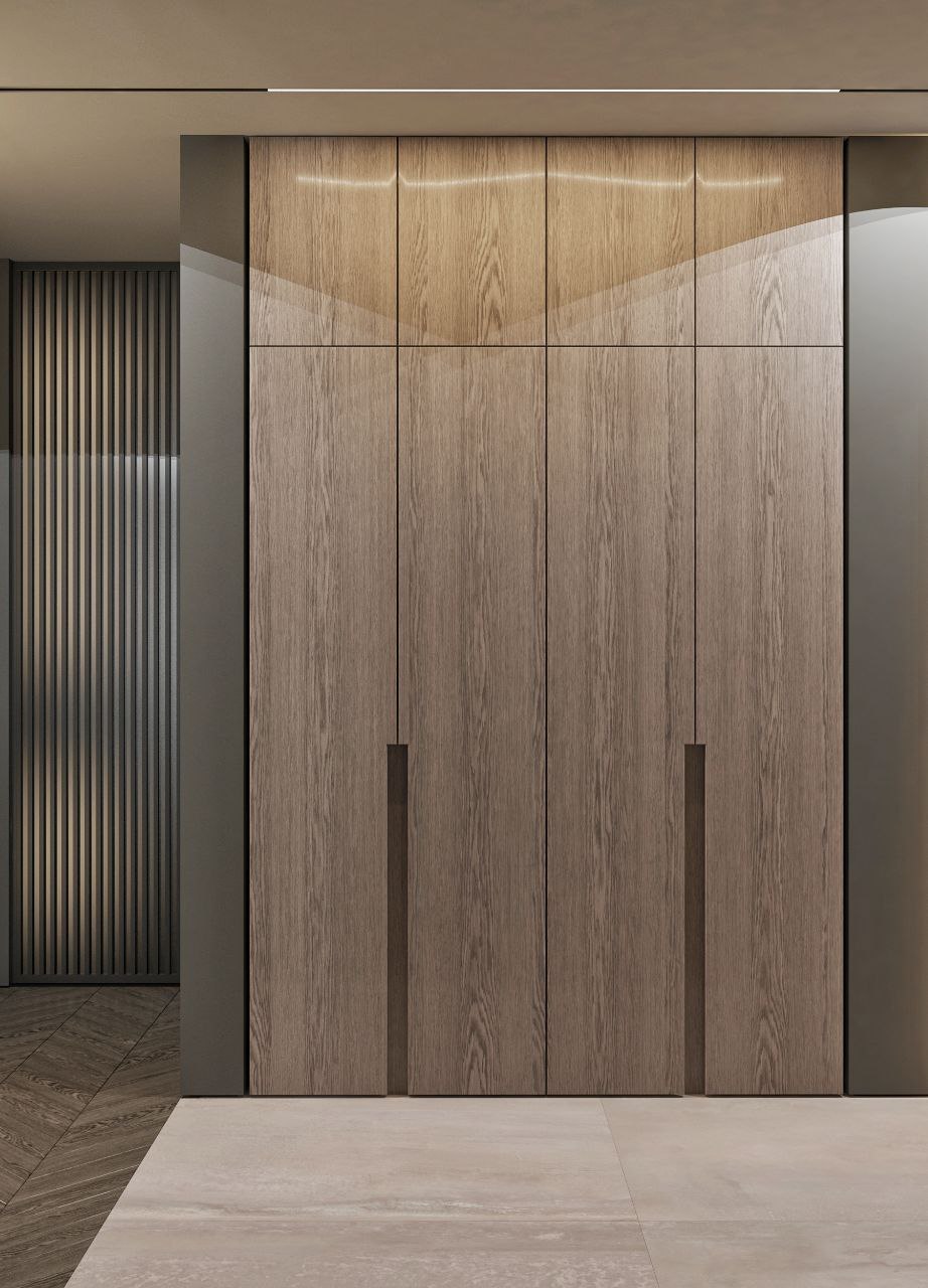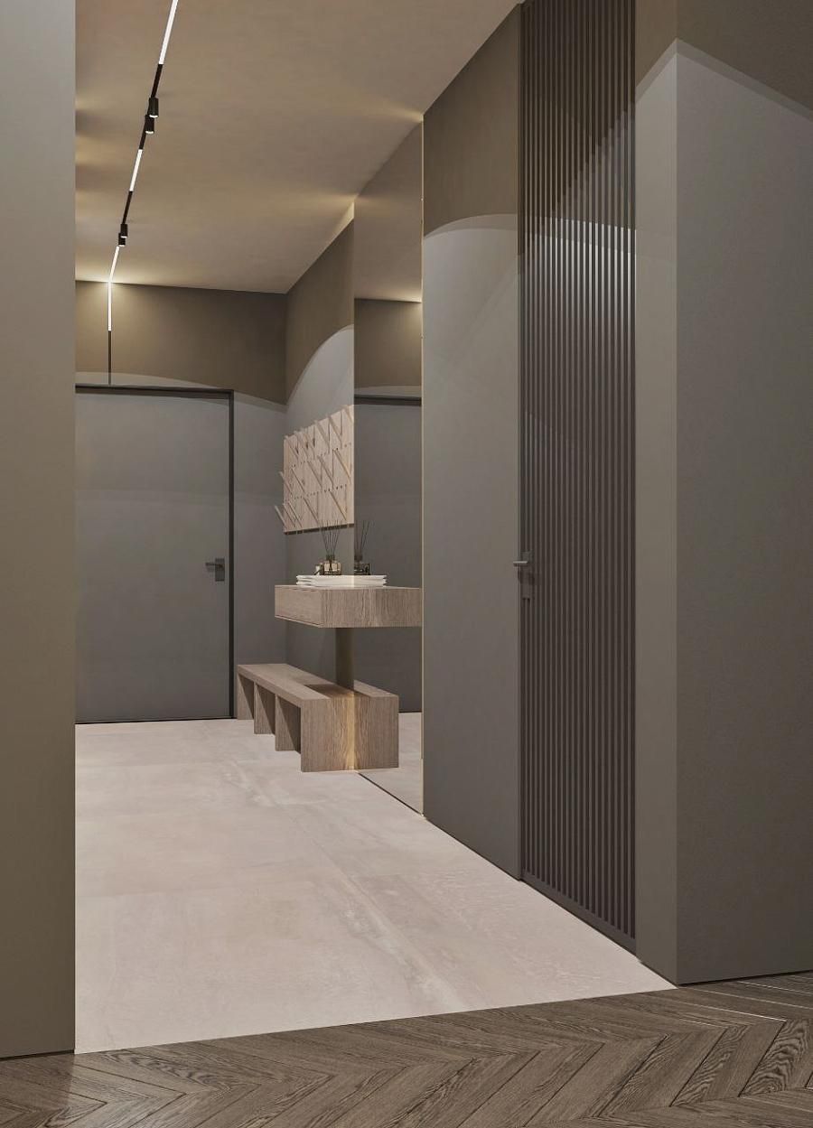 Современный стиль - минимализм гостиной и кухонной зоны. Классические молдинги на стенах гармонично дополняются минималистичной мебелью, создавая элегантный контраст. Мягкий диван с напористыми скругленными формами и акцентной обивкой становится центральным элементом комнаты, обеспечивая комфорт и приглашая к отдыху. Деревянные столики добавляют теплоты и природной текстуры, уравновешивая современные черты интерьера. Освещение, включая латунный подвесной светильник и напольный светильник, обеспечивает как функциональное, так и атмосферное освещение. Обеденная зона с темным столом и черными стульями подчеркивает лаконичность и стиль. В целом, дизайн этой гостиной отражает продуманный подход к созданию уютного и стильного пространства, где каждый элемент способствует созданию гармоничной и привлекательной атмосферы.