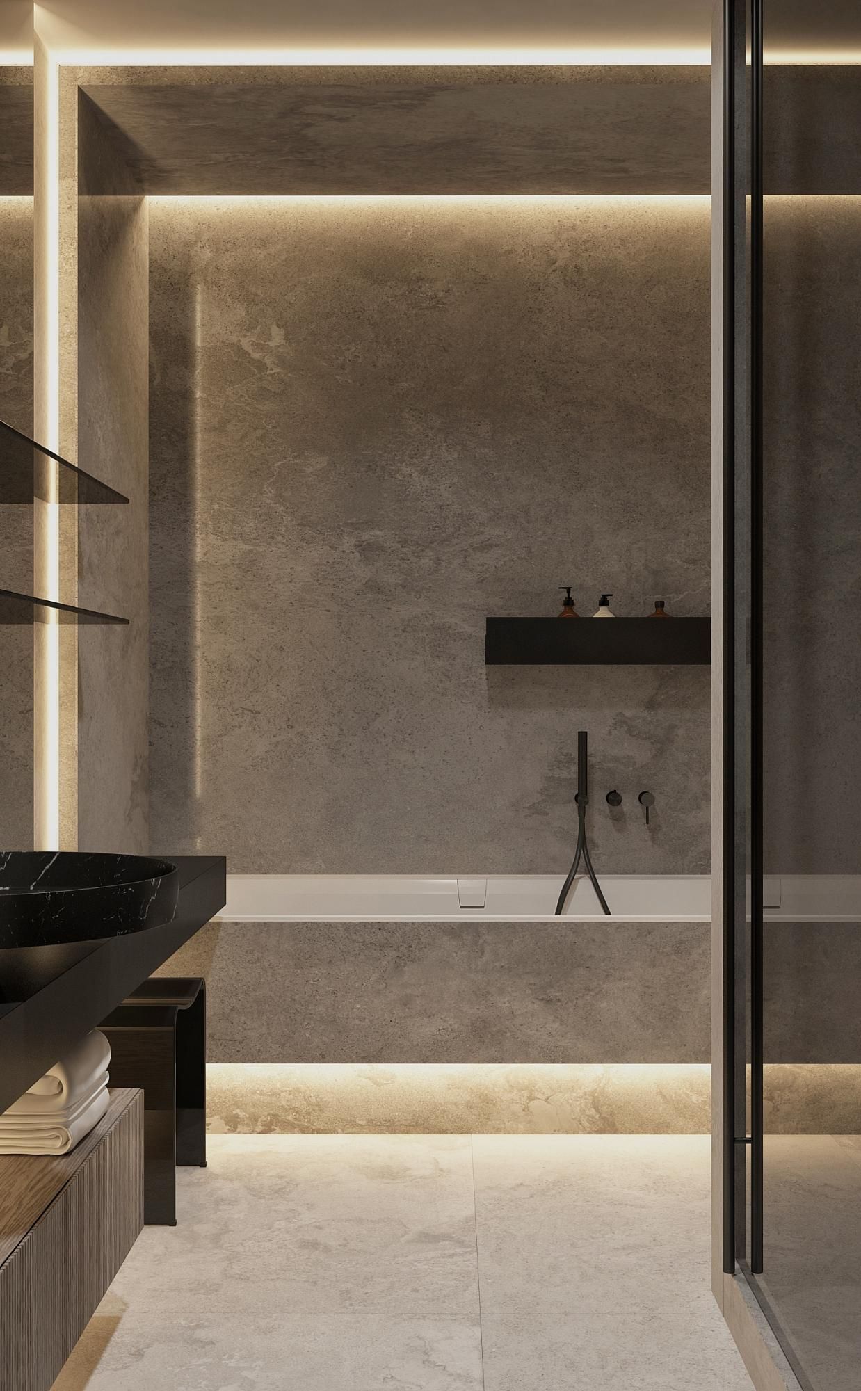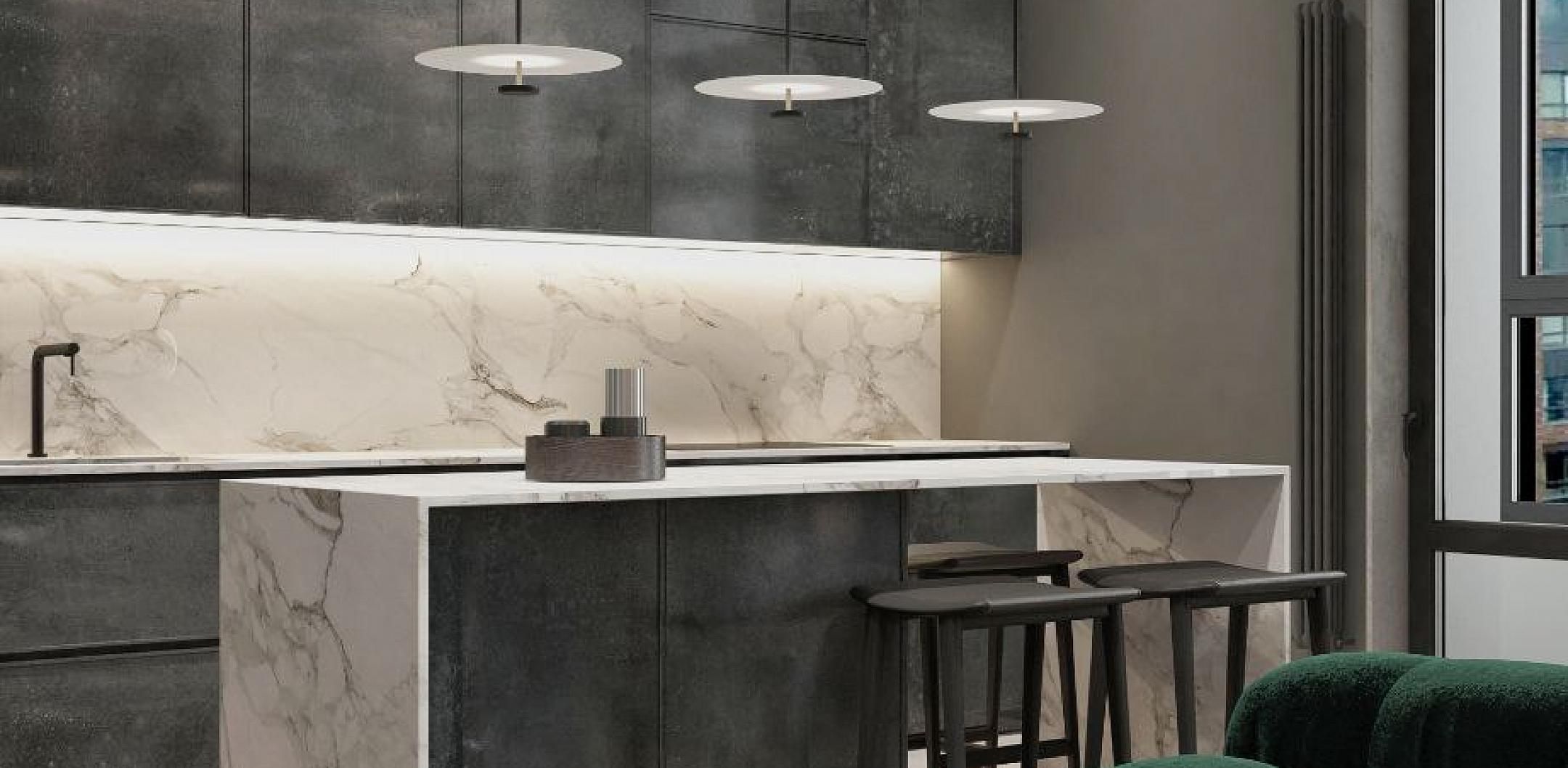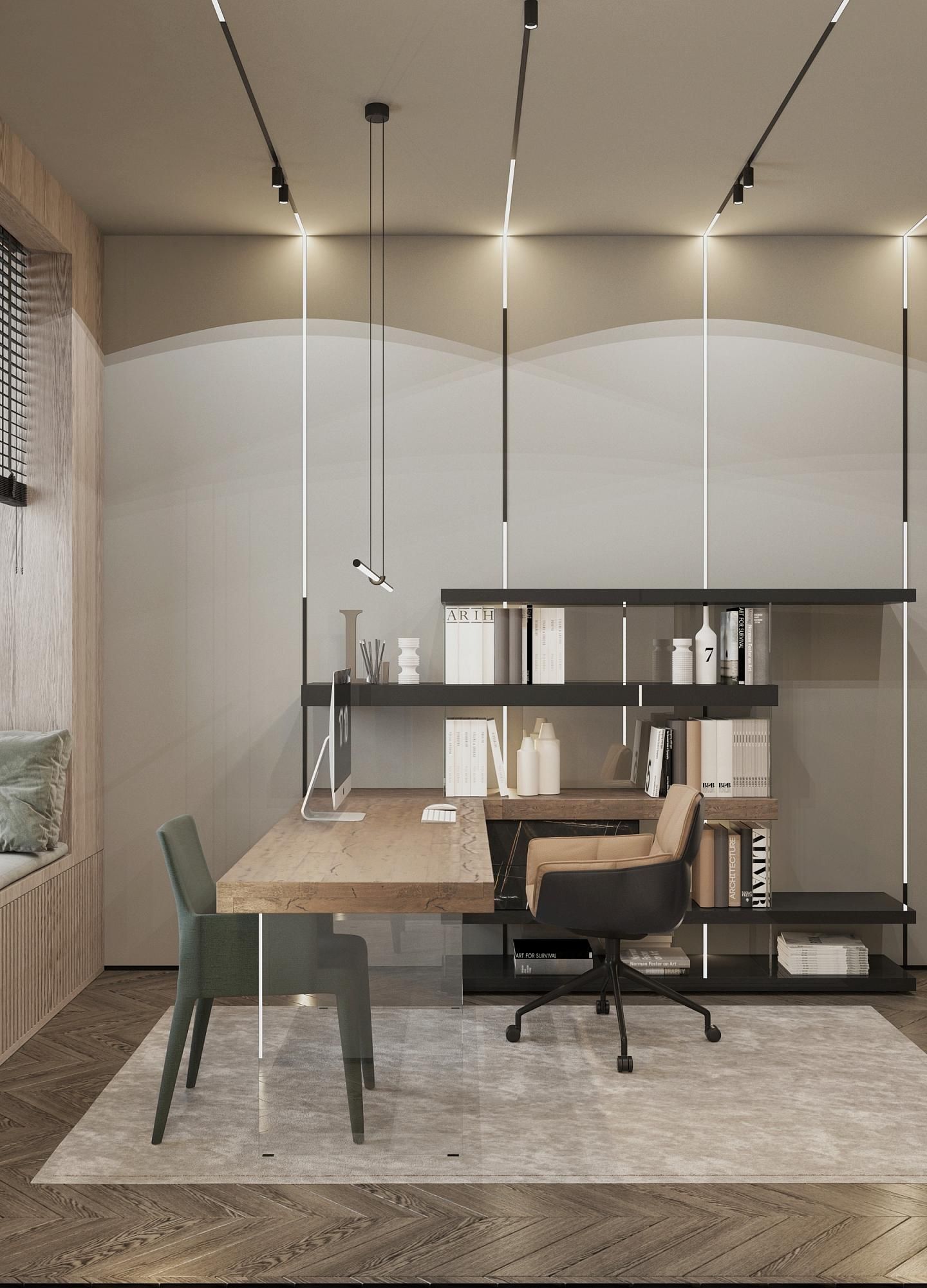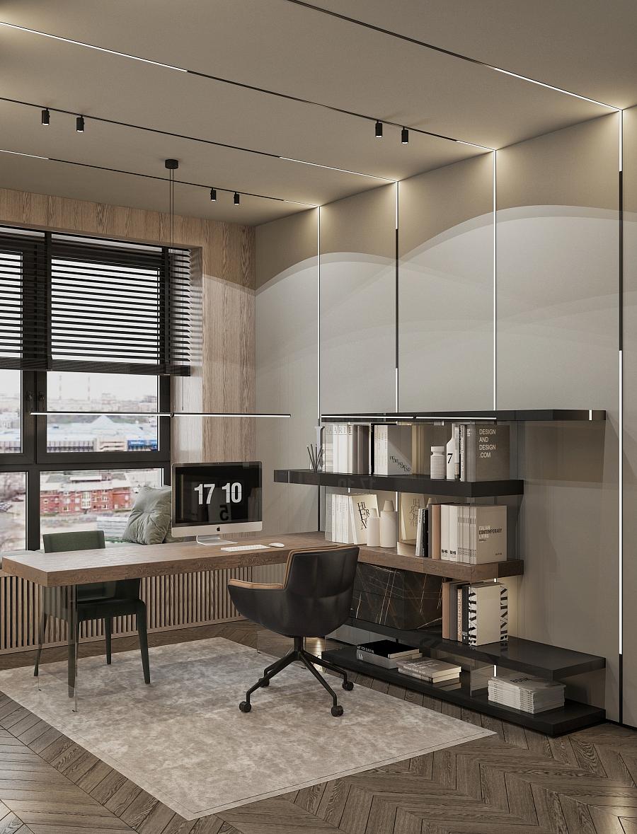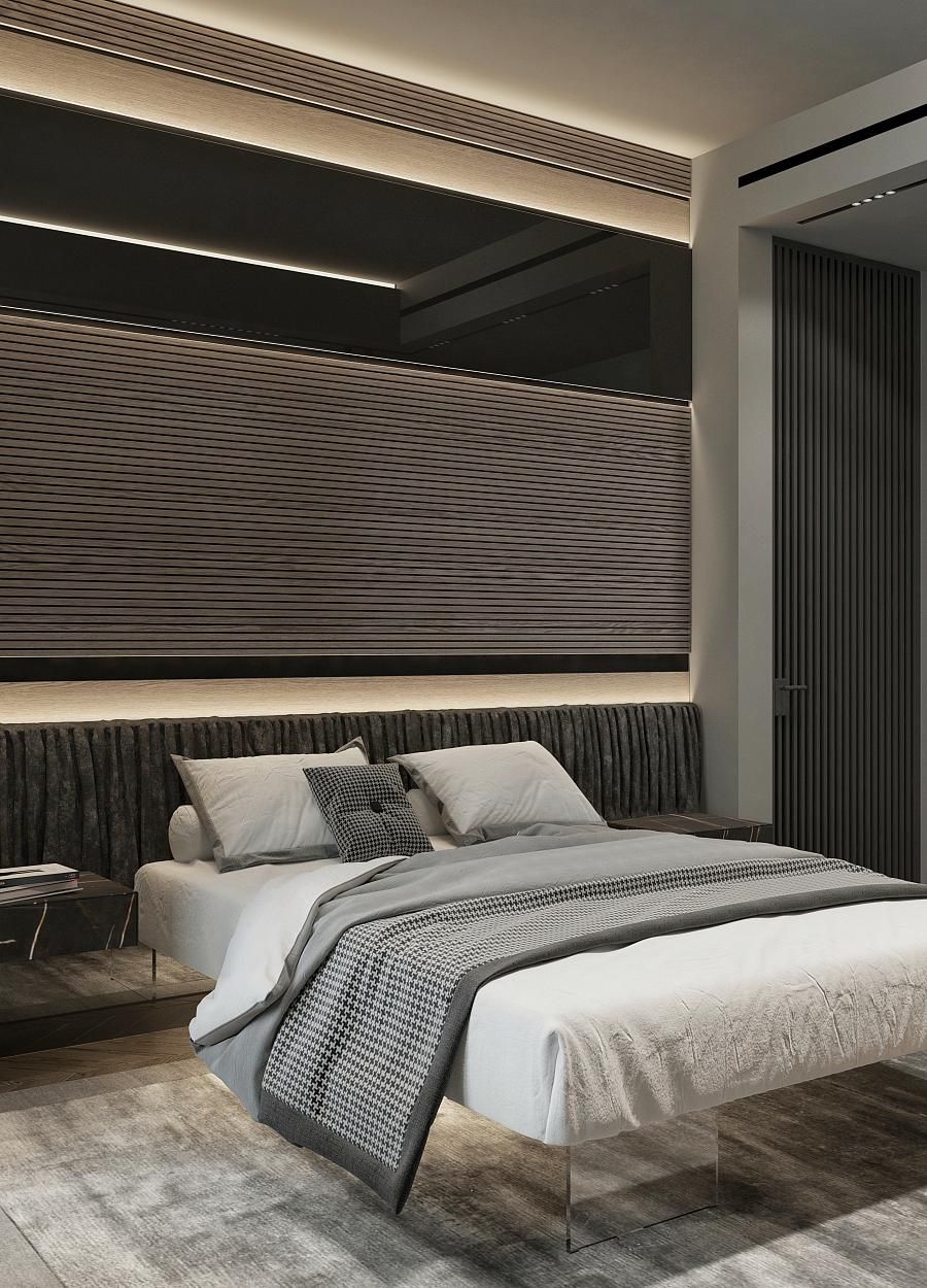 Современный стиль - минимализм гостиной и кухонной зоны. Классические молдинги на стенах гармонично дополняются минималистичной мебелью, создавая элегантный контраст. Мягкий диван с напористыми скругленными формами и акцентной обивкой становится центральным элементом комнаты, обеспечивая комфорт и приглашая к отдыху. Деревянные столики добавляют теплоты и природной текстуры, уравновешивая современные черты интерьера. Освещение, включая латунный подвесной светильник и напольный светильник, обеспечивает как функциональное, так и атмосферное освещение. Обеденная зона с темным столом и черными стульями подчеркивает лаконичность и стиль. В целом, дизайн этой гостиной отражает продуманный подход к созданию уютного и стильного пространства, где каждый элемент способствует созданию гармоничной и привлекательной атмосферы.