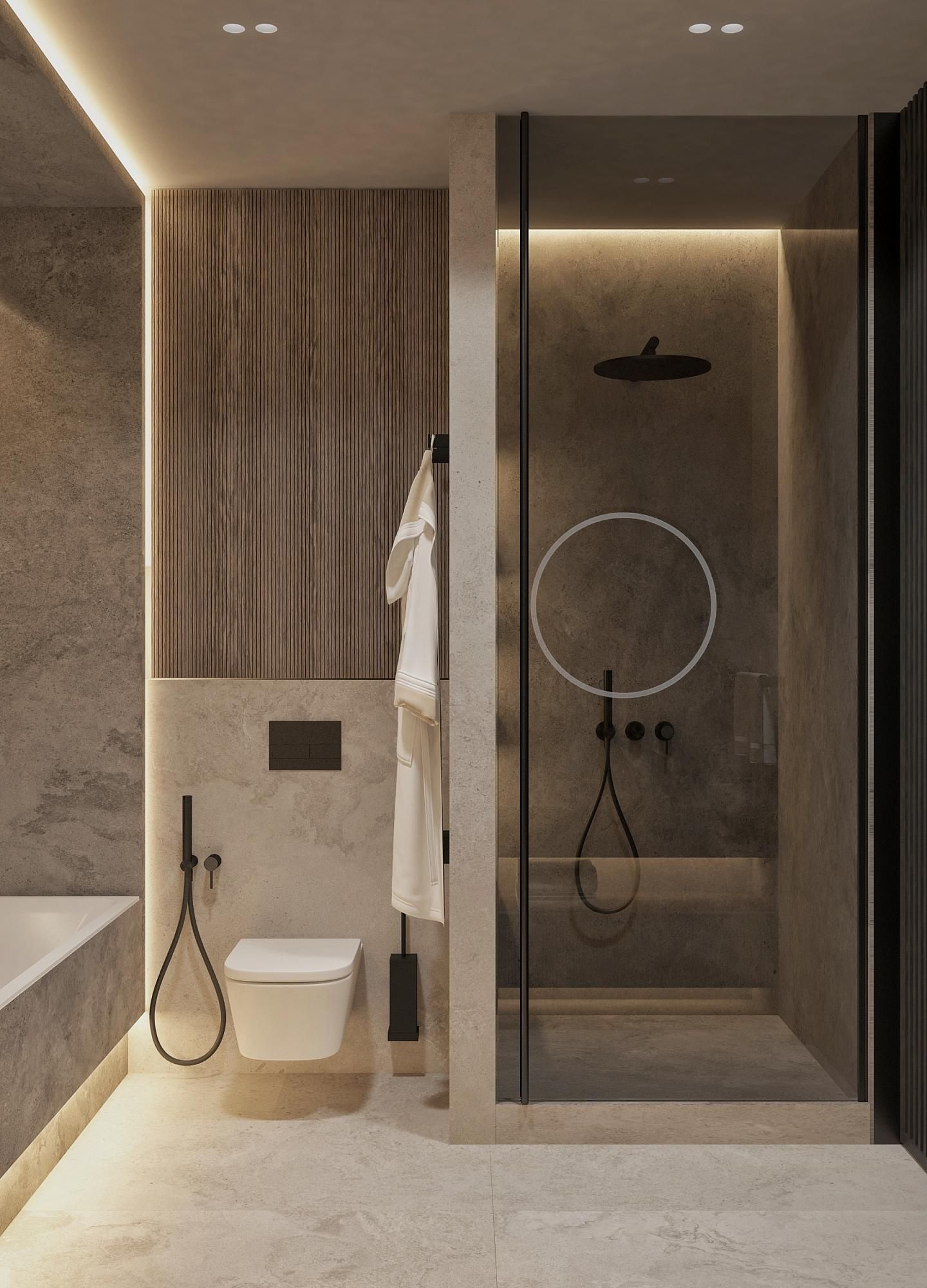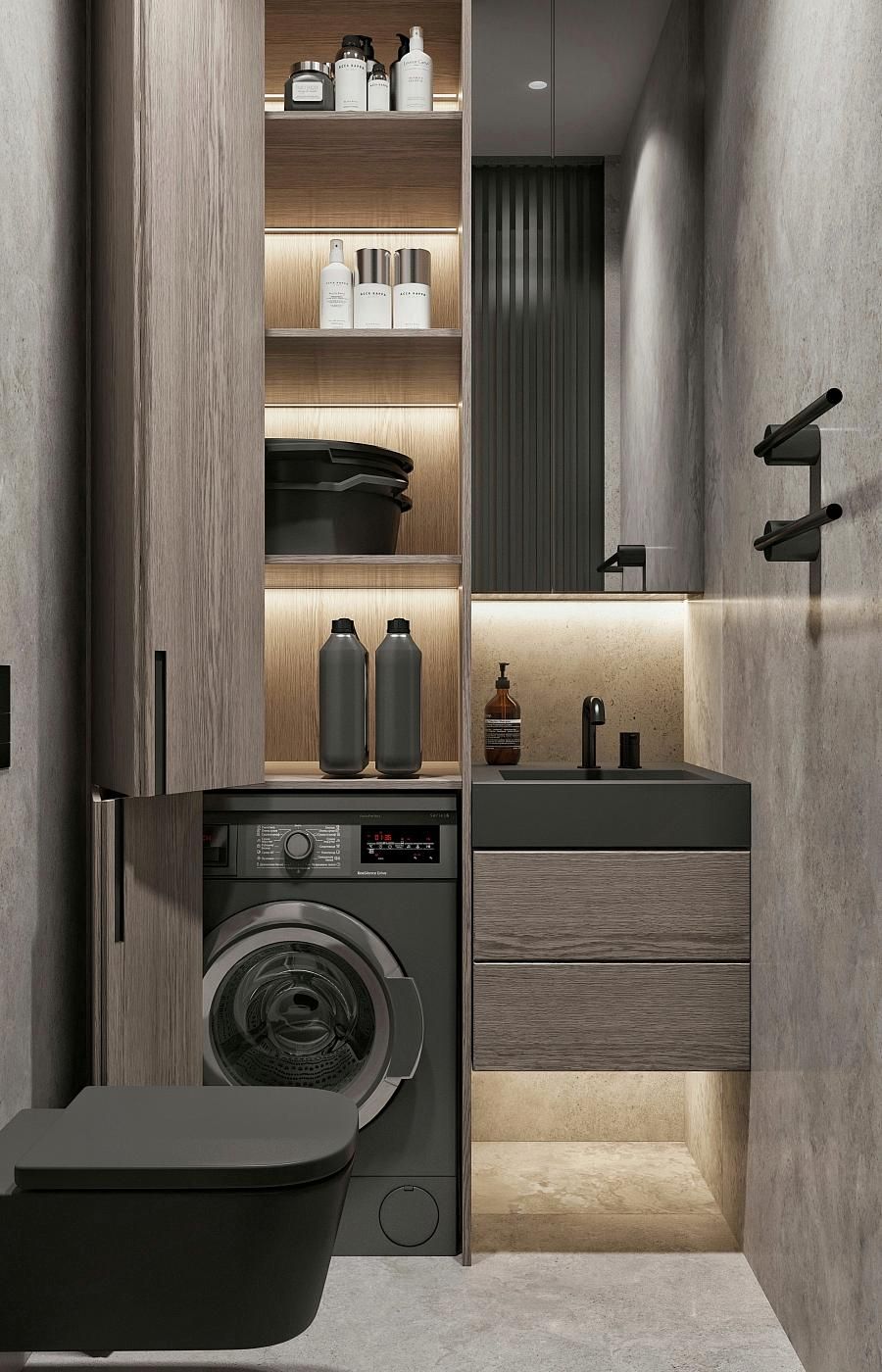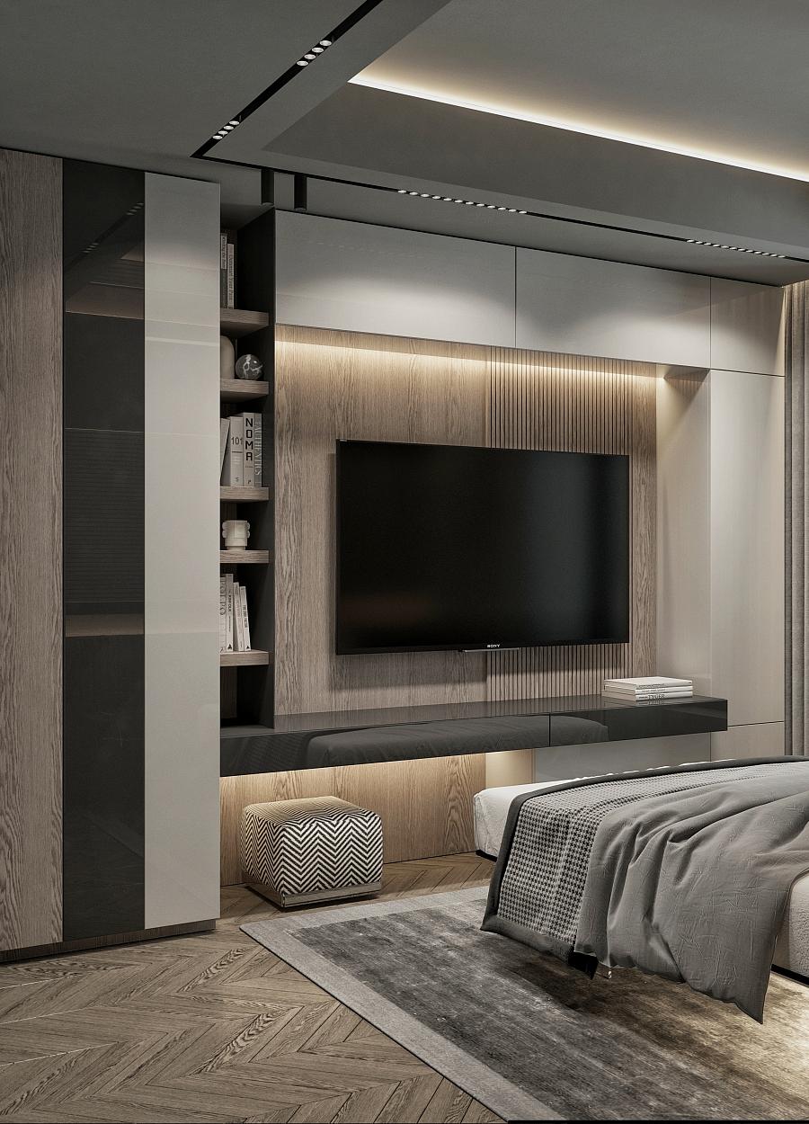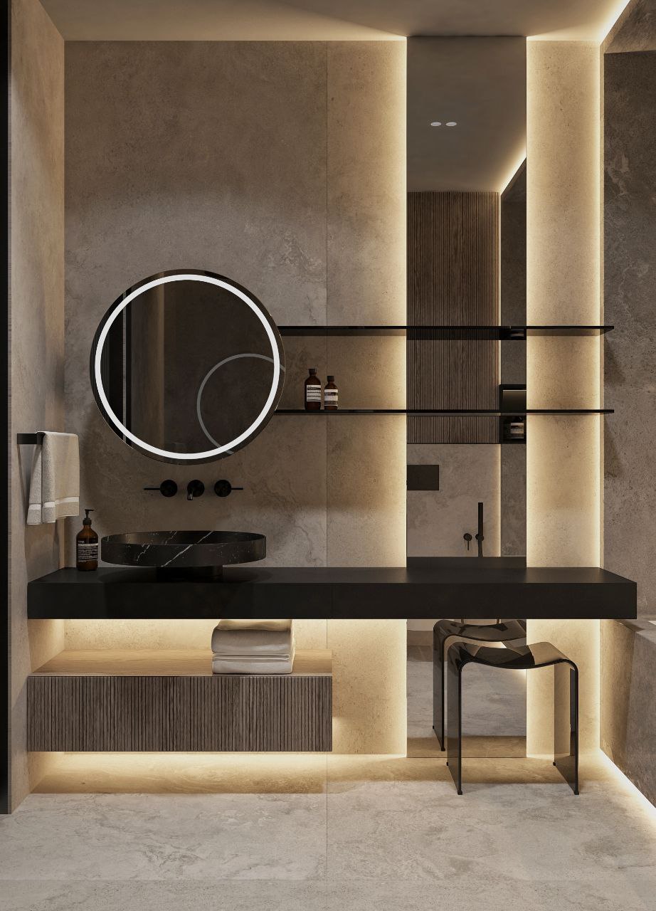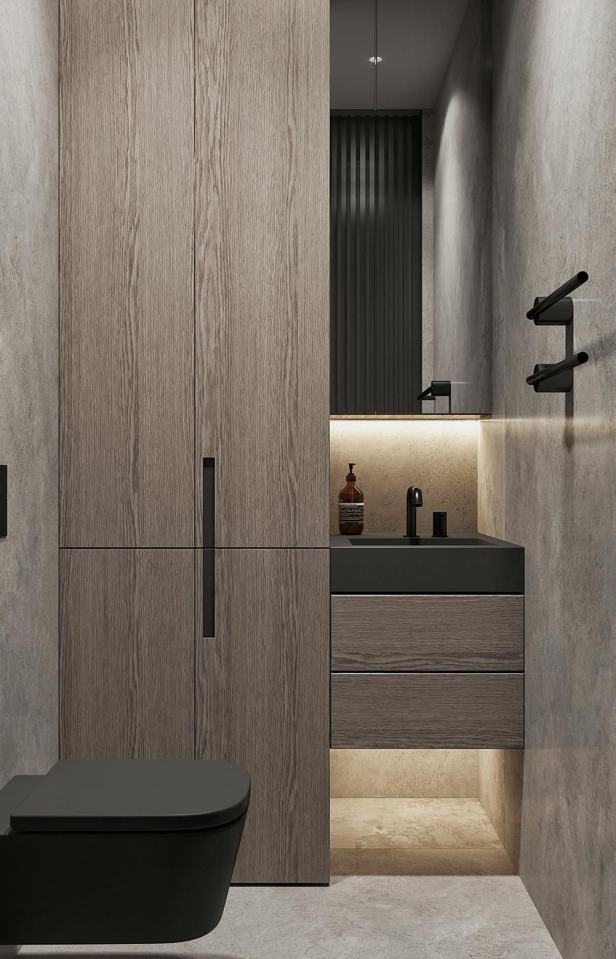 Современный стиль - минимализм гостиной и кухонной зоны. Классические молдинги на стенах гармонично дополняются минималистичной мебелью, создавая элегантный контраст. Мягкий диван с напористыми скругленными формами и акцентной обивкой становится центральным элементом комнаты, обеспечивая комфорт и приглашая к отдыху. Деревянные столики добавляют теплоты и природной текстуры, уравновешивая современные черты интерьера. Освещение, включая латунный подвесной светильник и напольный светильник, обеспечивает как функциональное, так и атмосферное освещение. Обеденная зона с темным столом и черными стульями подчеркивает лаконичность и стиль. В целом, дизайн этой гостиной отражает продуманный подход к созданию уютного и стильного пространства, где каждый элемент способствует созданию гармоничной и привлекательной атмосферы.