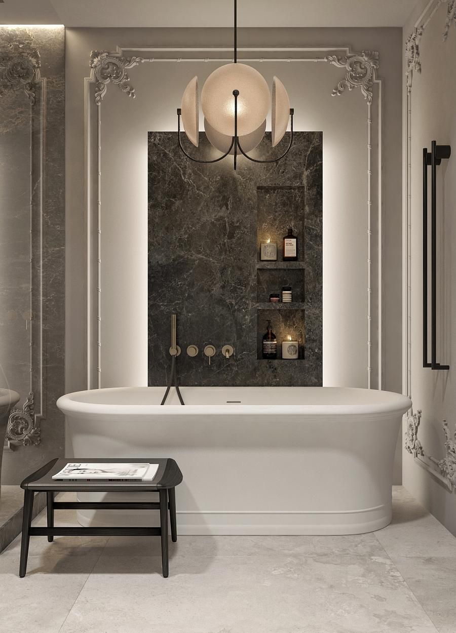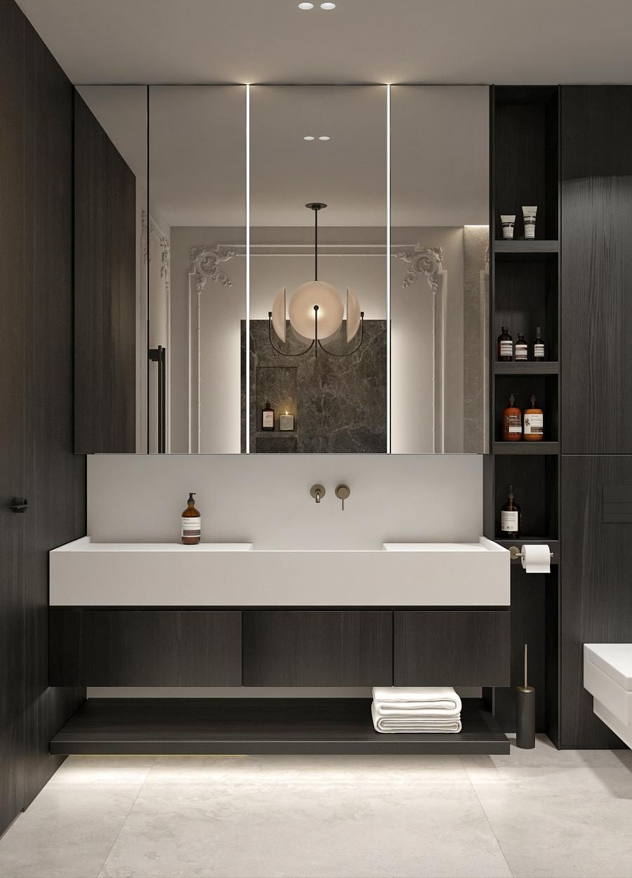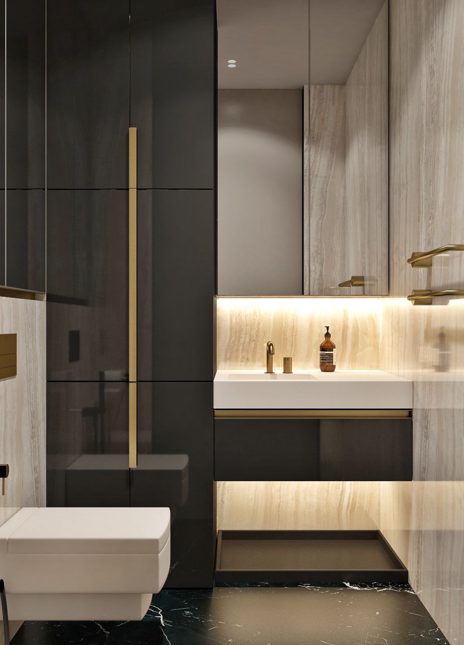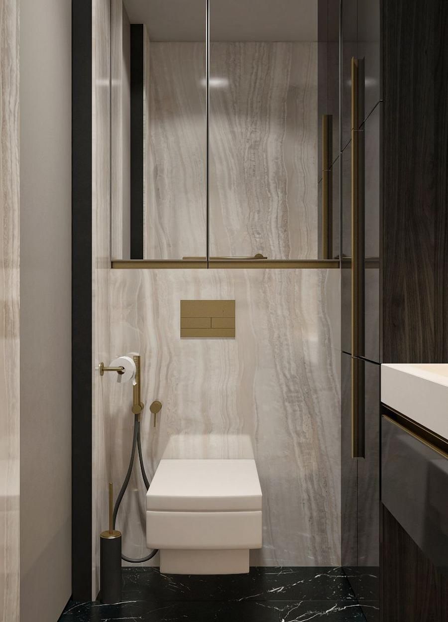 Санузлы в модернистском стиле. При выборе материалов важно не перегрузить пространство, искать гармонию между тяжелыми и легкими текстурами. Мрамор Император и натуральный камень Травертин, используемый в ванных комнатах и на кухне, подчеркивает статус.