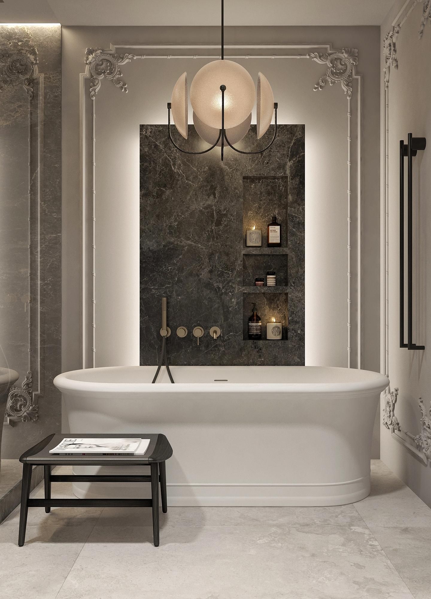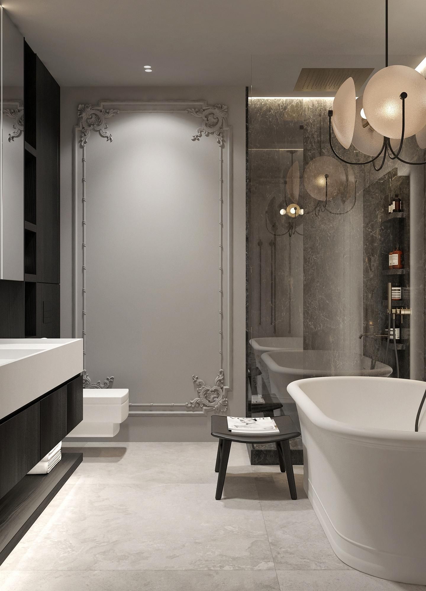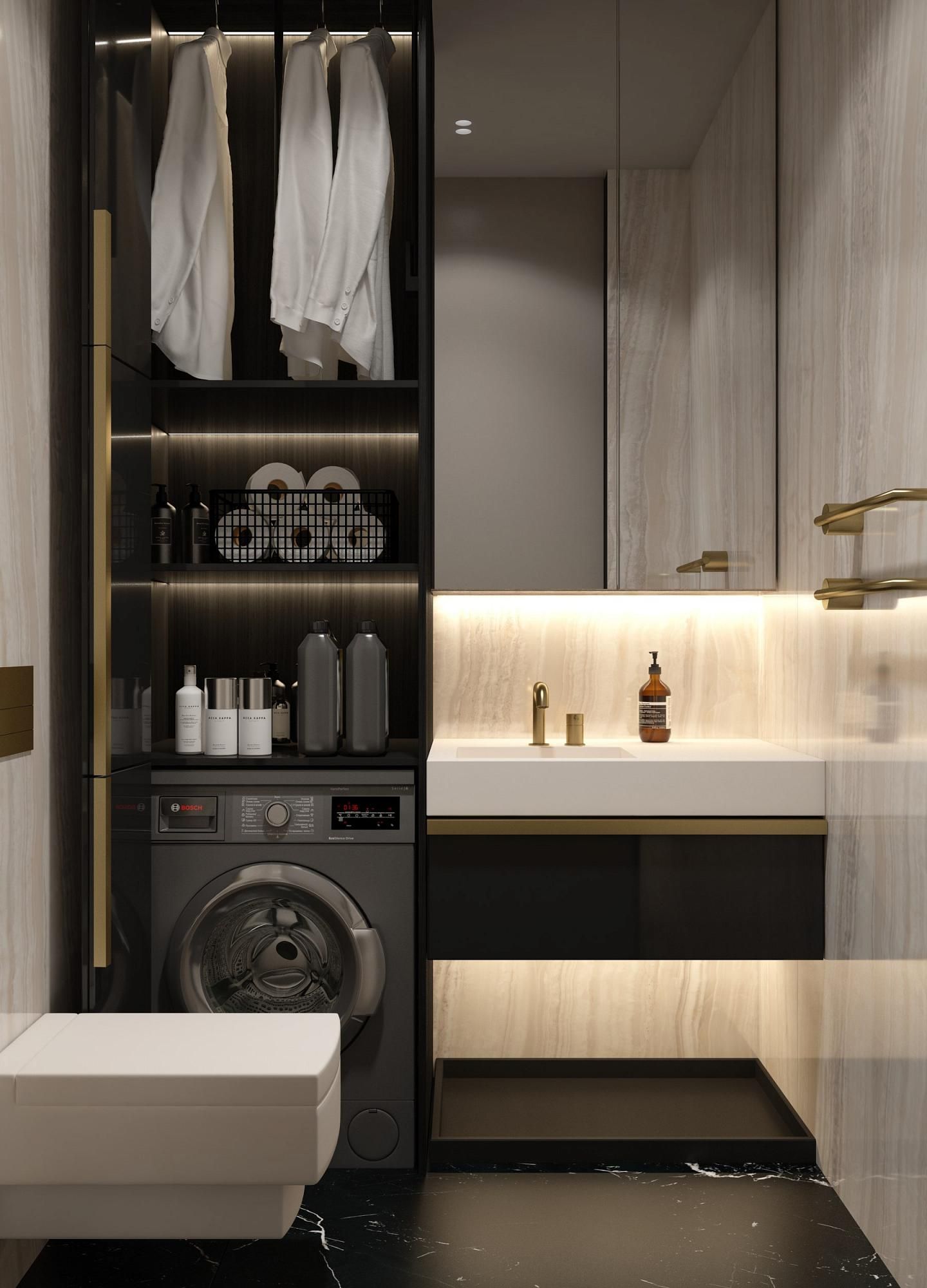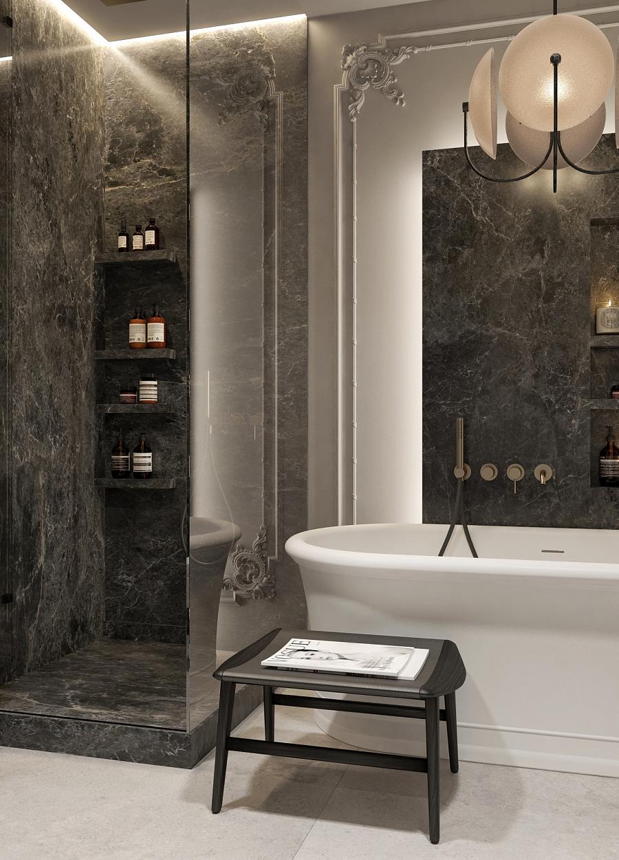 Санузлы в модернистском стиле. При выборе материалов важно не перегрузить пространство, искать гармонию между тяжелыми и легкими текстурами. Мрамор Император и натуральный камень Травертин, используемый в ванных комнатах и на кухне, подчеркивает статус.