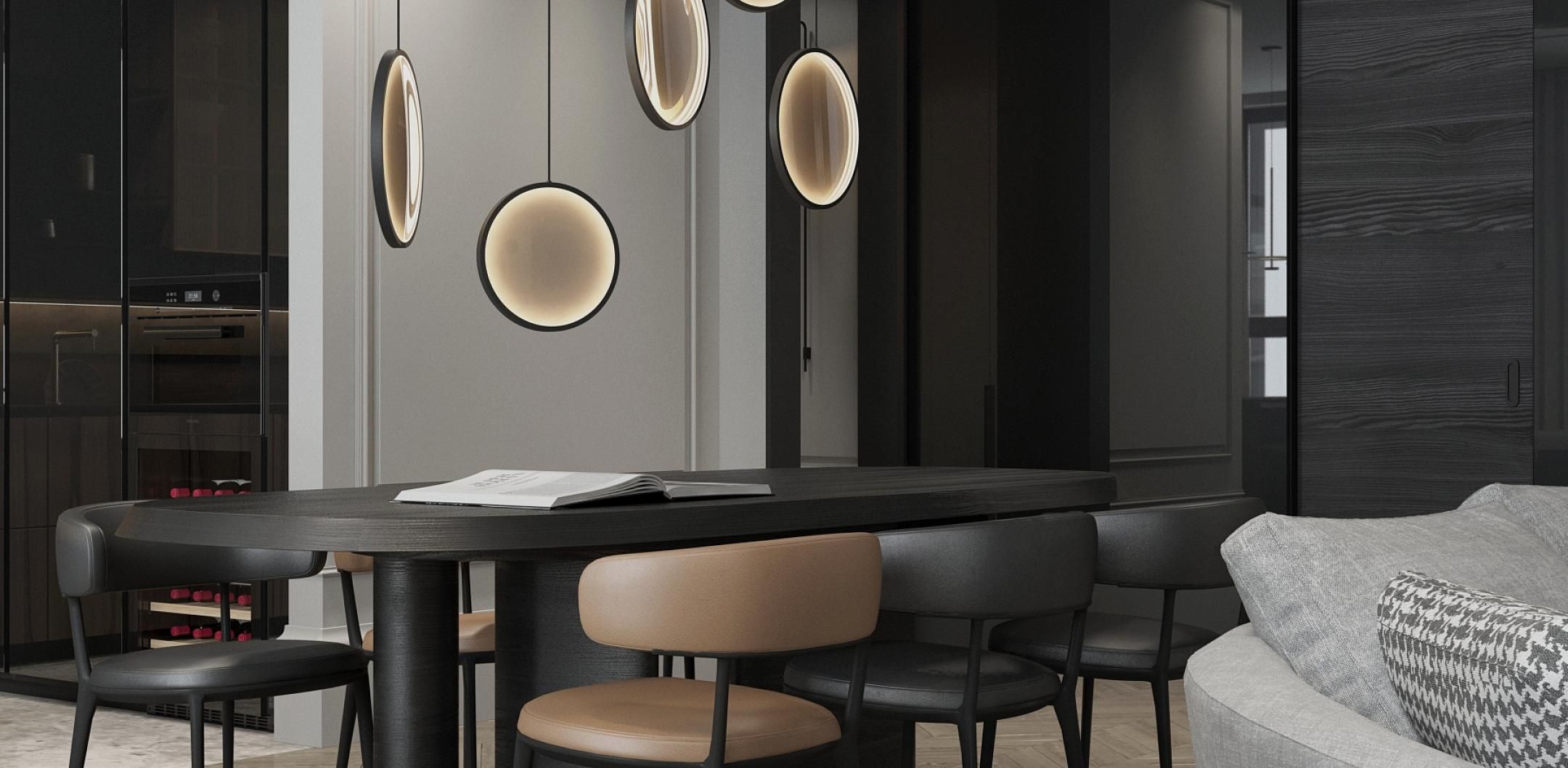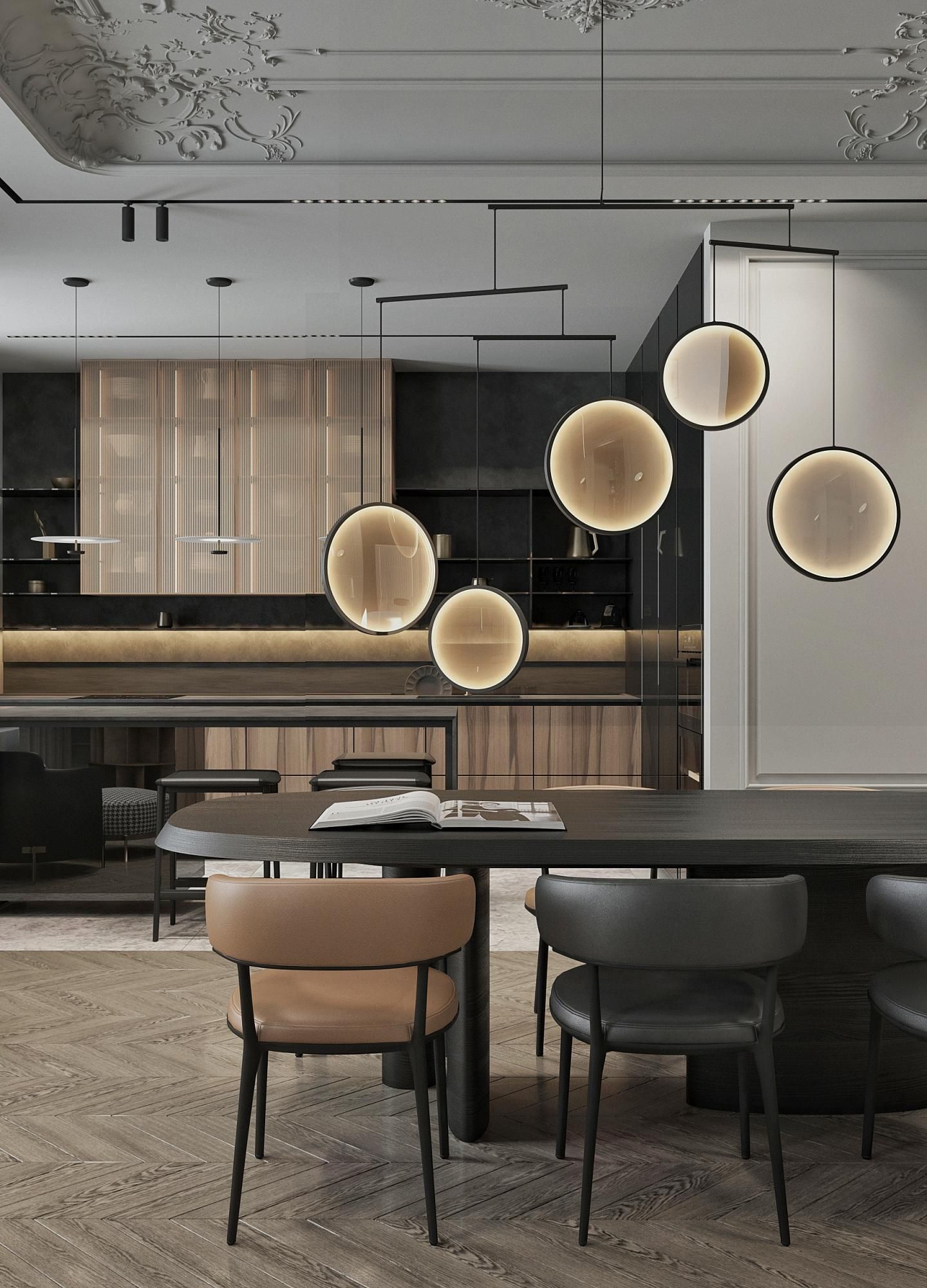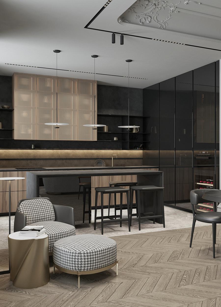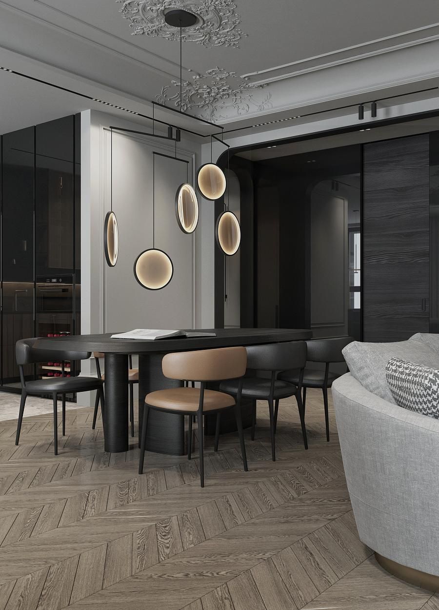 Парижский шик - не проходящая мода на сочетание небрежности и основательности. В этом интерьере премиум-класса гармонично сочетаются историческое наследие и современный дизайн. Лепнина на потолке напоминает о величии прошлого, в то время как современные светильники добавляют пространству теплый свет и уют. Использование натуральных материалов, таких как дерево для мебели и возможно мрамор или гранит для столешниц, подчеркивает статус и качество интерьера. Мебель в этом пространстве сочетает в себе функциональность и эстетику, представляя собой как авторские дизайнерские решения, так и предметы из премиального сегмента. Черные тона кухонной мебели контрастируют с теплыми оттенками деревянного стола и стульев, создавая изысканный и сбалансированный образ.