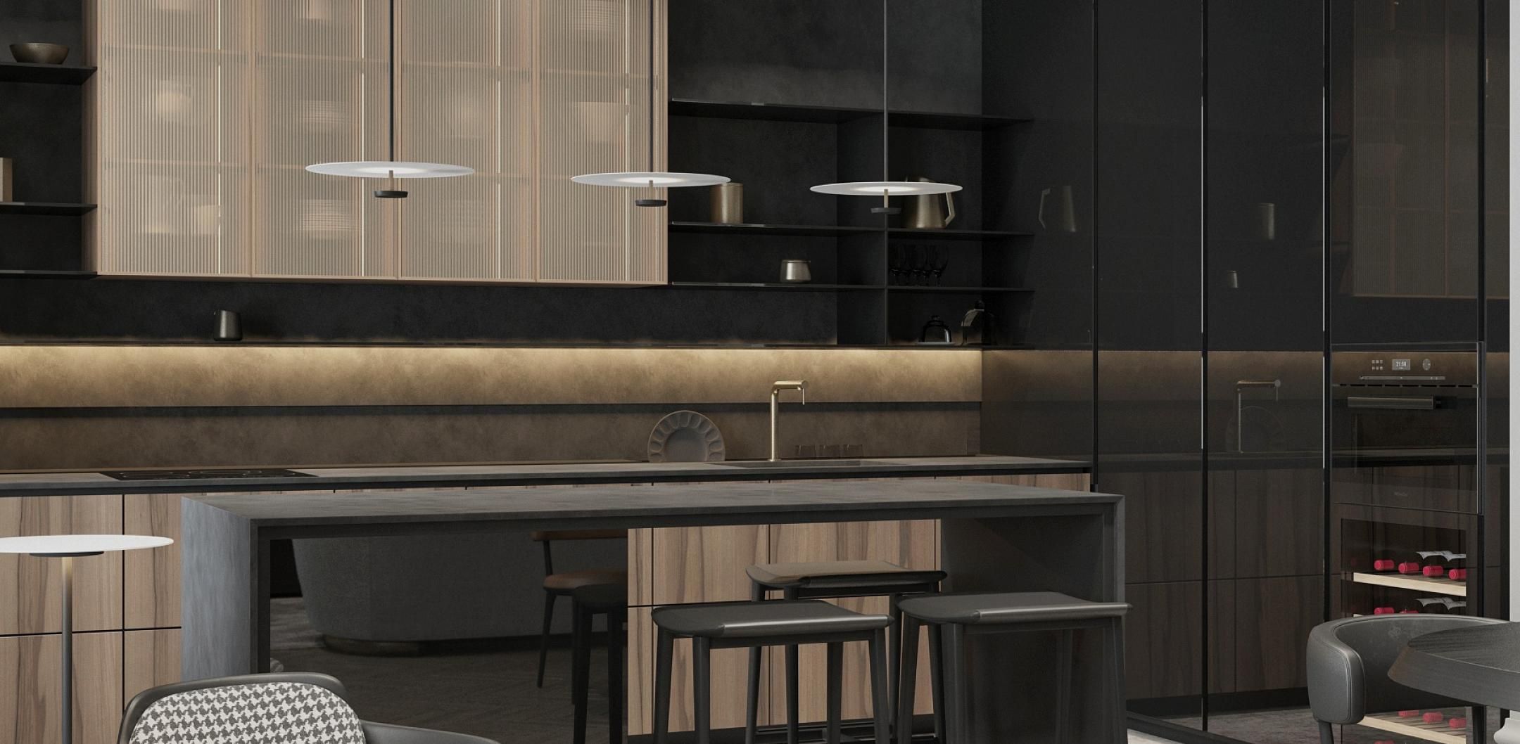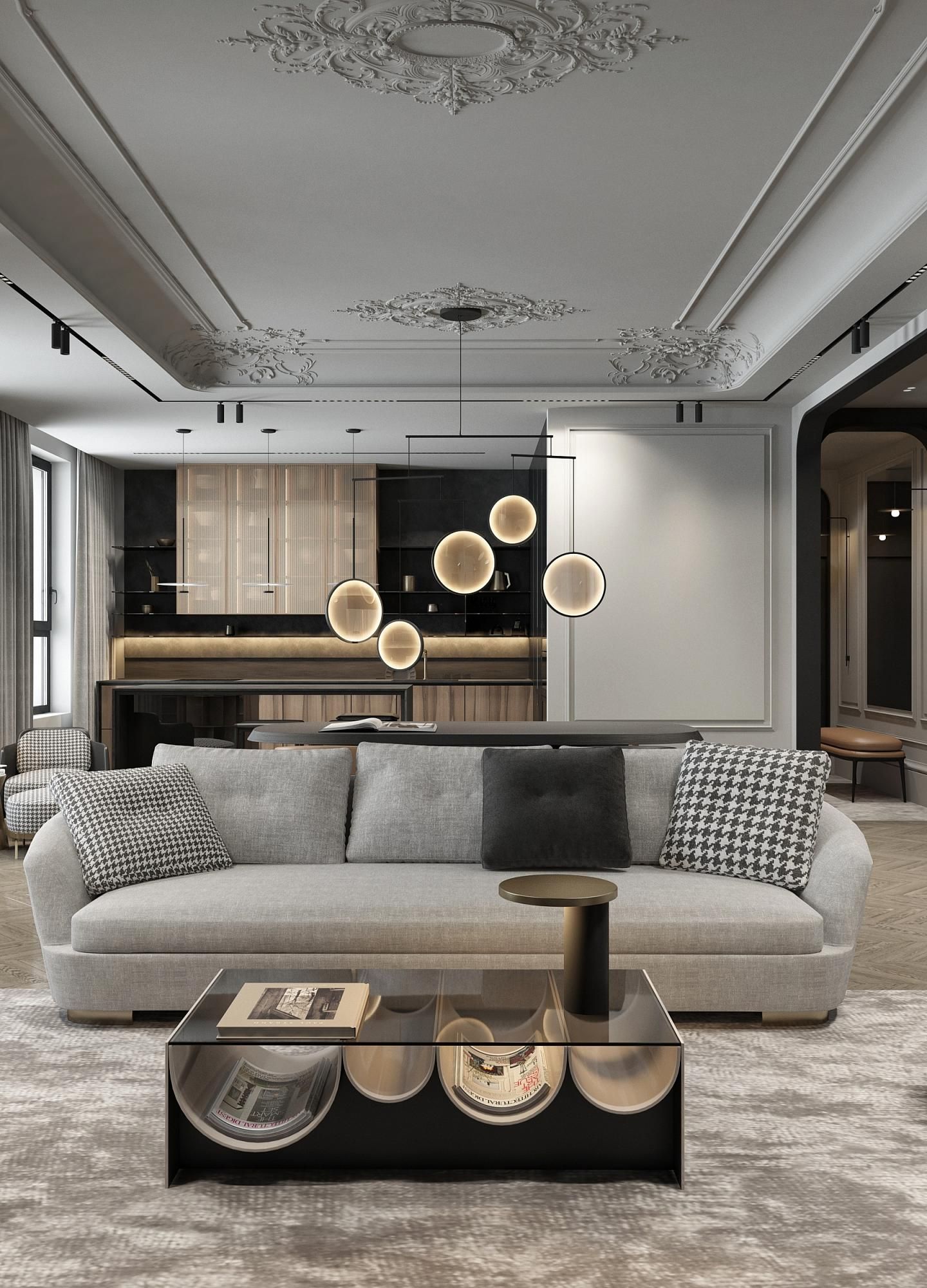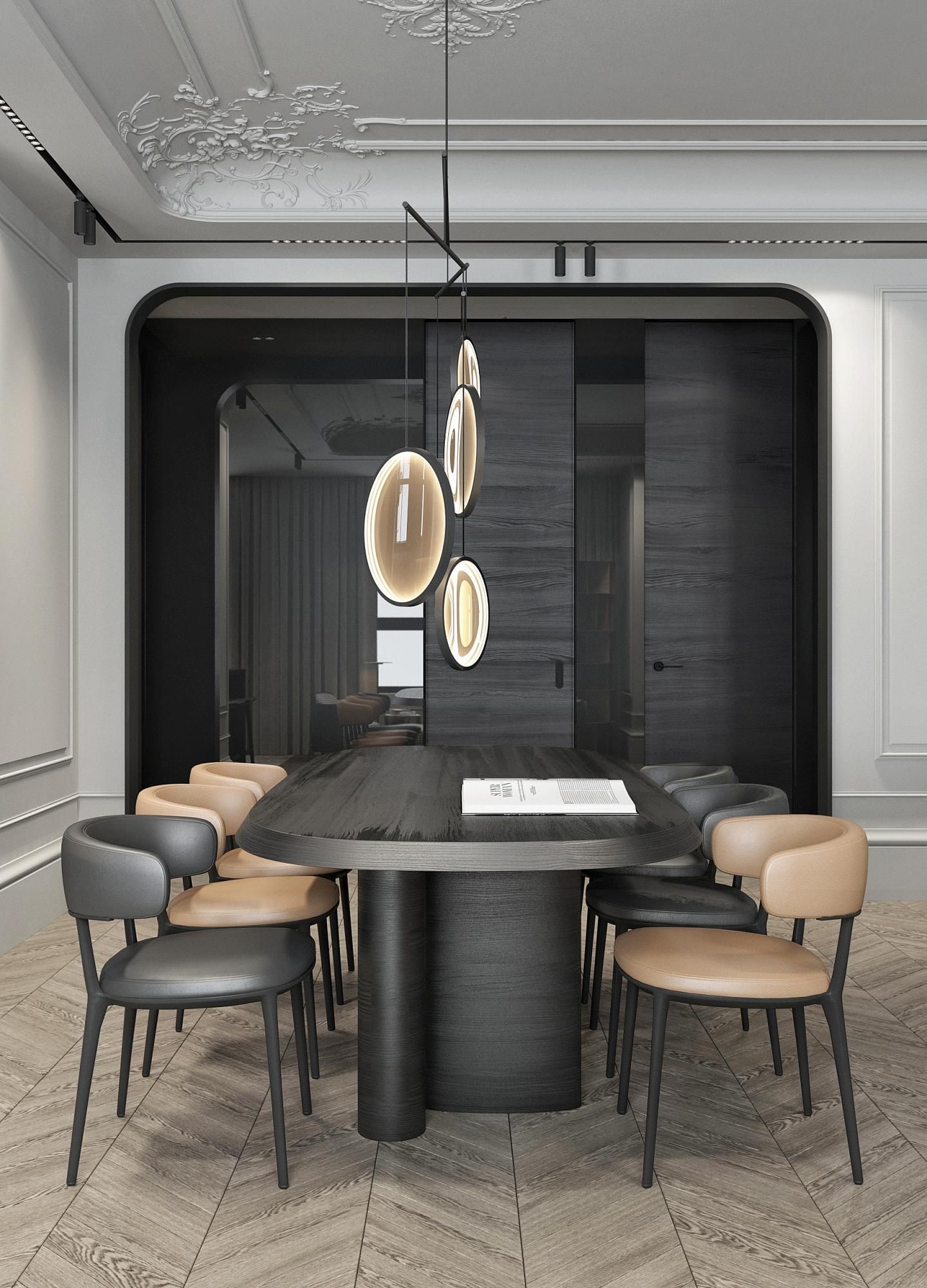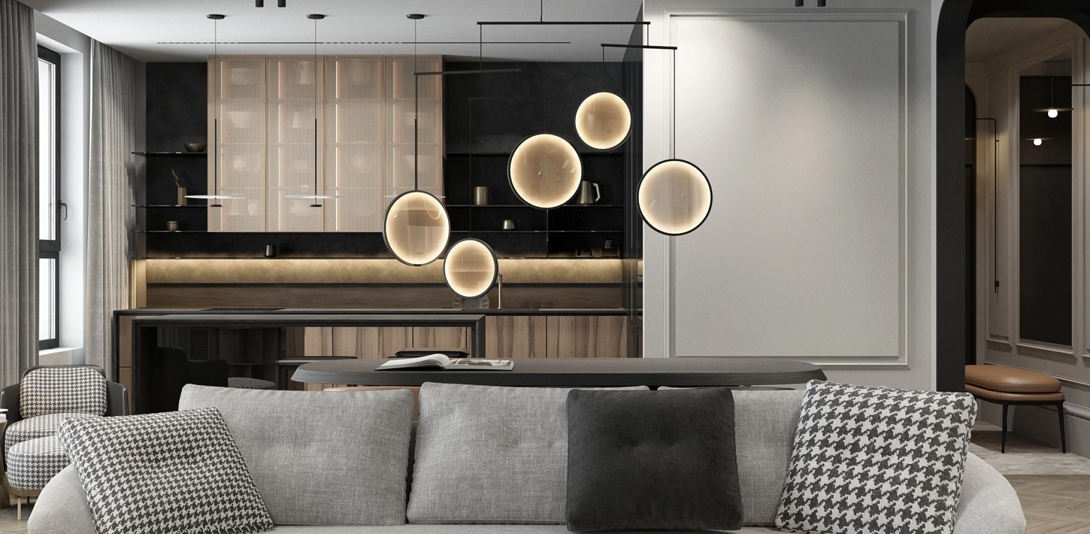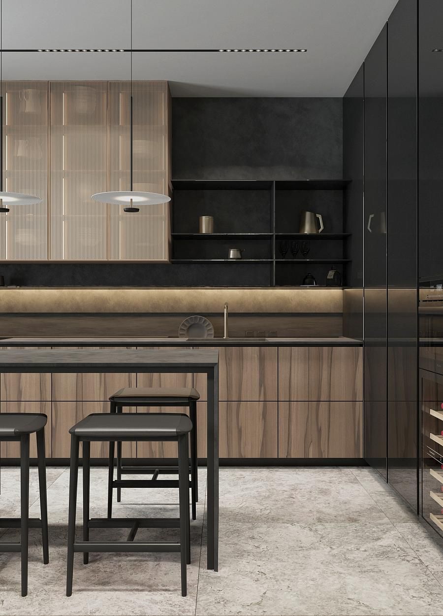 Парижский шик - не проходящая мода на сочетание небрежности и основательности. В этом интерьере премиум-класса гармонично сочетаются историческое наследие и современный дизайн. Лепнина на потолке напоминает о величии прошлого, в то время как современные светильники добавляют пространству теплый свет и уют. Использование натуральных материалов, таких как дерево для мебели и возможно мрамор или гранит для столешниц, подчеркивает статус и качество интерьера. Мебель в этом пространстве сочетает в себе функциональность и эстетику, представляя собой как авторские дизайнерские решения, так и предметы из премиального сегмента. Черные тона кухонной мебели контрастируют с теплыми оттенками деревянного стола и стульев, создавая изысканный и сбалансированный образ.