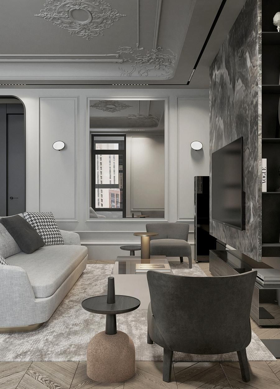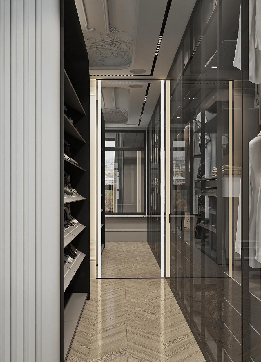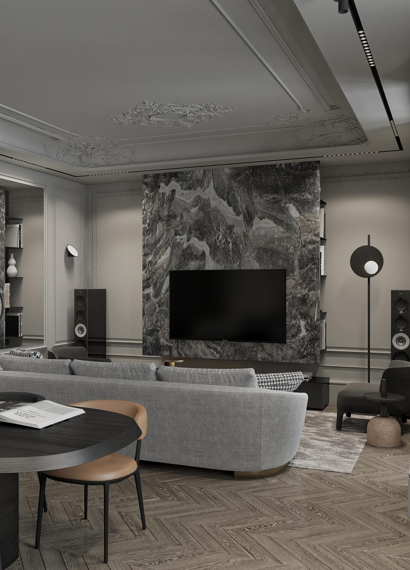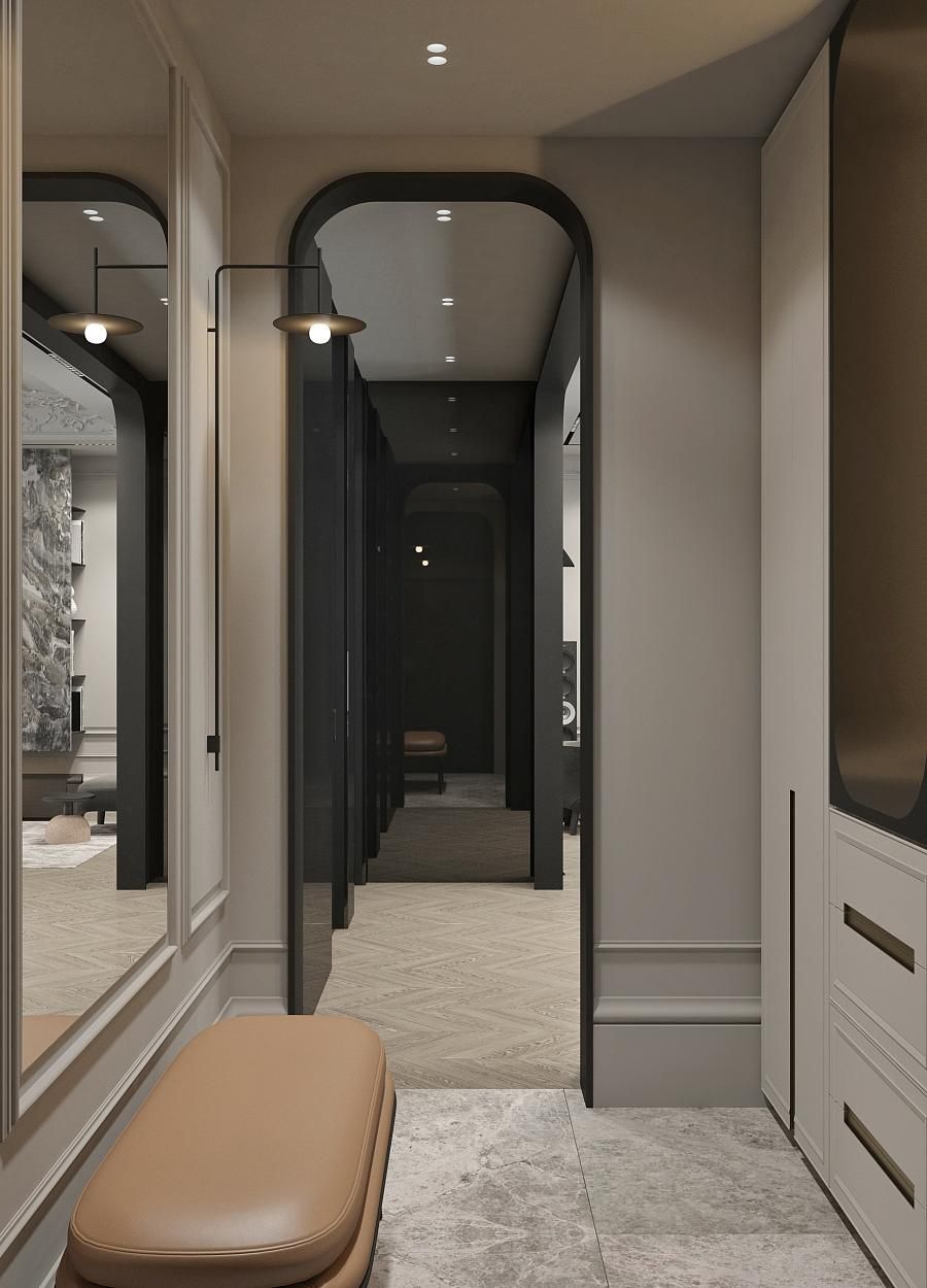 Парижский шик - не проходящая мода на сочетание небрежности и основательности. В этом интерьере премиум-класса гармонично сочетаются историческое наследие и современный дизайн. Лепнина на потолке напоминает о величии прошлого, в то время как современные светильники добавляют пространству теплый свет и уют. Использование натуральных материалов, таких как дерево для мебели и возможно мрамор или гранит для столешниц, подчеркивает статус и качество интерьера. Мебель в этом пространстве сочетает в себе функциональность и эстетику, представляя собой как авторские дизайнерские решения, так и предметы из премиального сегмента. Черные тона кухонной мебели контрастируют с теплыми оттенками деревянного стола и стульев, создавая изысканный и сбалансированный образ.