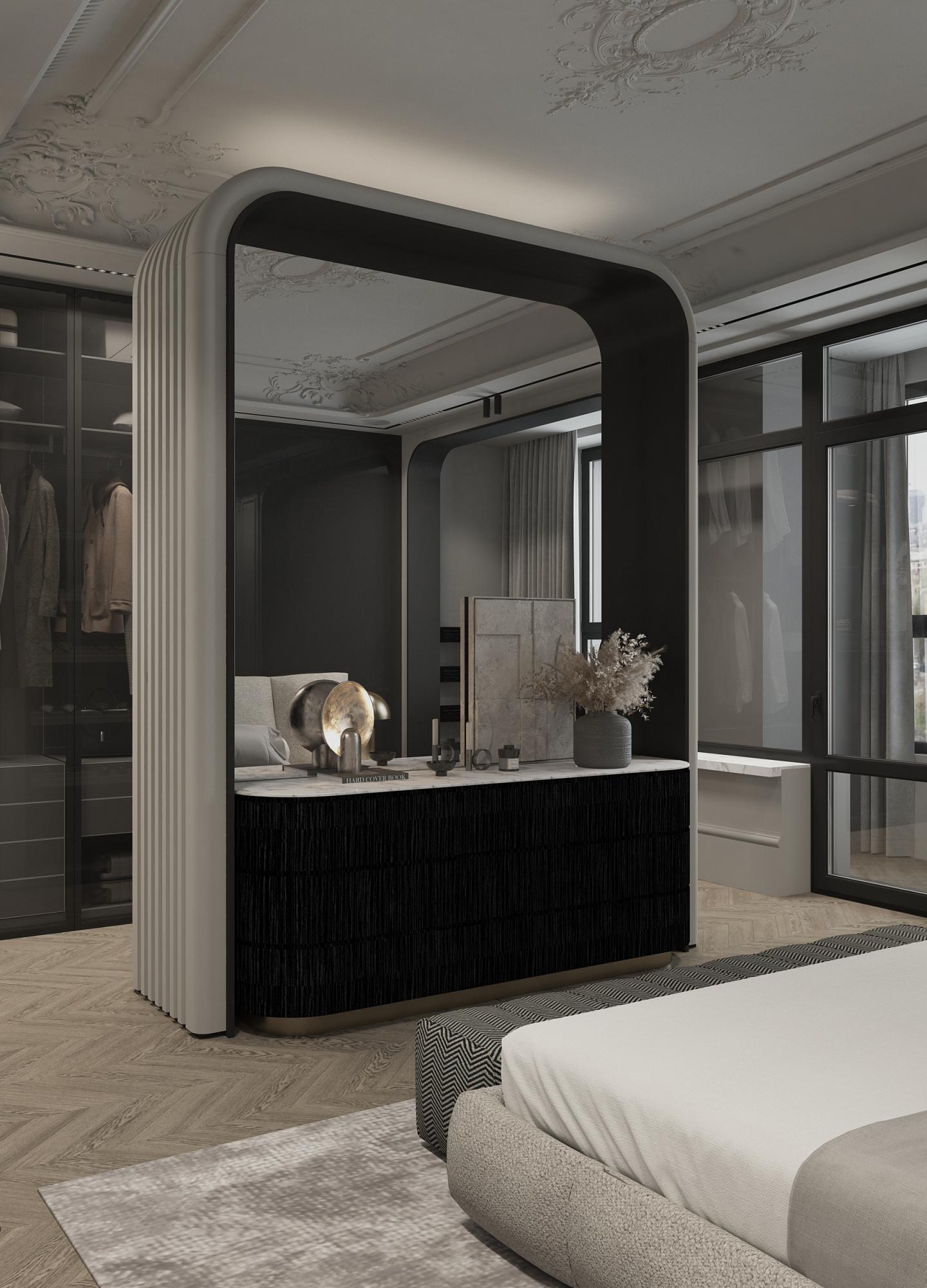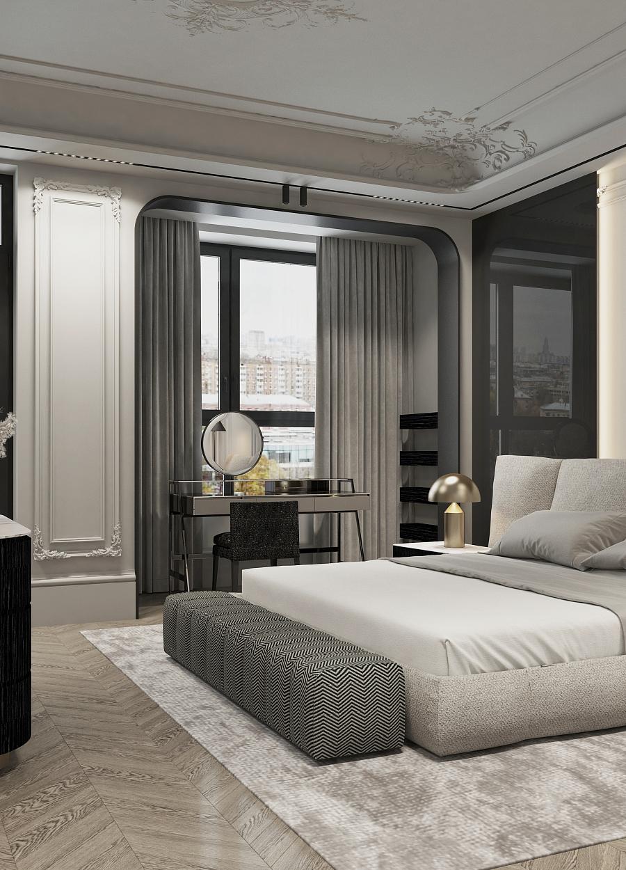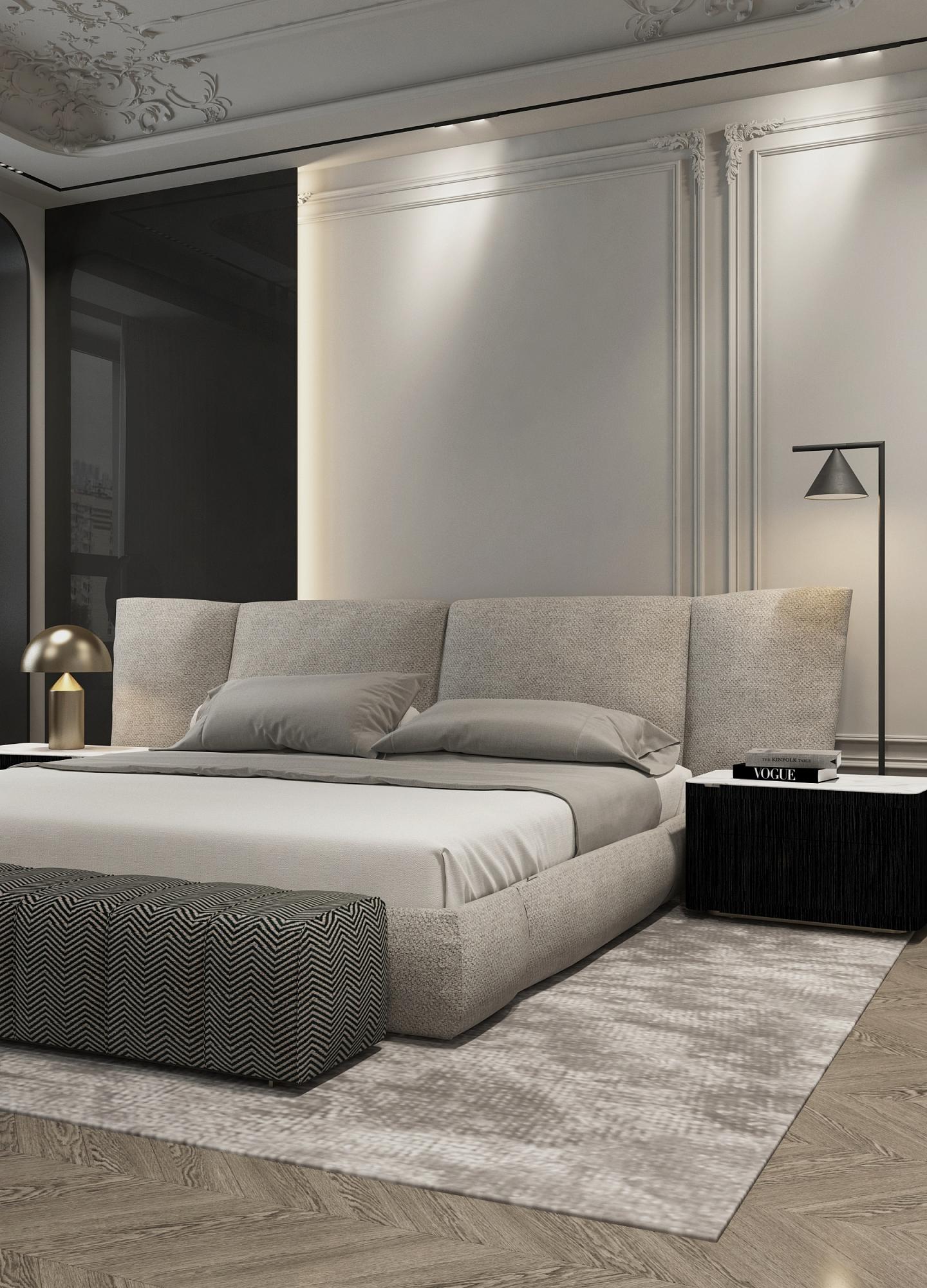 Дизайн спальной комнаты в парижском стиле. Освещение играет ключевую роль, создавая атмосферу и подчеркивая качество используемых материалов. Плавные линии светильников и их мягкий свет придают интерьеру ощущение спокойствия и расслабленности.
