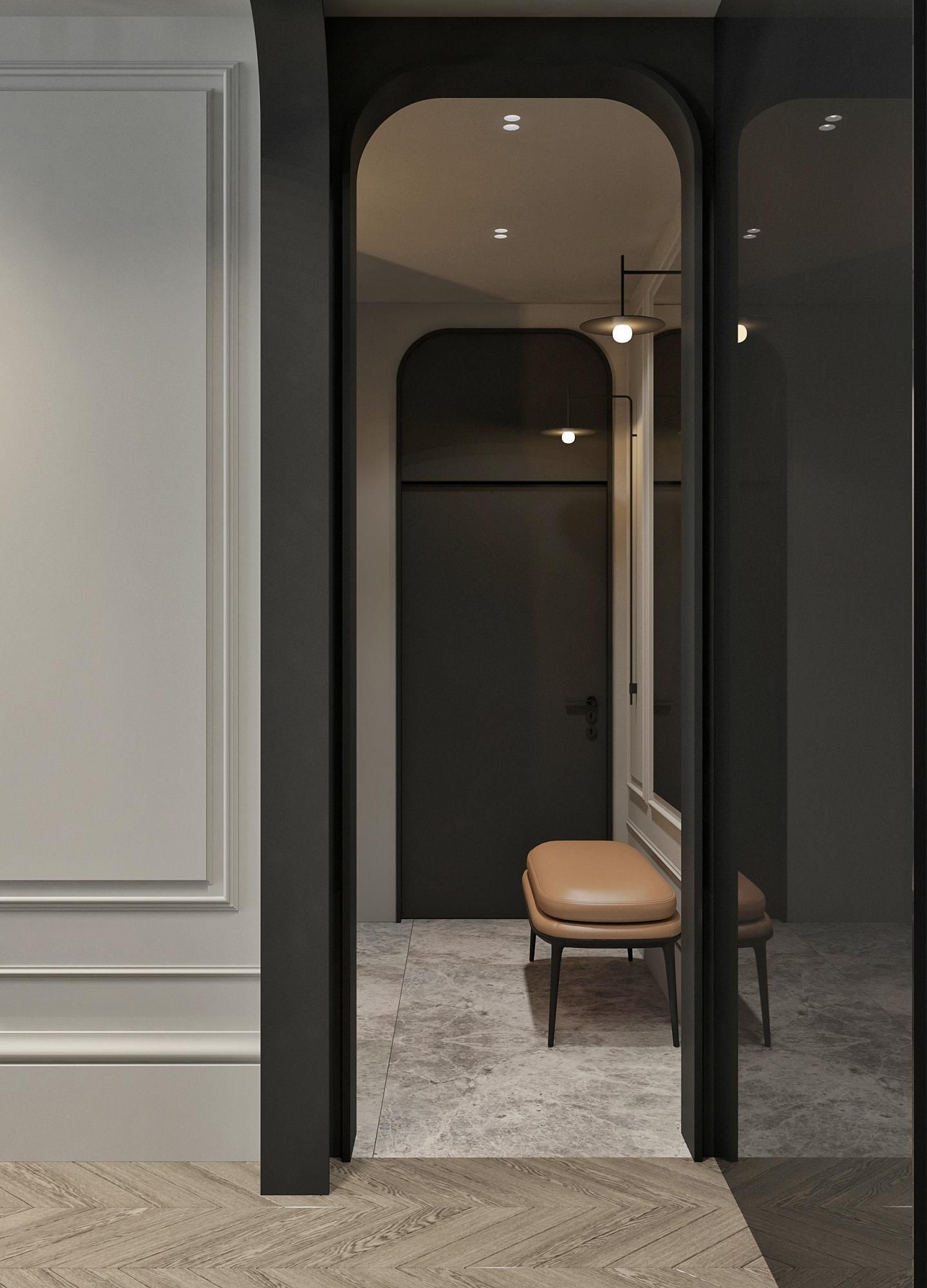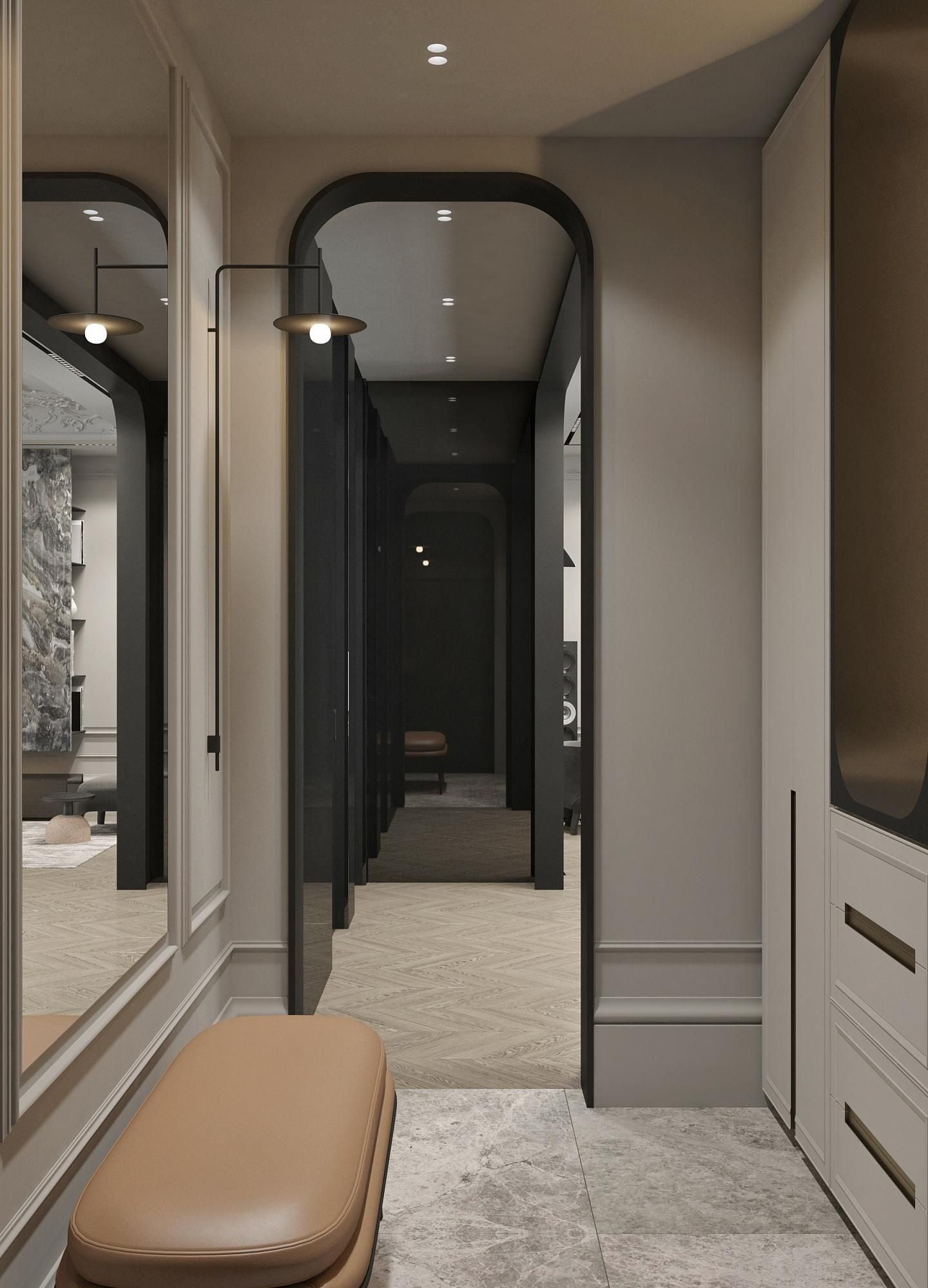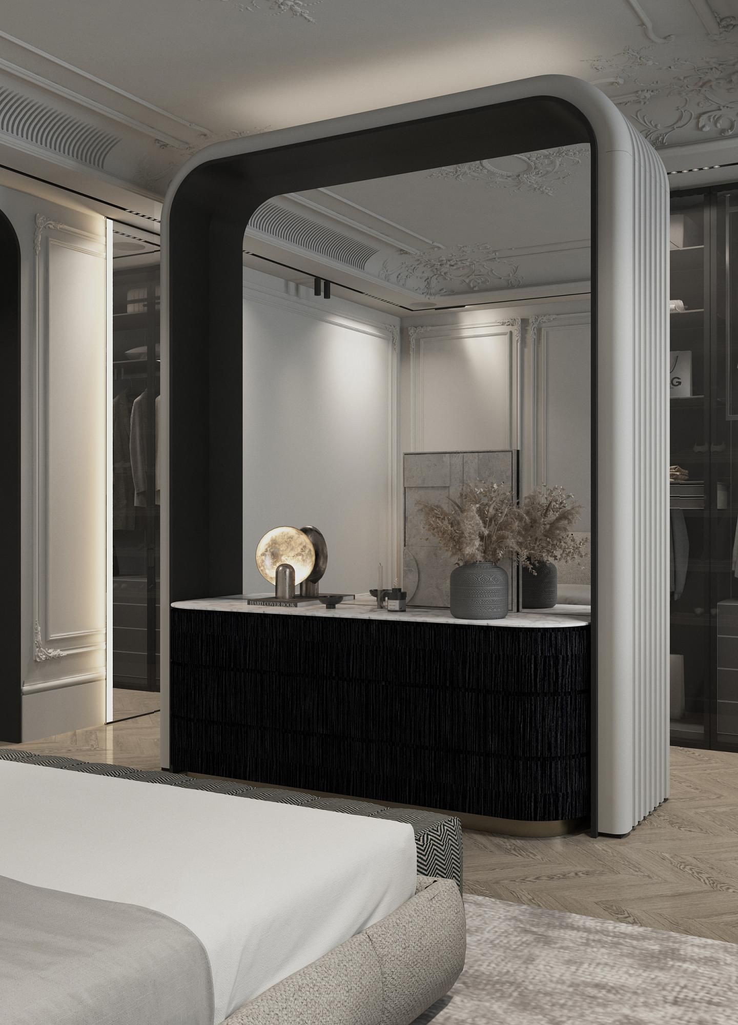 Дизайн спальной комнаты в парижском стиле. Освещение играет ключевую роль, создавая атмосферу и подчеркивая качество используемых материалов. Плавные линии светильников и их мягкий свет придают интерьеру ощущение спокойствия и расслабленности.