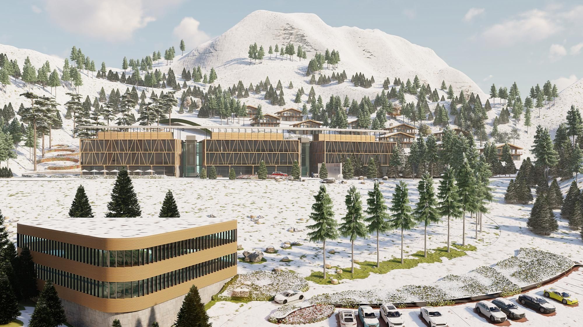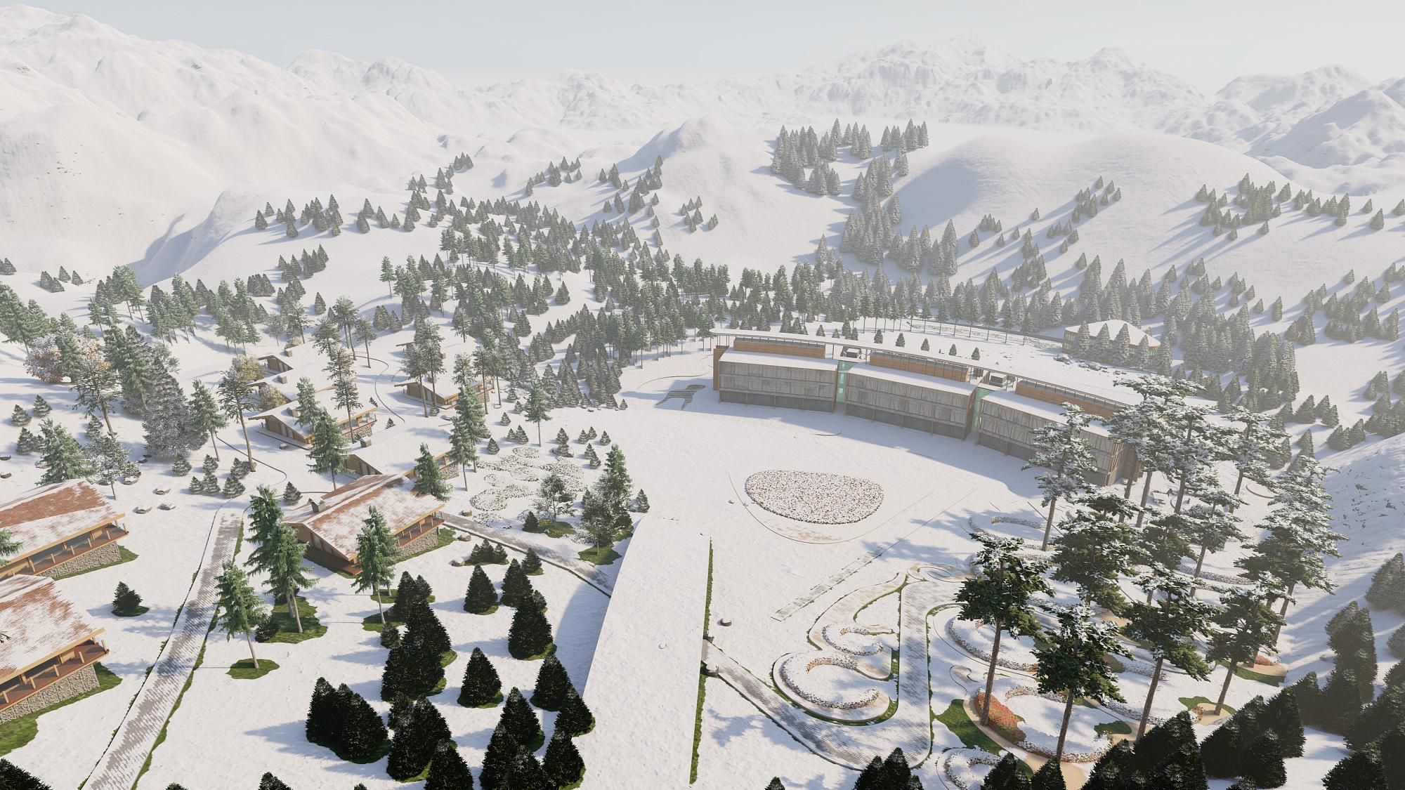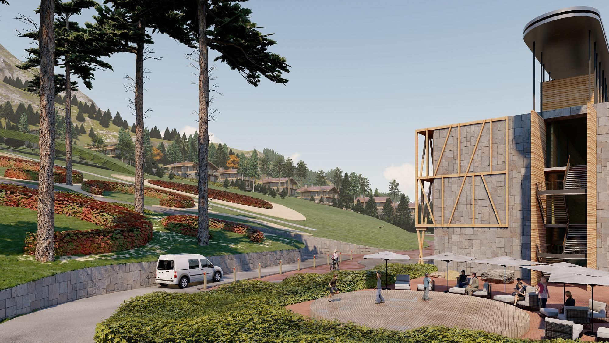 Центральная часть первого этажа это зона рецепции, ски-рум и бара. Слева блок с рестораном и справа блок со СПА. Все модули прогибается по рельефу для минимизации земленых работ. Фокус блоков смещен в сторону лесистой части склона (ручьи).