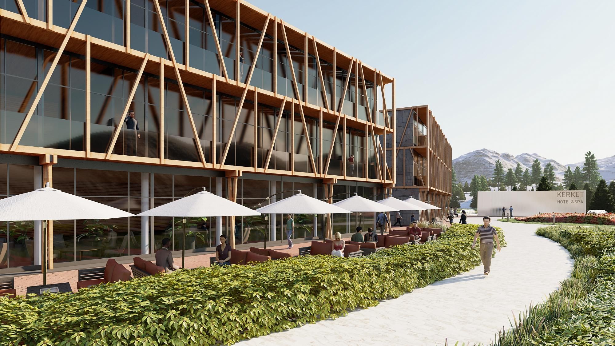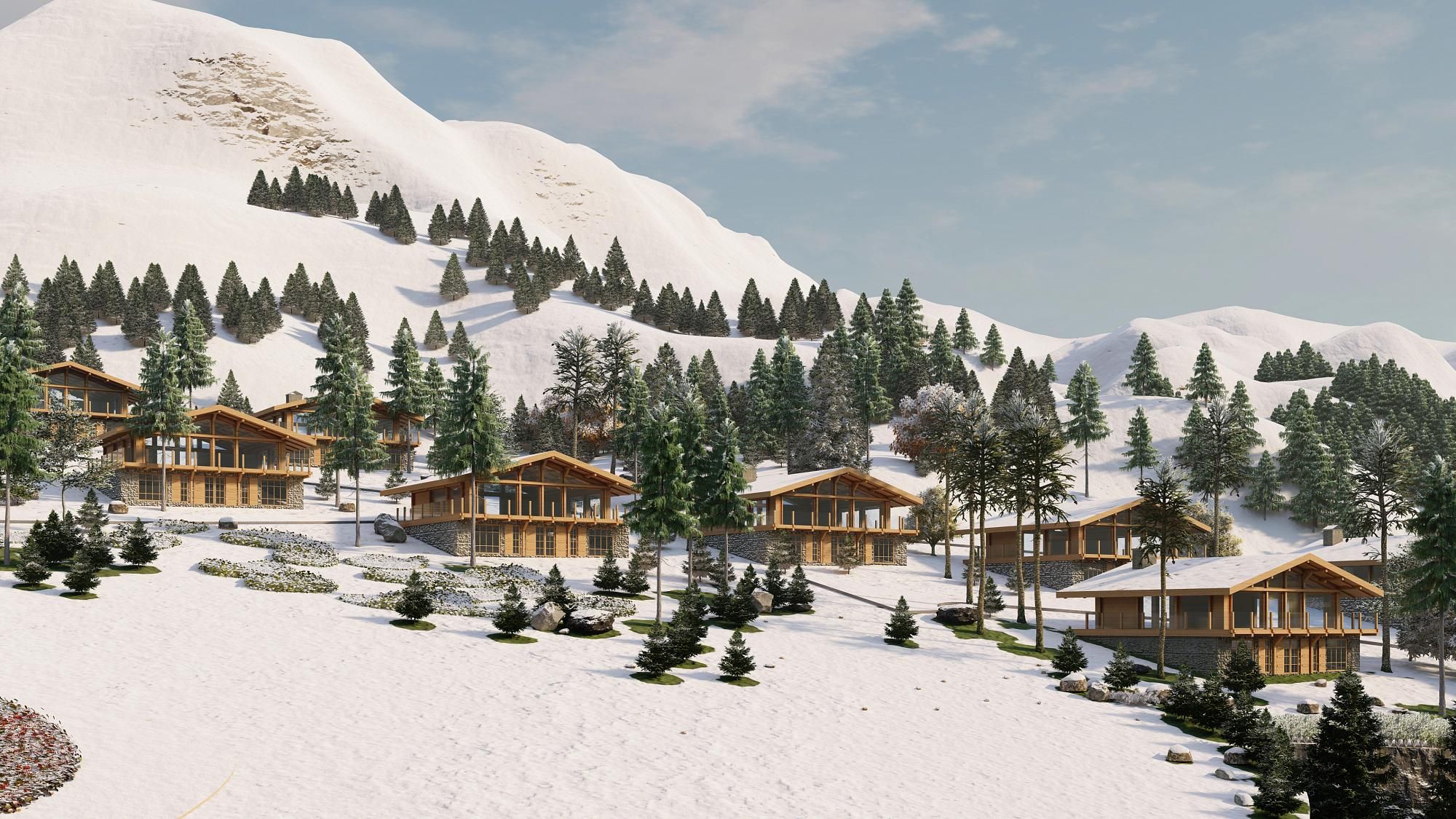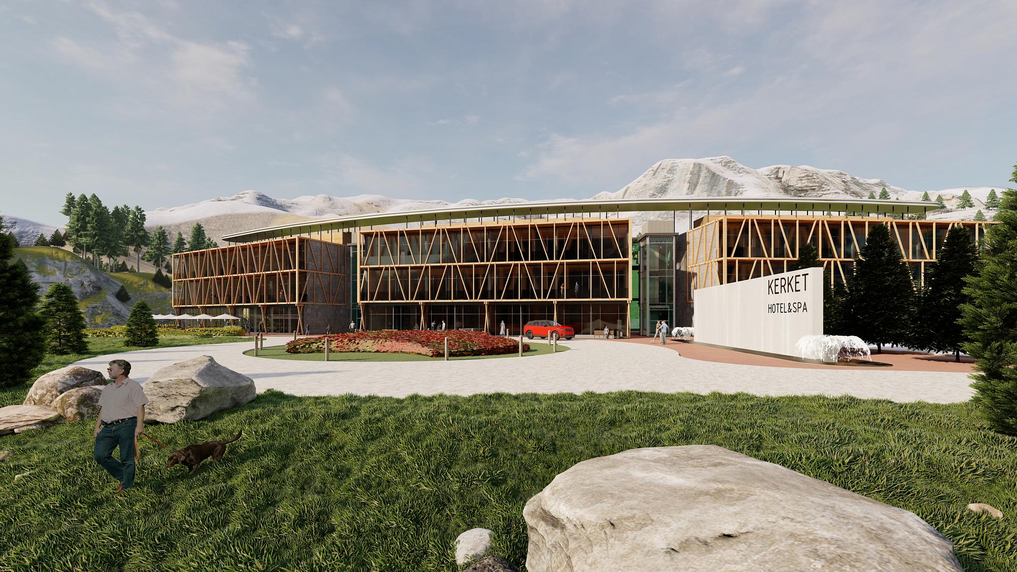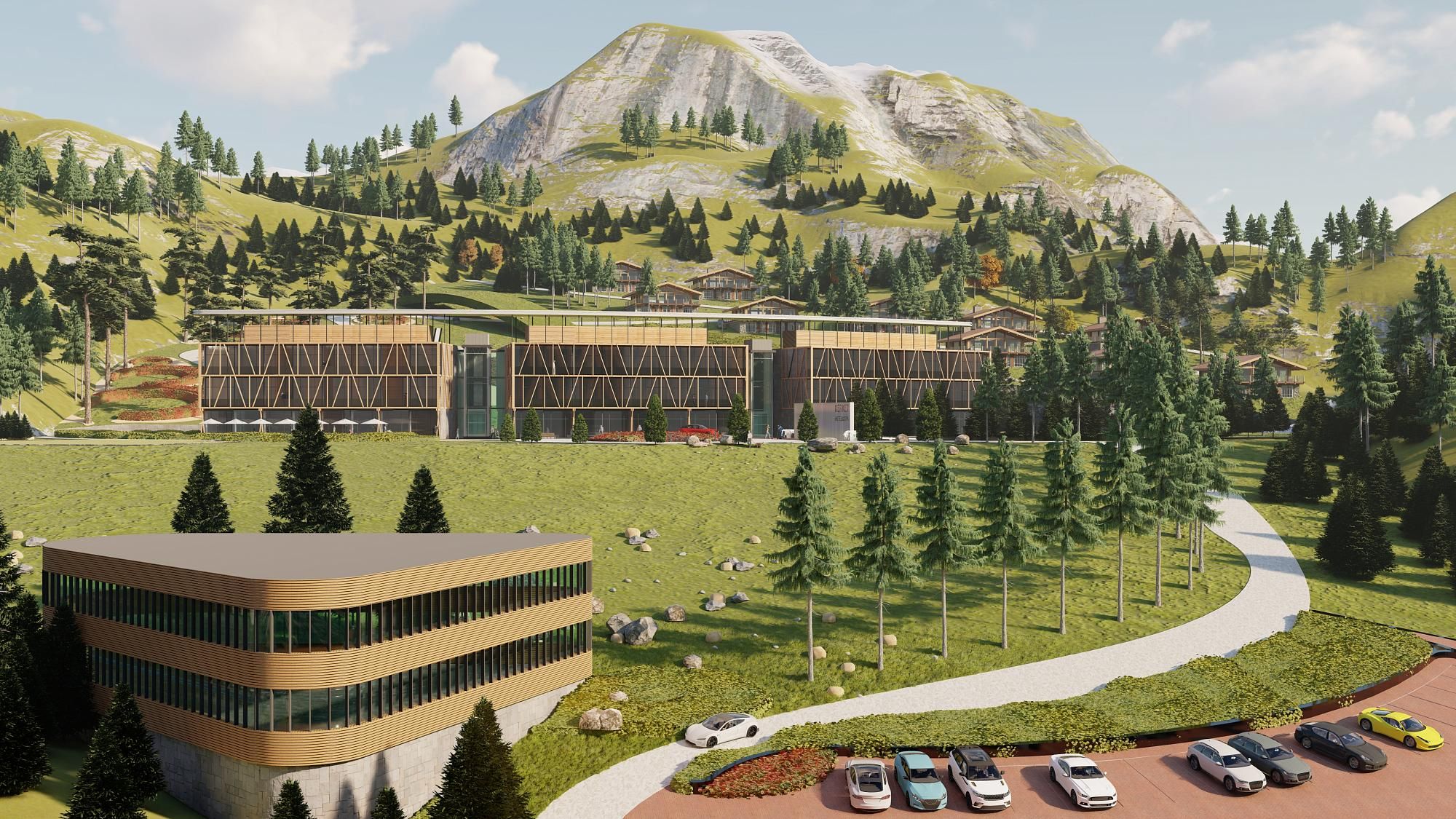 Центральная часть первого этажа это зона рецепции, ски-рум и бара. Слева блок с рестораном и справа блок со СПА. Все модули прогибается по рельефу для минимизации земленых работ. Фокус блоков смещен в сторону лесистой части склона (ручьи).