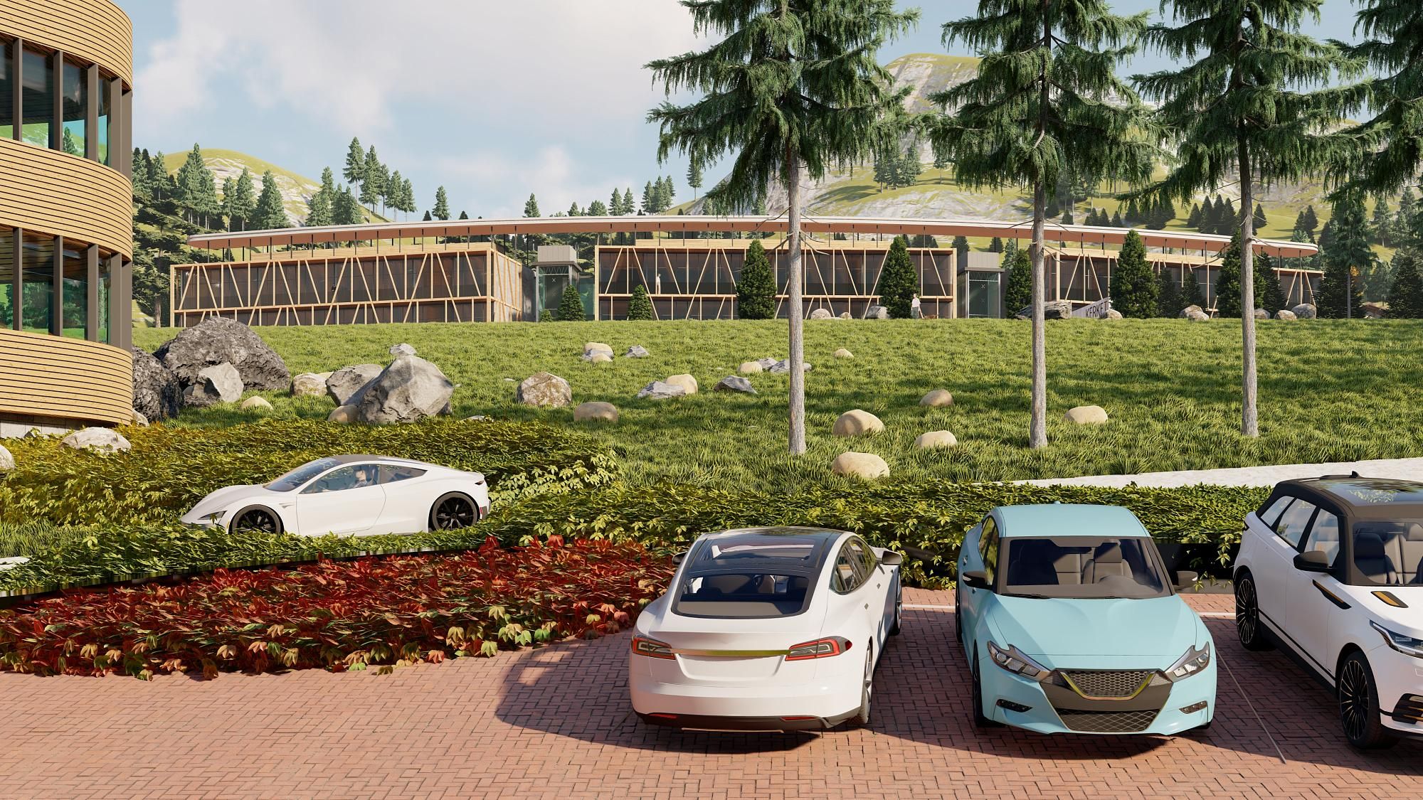 - объем комплекса разбит на 3 равных блока (около 20х30м), поставленных по крупному радиусу (поддерживает направление рельефа). Блоки соединяются остекленными переходами с панарамными лифтами, крыша у блоков плоская. На первом этаже первого блока ресторан, загрузка с северной стороны