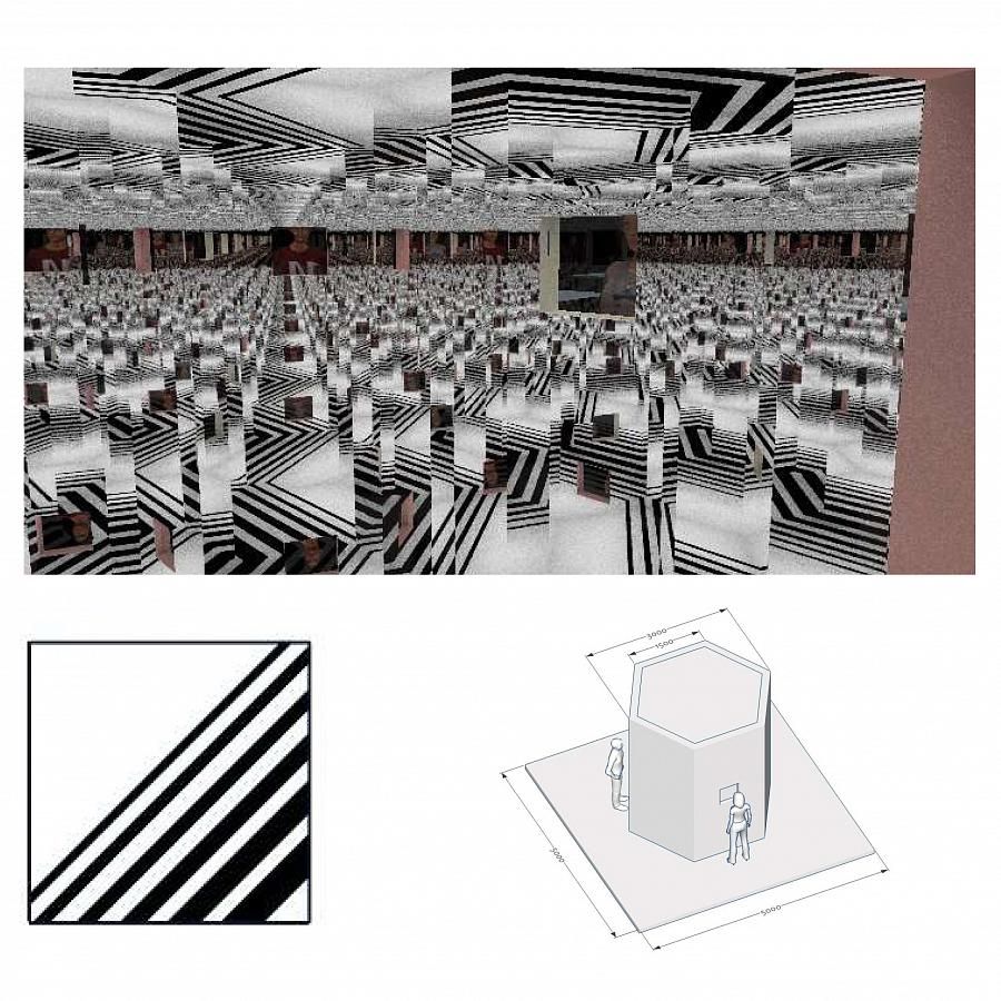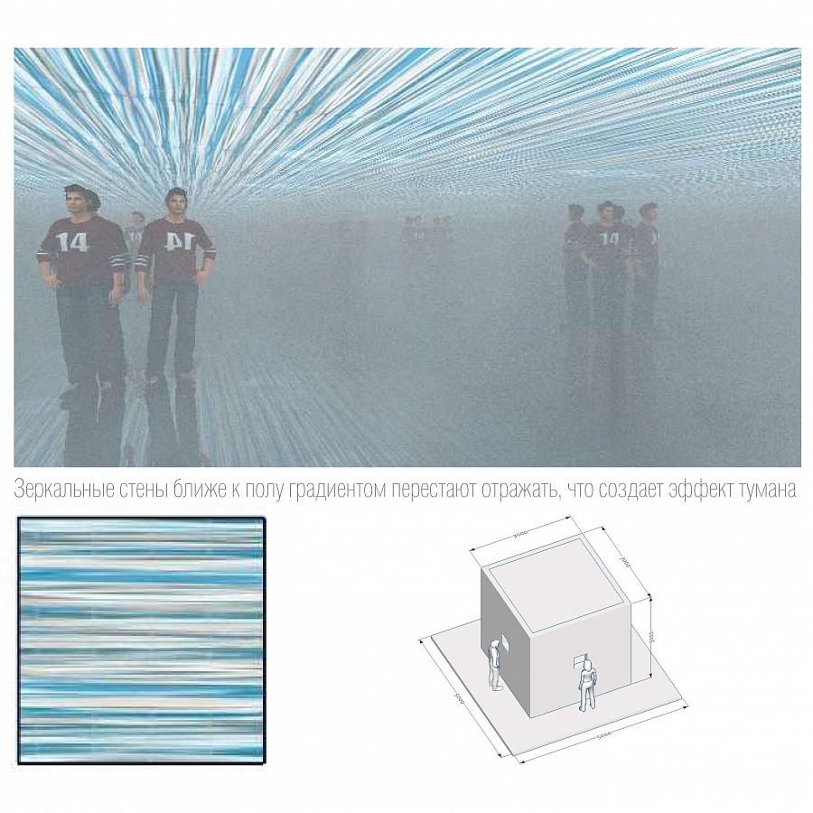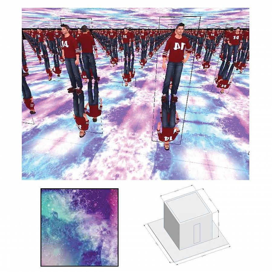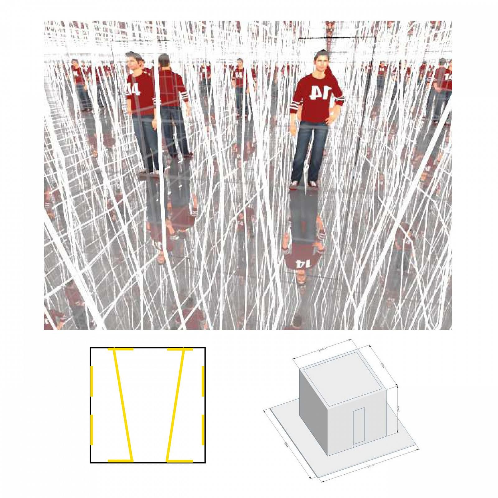 Интерактивное видео - через обратную проекцию или мониторы - на потолке + множественные отражение в зеркалах стен и пола.