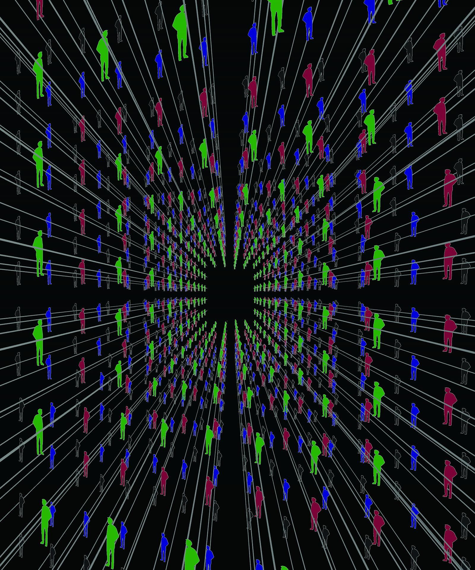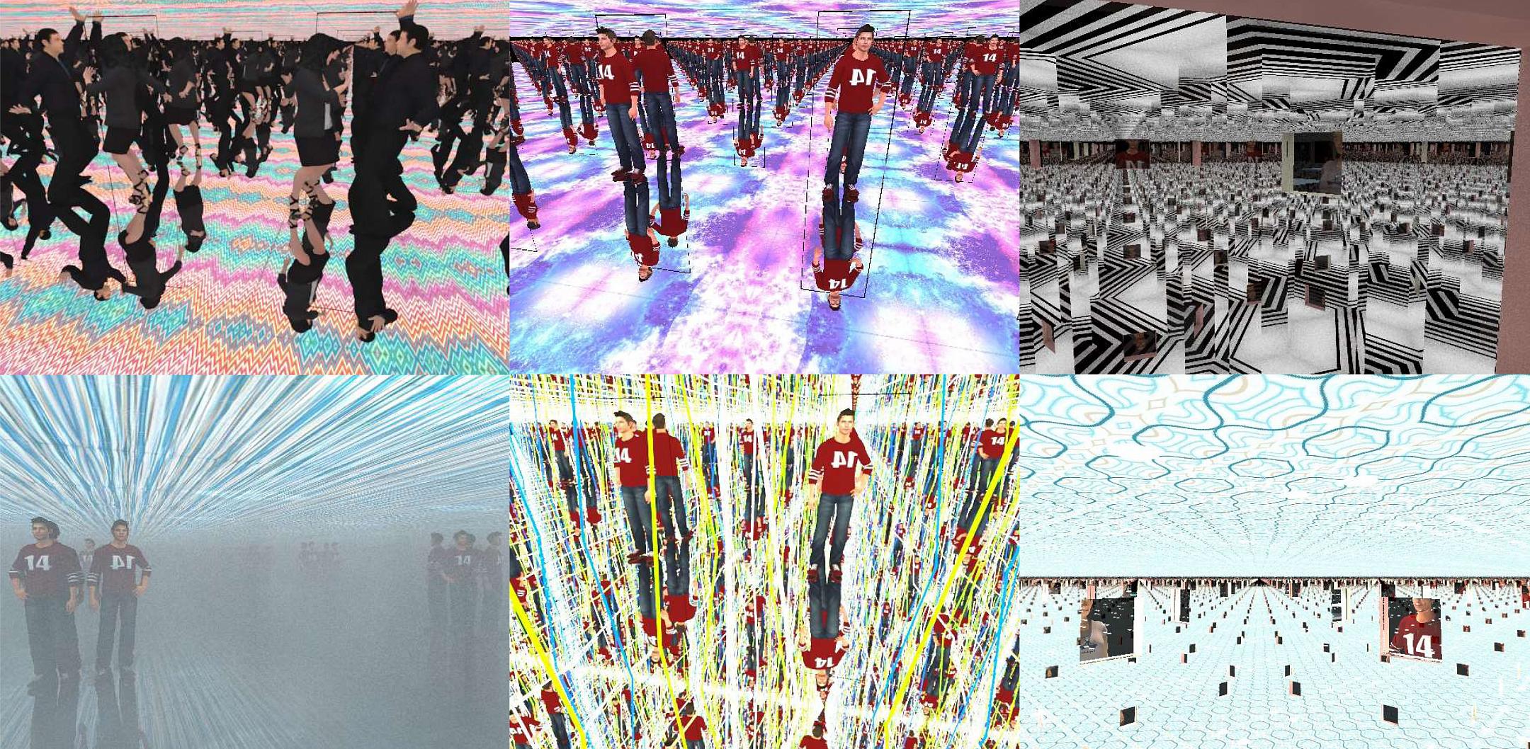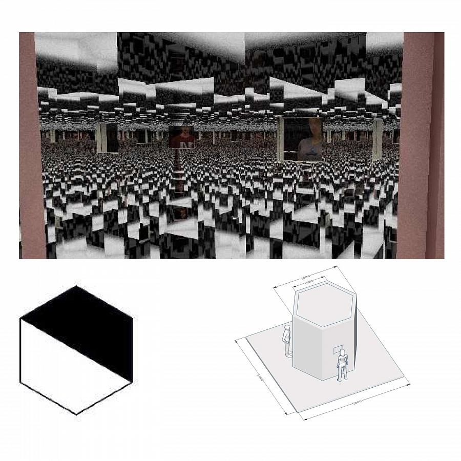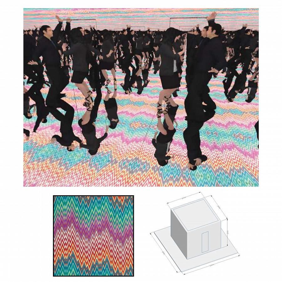 Интерактивное видео - через обратную проекцию или мониторы - на потолке + множественные отражение в зеркалах стен и пола.
