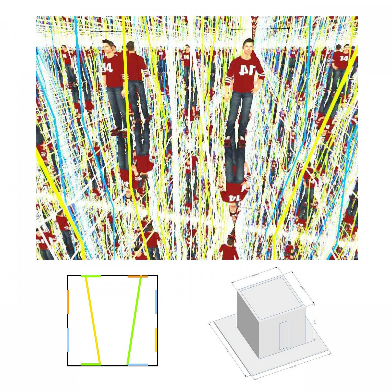 Зеленый лазерный луч на уровне ног - колен материализуется в легкой стелющейся по полу дымке и преломляется живописным образом в зеркалах - имея направление идентичное движению облаков. Линии лазера можно анимировать.