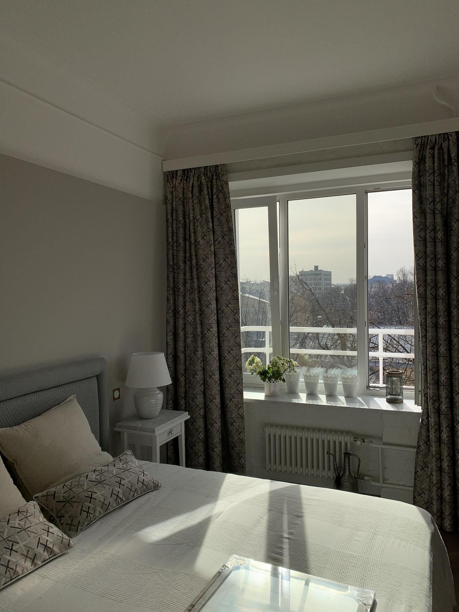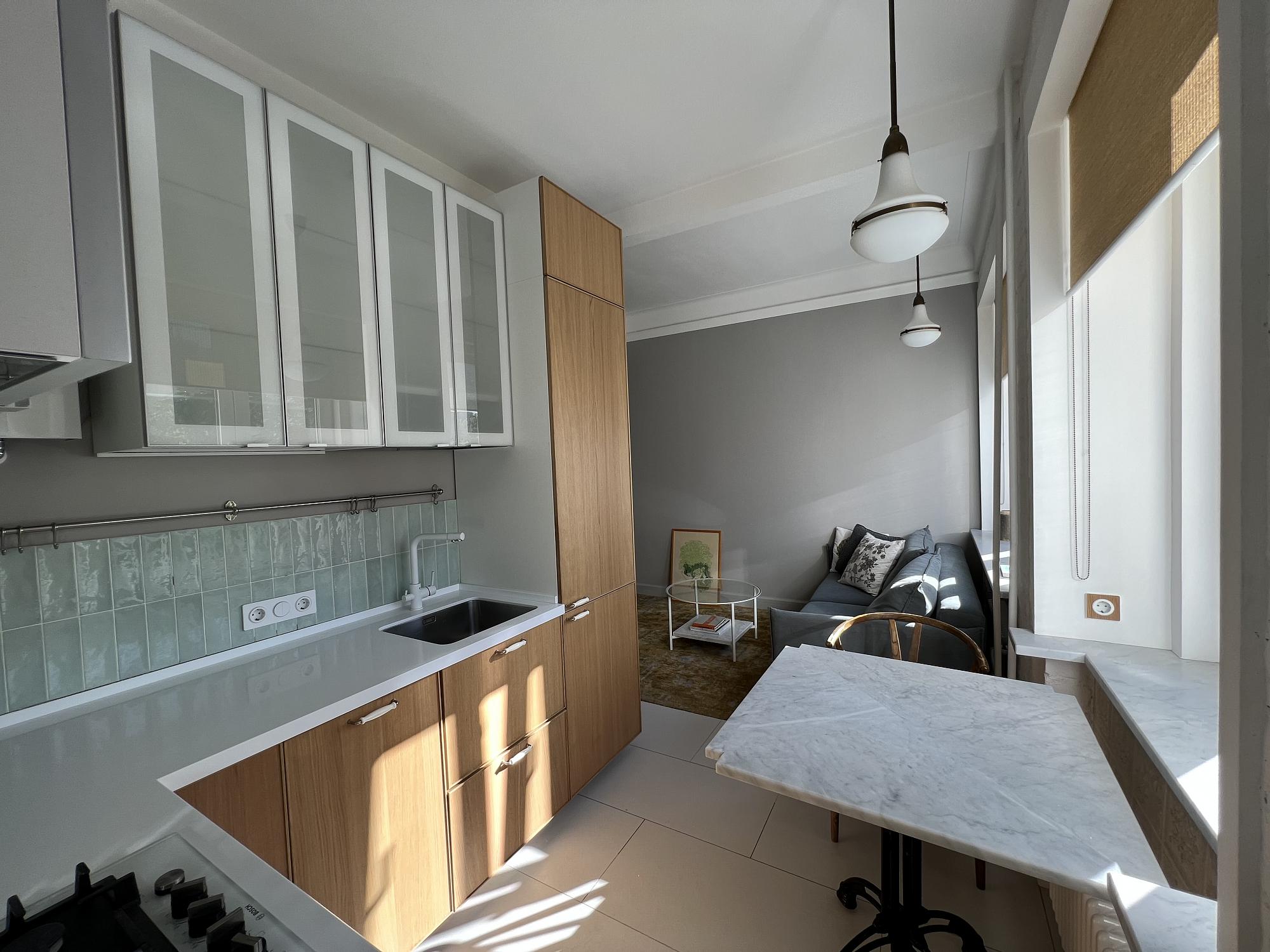Две квартиры на этаже - дом построен для работников дипломатического корпуса. Потолки 3.10 метра. Новые инженерные системы, моторизированные шторы в спальной, теплые полы, радиаторы Arbonia, газовая колонка Bosсh (независимый современный автомат, нет летних отключений горячий воды), свет ар-деко Берлинер, удобные датчики движения для света, авторская мебель, новые энерго-эффективные окна Schuco. Полы массив дуба, подоконники и столы каррарский мрамор. Гостиная с кухней - диван раскладывается в дополнительную гостевую двуспальную кровать. Большой душ (135х90см) с термостатом  выставляется постоянная температура воды  не надо крутить ручки, мраморный душевой поддон с подогревом, встраиваемый унитаз и гигиенический душ.
