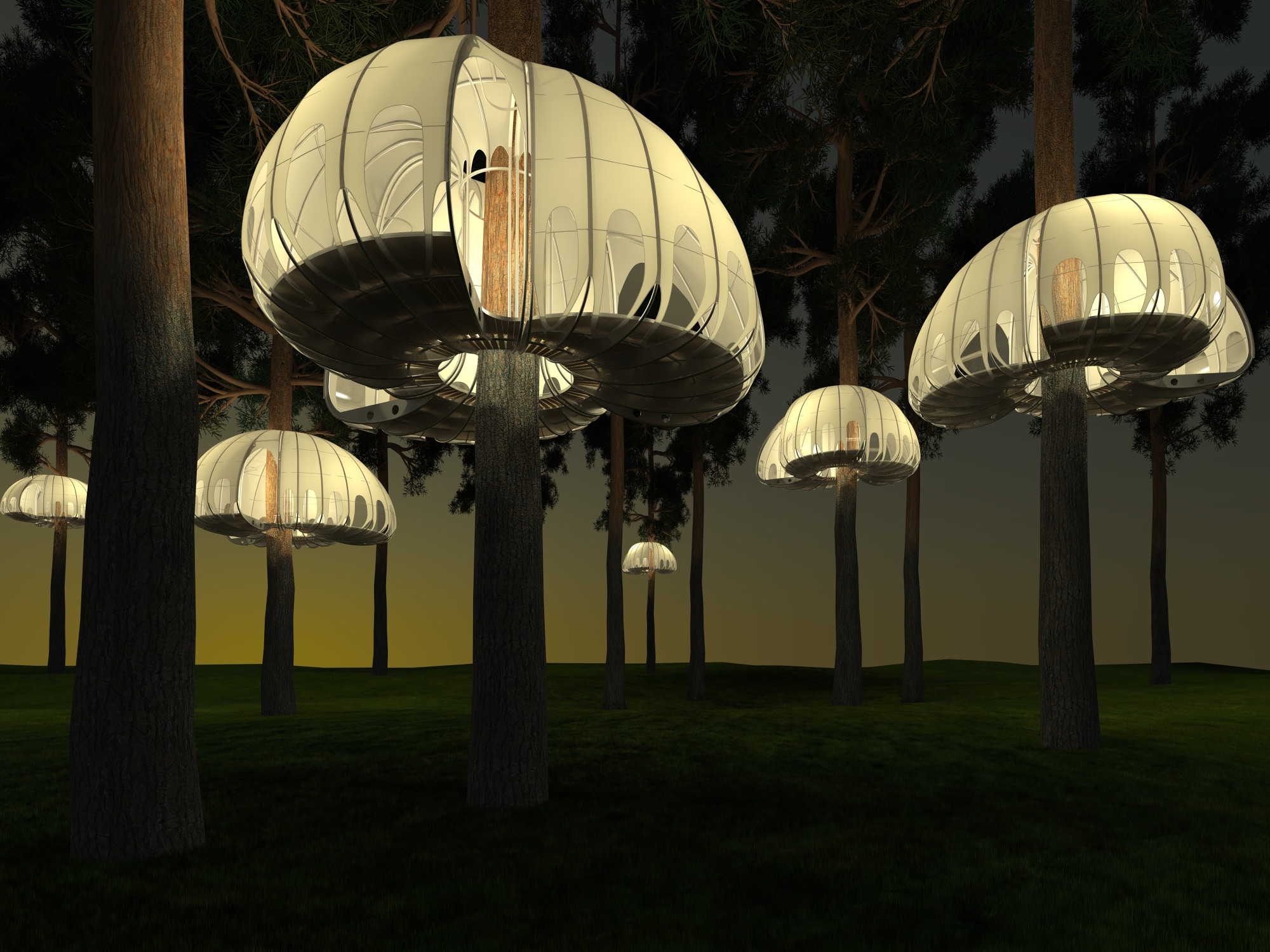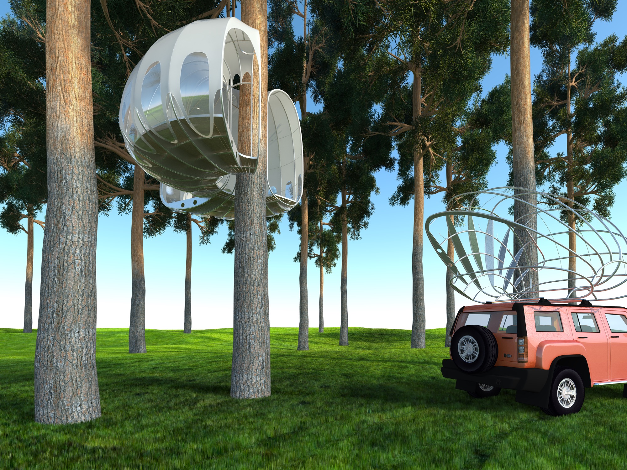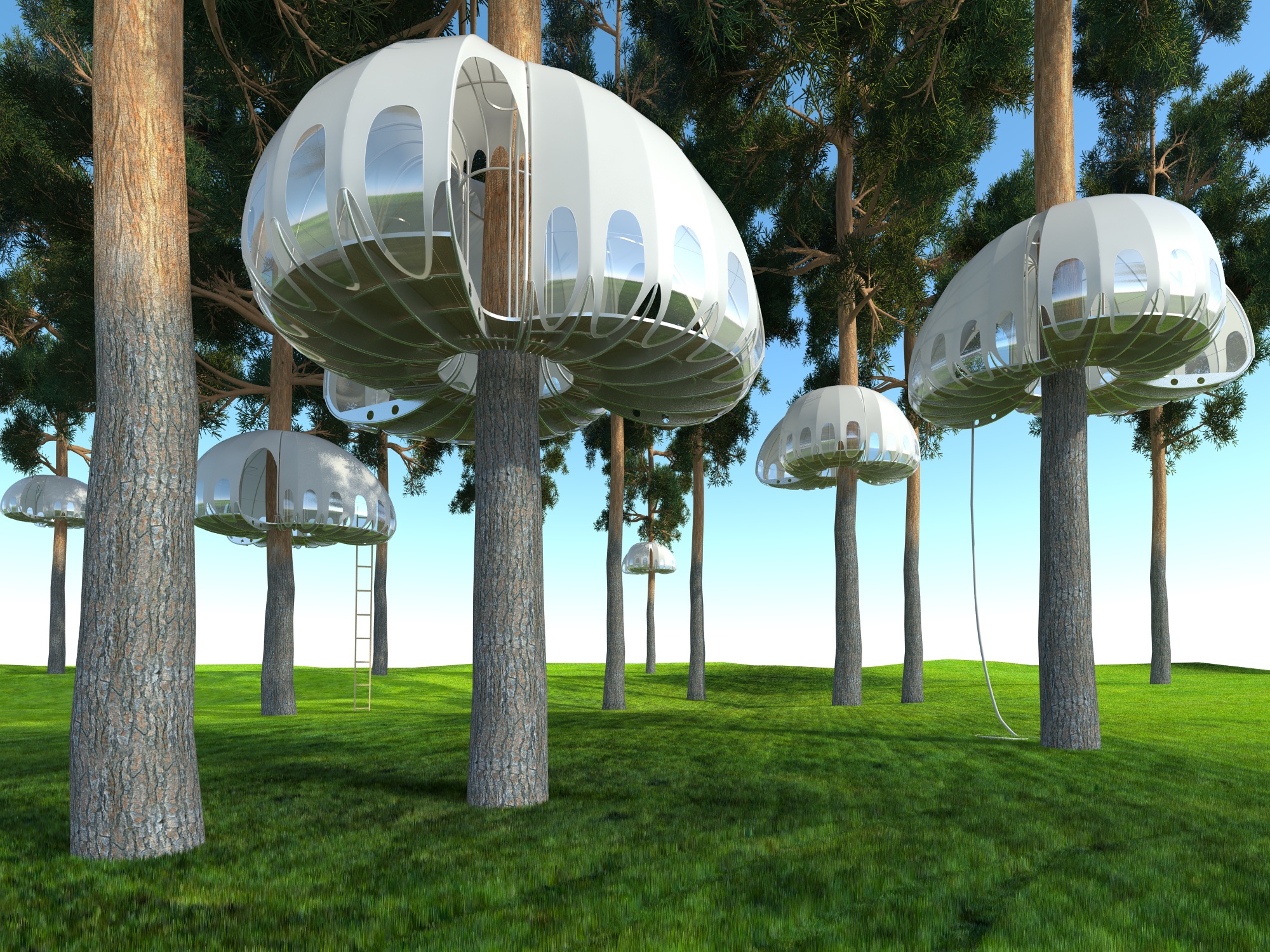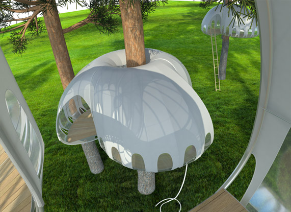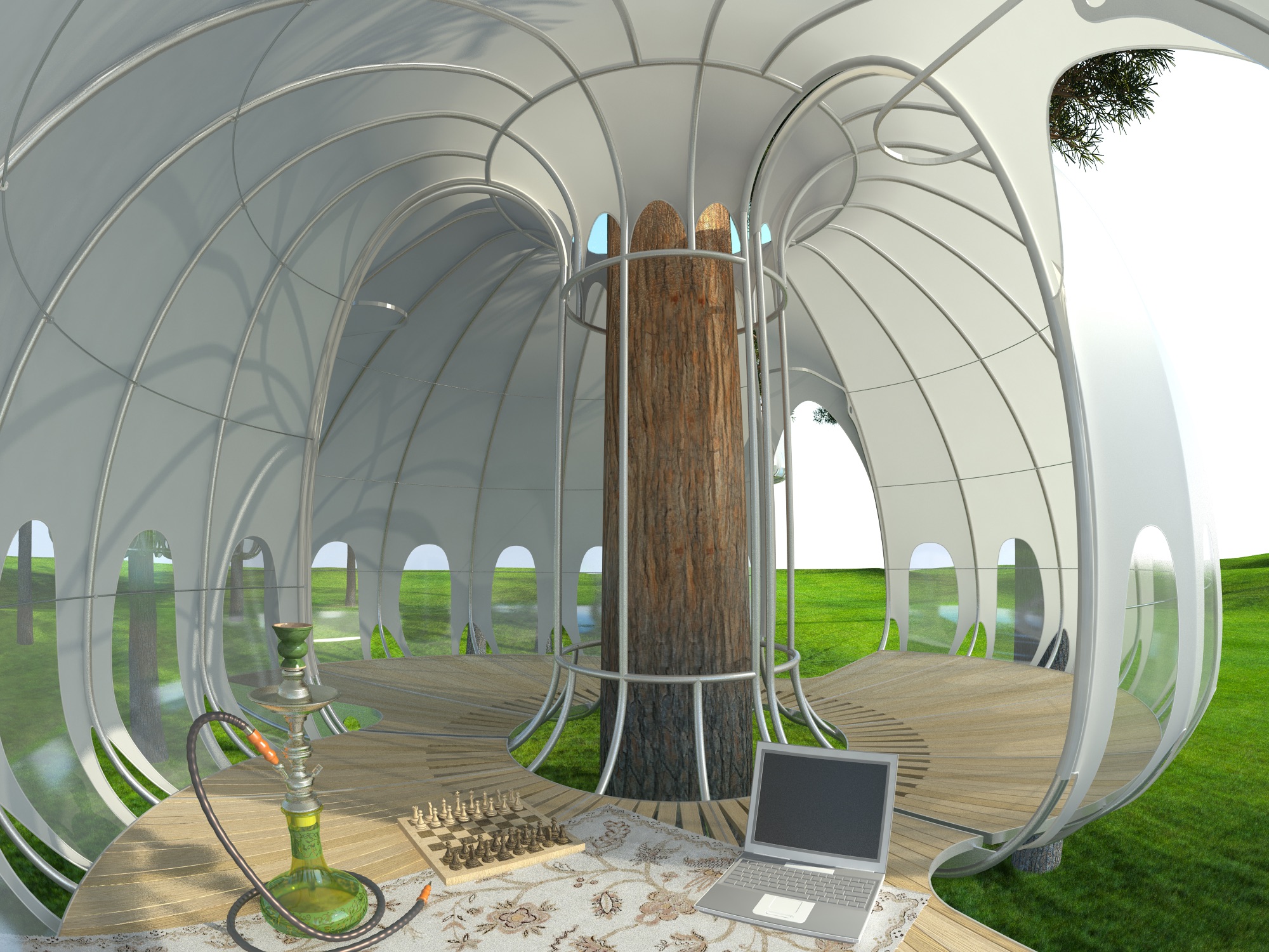 Павильон многофункционален. Может служить передвижной беседкой, охотничьим домиком, детским игровым пространством, летней гостевой комнатой, смотровой площадкой, кельей, часовней... Такой дом убережет путешественника или охотника от диких зверей. Это сцена для расслабления и покоя в контакте с природой. Романтика в нем мальчуговая немного. Здесь, на высоте нескольких метров от земли, гораздо меньше комаров и прочих насекомых. Доступ в павильон осуществляется по веревочным лестницам, мостикам или вантовым конструкциям. Конструкция покрыта легкой тканью и вставками гибкого прозрачного пластика. Дополнительными достоинствами проектируемой конструкции является мобильность и универсальность. Разборную конструкцию можно легко демонтировать (сменить дерево или изменить высоту установки). Вес и сечения минимальные - меньше нагрузки на ствол, легкость в транспортировке, простота монтажа и дислокации. Нашему дереву не больно. Система крепежа - на хомутах - не травмирует ствол.