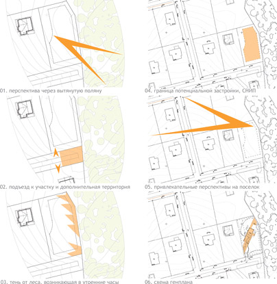 Дом и основные вспомогательные элементы благоустройства располагаются по диагонали участка и условно делят его на две засеянные газоном поляны - юго-восточную и северо-западную. Такое расположение проявляет самый большой линейный размер землевладения и зрительно его увеличивает. Расположение дома на участке соответствует требованиям по пожарным разрывам между деревянными малоэтажными строениями. Навес крытой парковки объединен со входной группой.