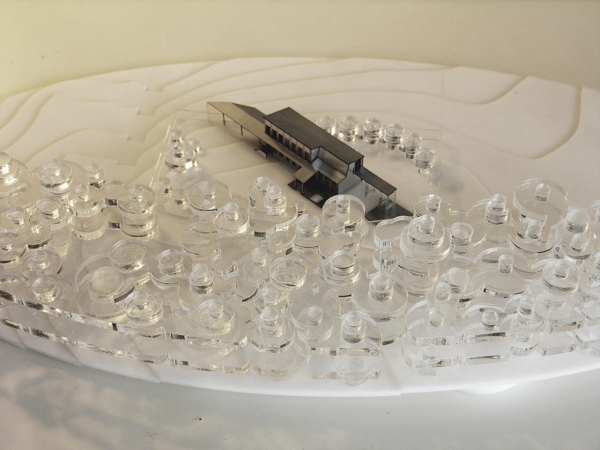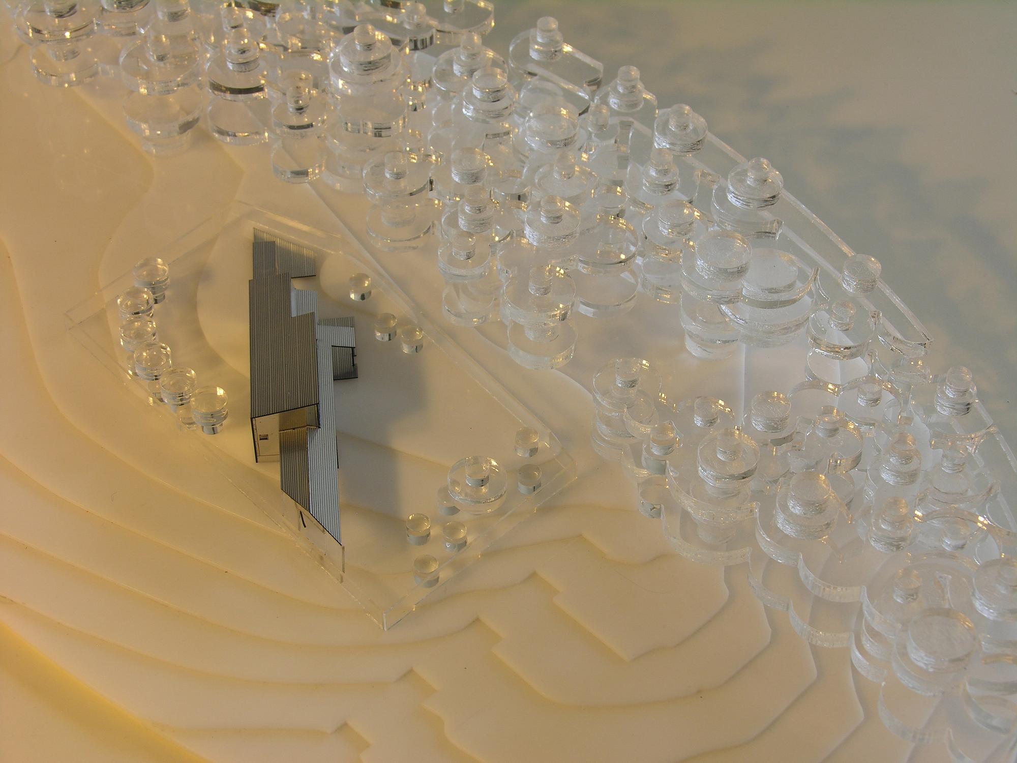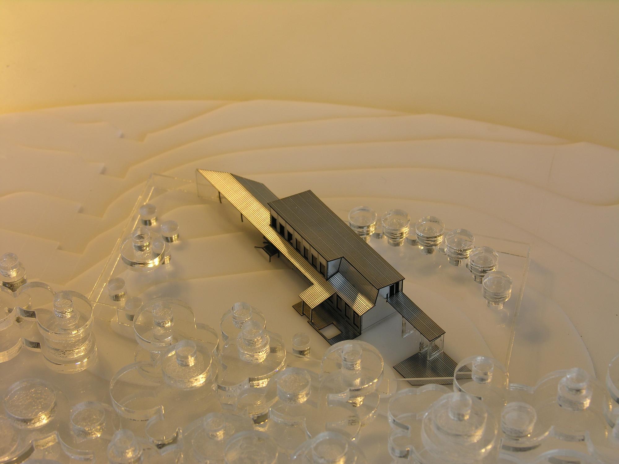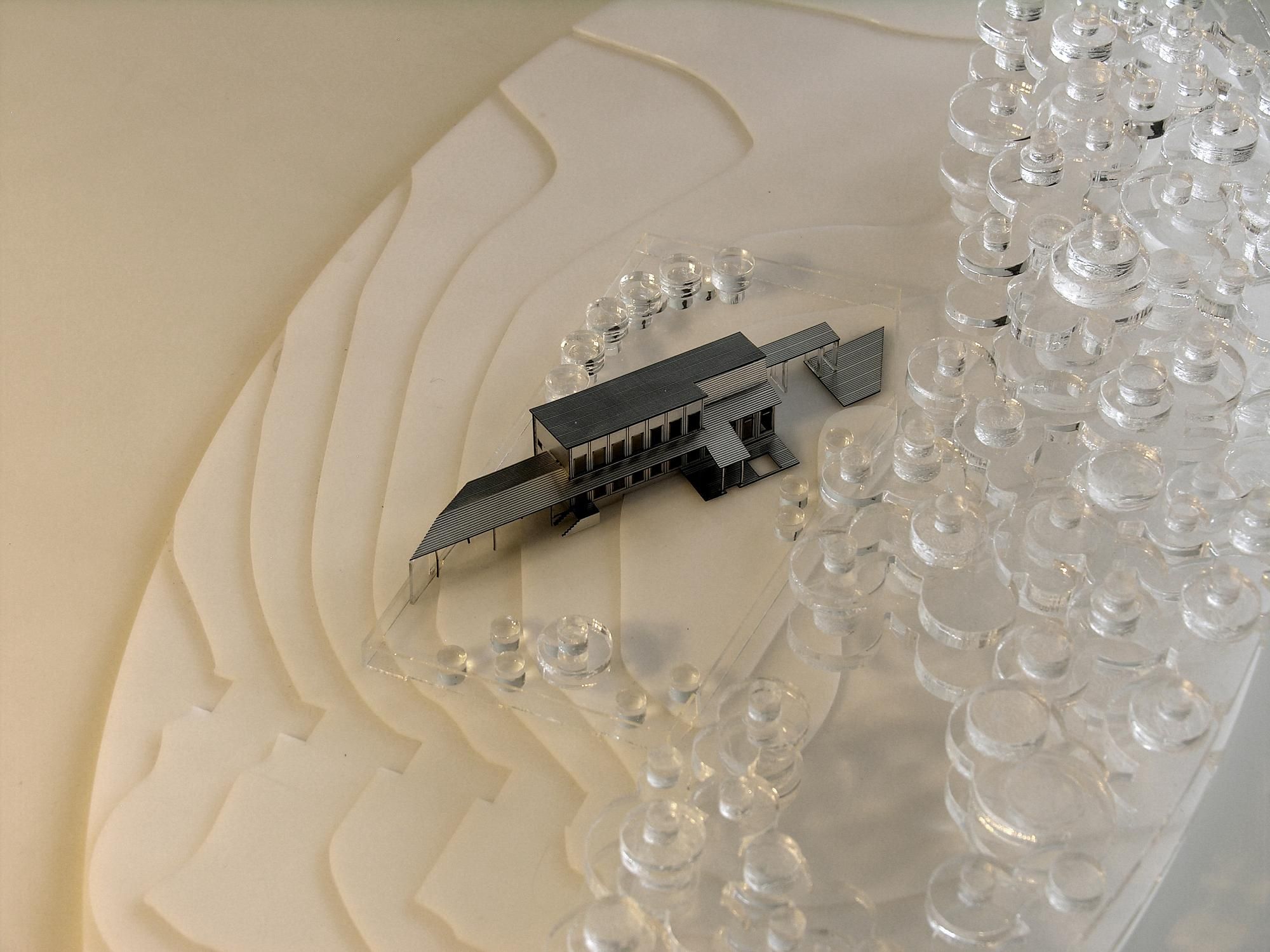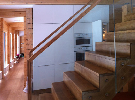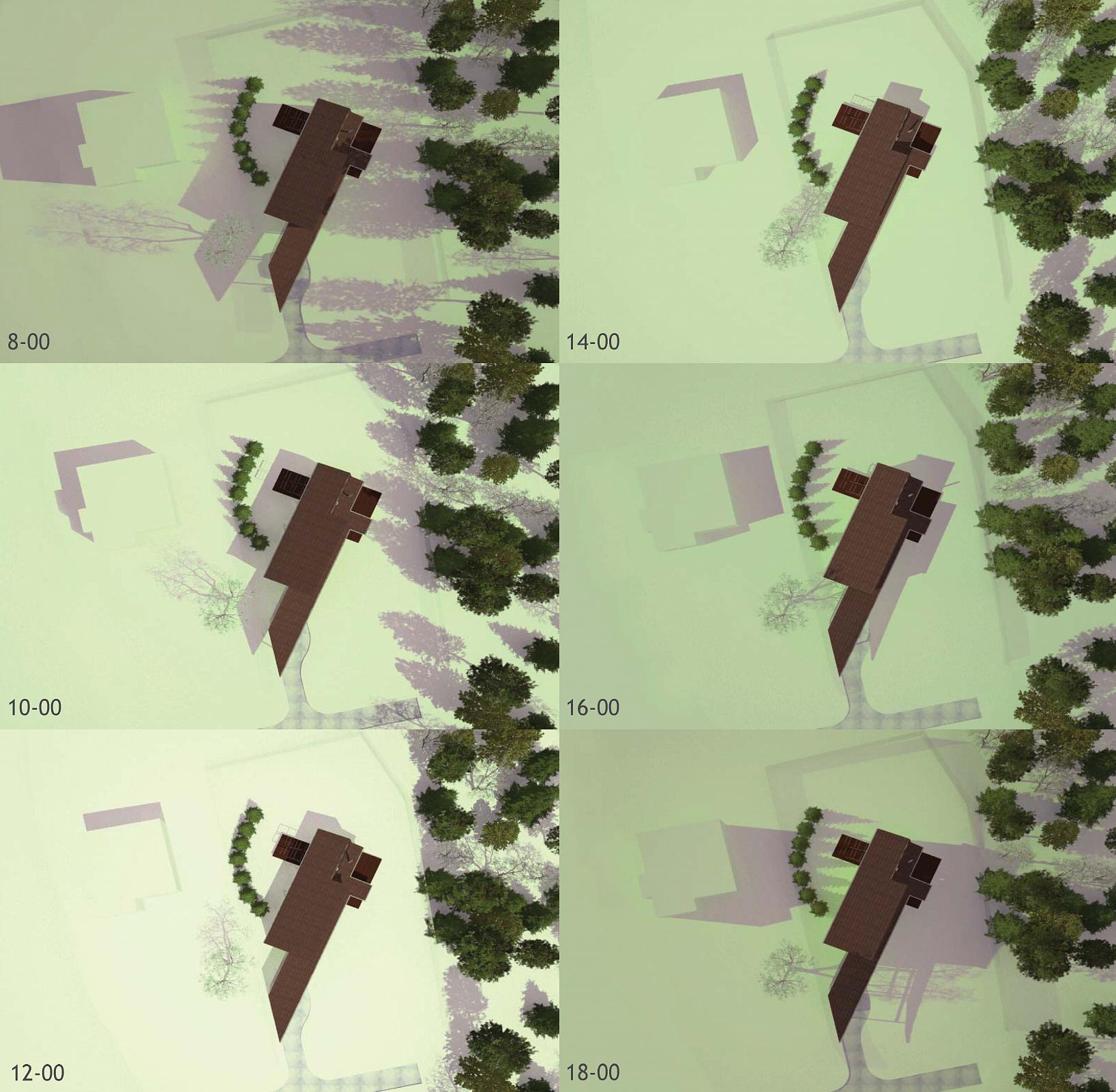 В связи с линейной структурой дома все основные помещения - спальные комнаты и гостиная - получают самый привлекательный вид из возможных. Это многоплановая перспектива через юго-восточную поляну участка на лес и поляну в лесном массиве. Особое внимание уделялось инсталляции главных помещений юго-восточным солнцем. На ЮВ обращен дополнительный навес над частью террасы: здесь располагается летняя обеденная зона и летний бассейн-ванная. Объем междуэтажной лестницы, отделяя кухонную рабочую зону, дополняет, и тем самым увеличивает, двухуровневую гостиную, имеющую непосредственный выход на СЗ и ЮВ поляны.