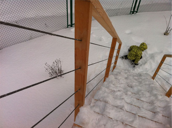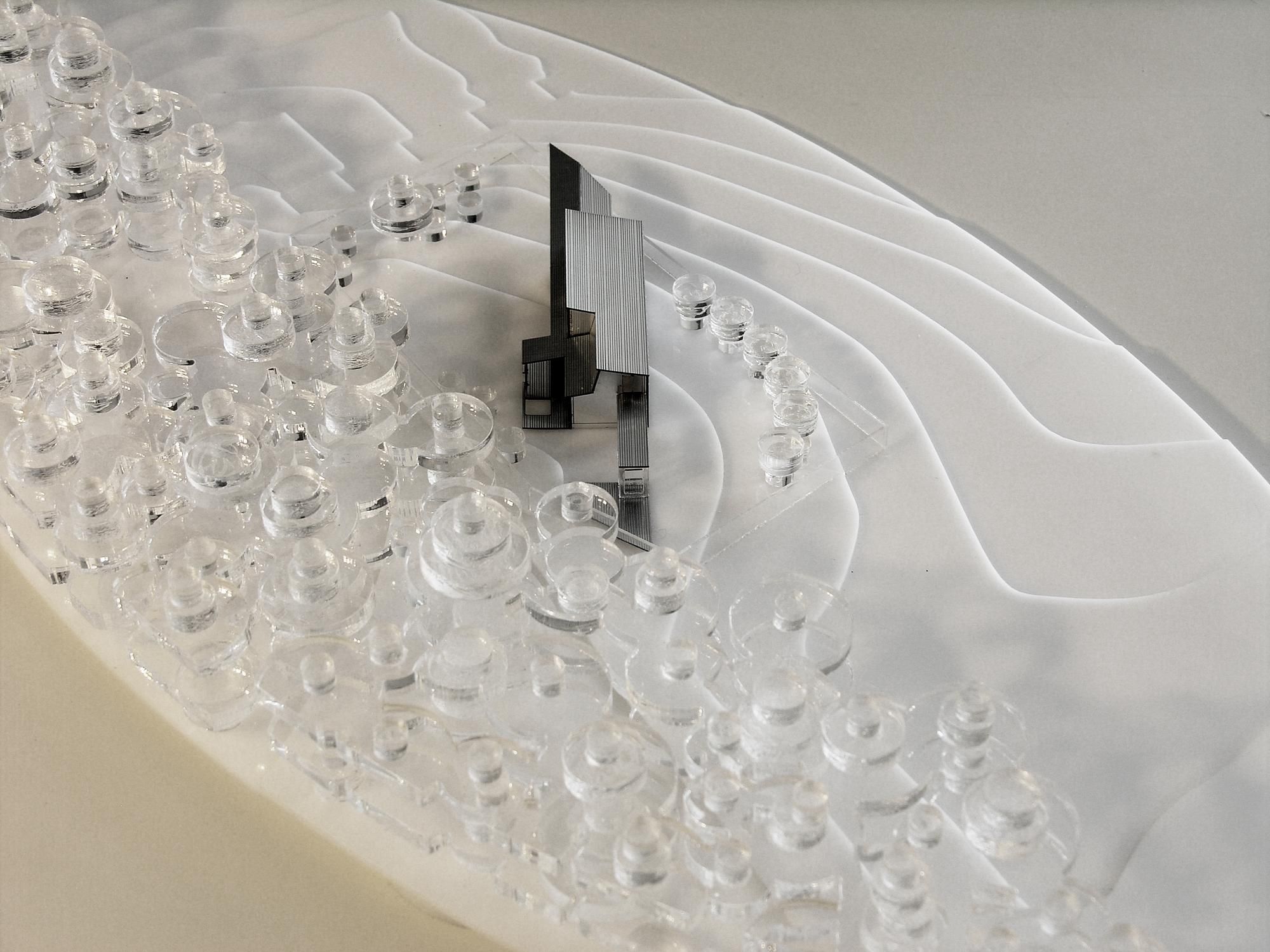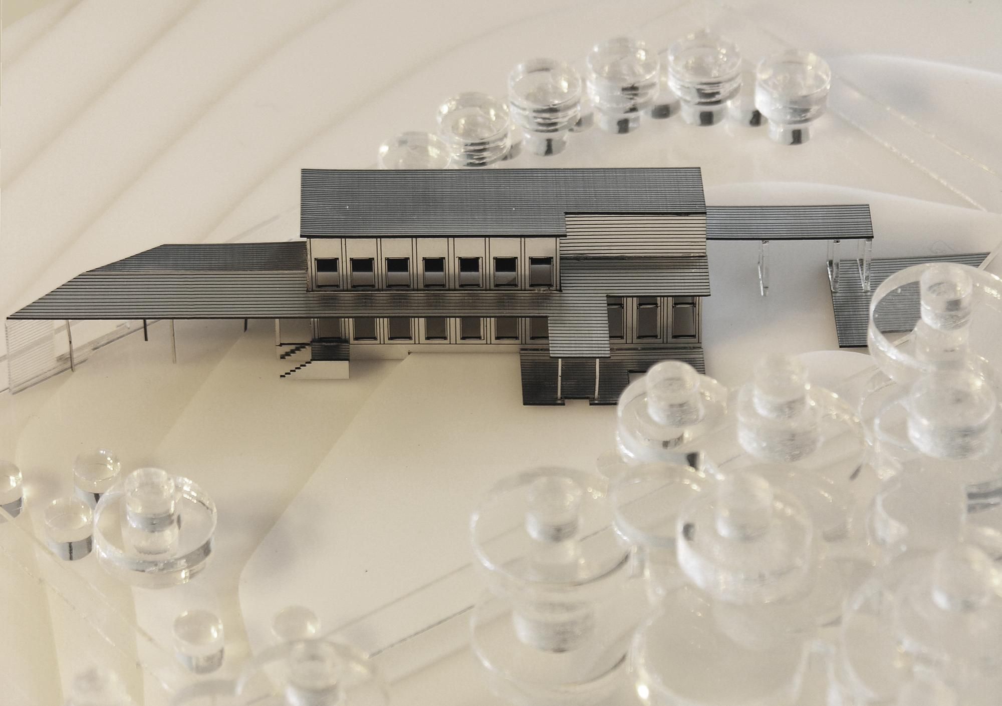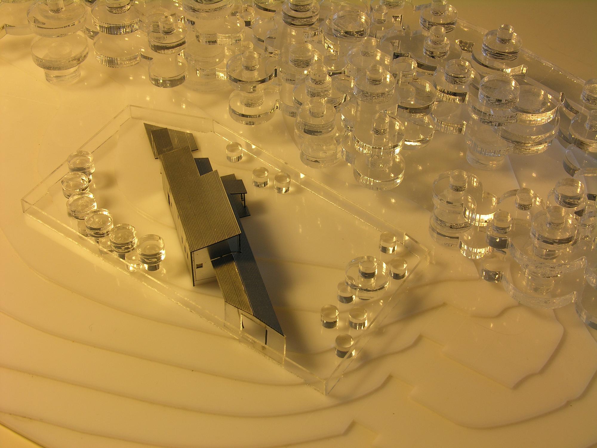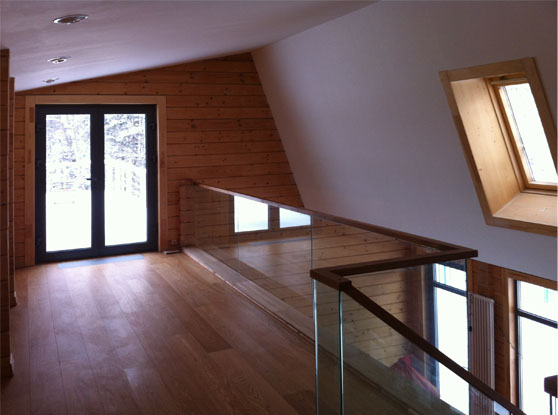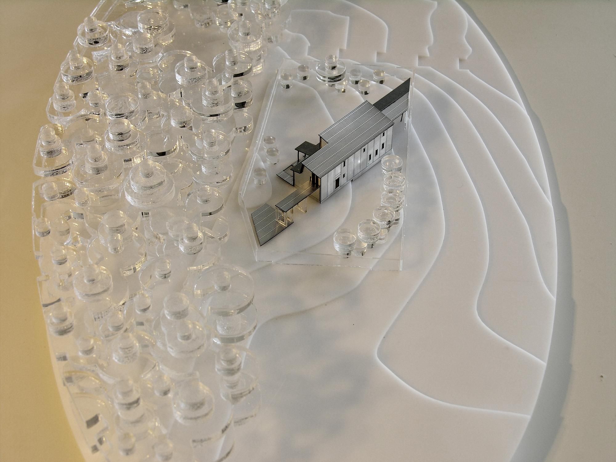 В связи с линейной структурой дома все основные помещения - спальные комнаты и гостиная - получают самый привлекательный вид из возможных. Это многоплановая перспектива через юго-восточную поляну участка на лес и поляну в лесном массиве. Особое внимание уделялось инсталляции главных помещений юго-восточным солнцем. На ЮВ обращен дополнительный навес над частью террасы: здесь располагается летняя обеденная зона и летний бассейн-ванная. Объем междуэтажной лестницы, отделяя кухонную рабочую зону, дополняет, и тем самым увеличивает, двухуровневую гостиную, имеющую непосредственный выход на СЗ и ЮВ поляны.