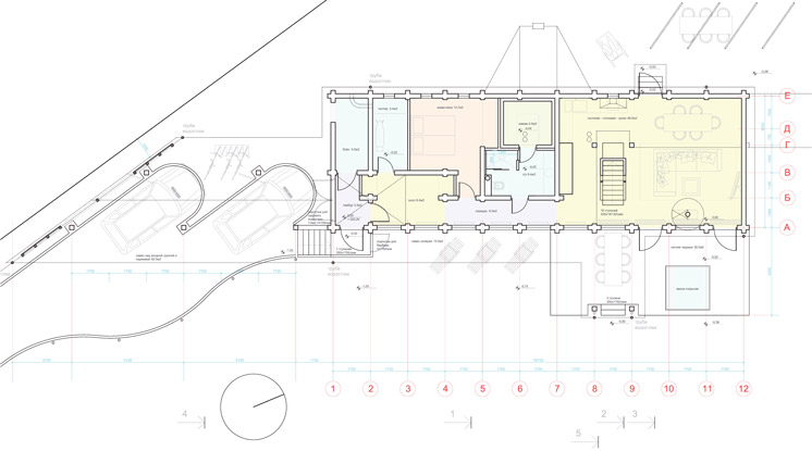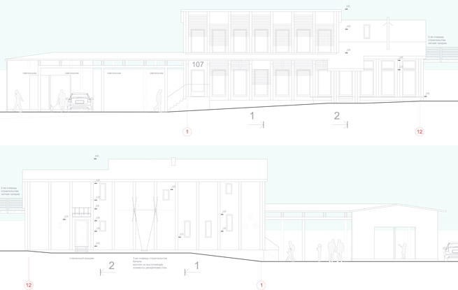 Дуга плотного озеленения на юго-западной границе участка отделяет западную поляну от возможной активности соседской входной группы. В основу планировочной структуры дома легли галереи первого и второго этажей. Так строение получает имя: Дом-Галерея.