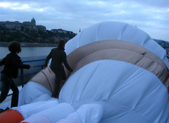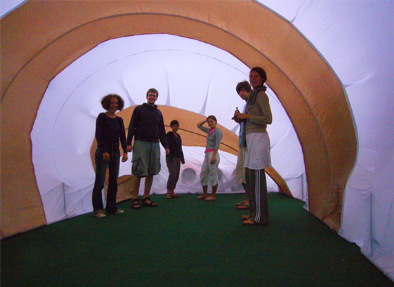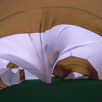 Конструкция и физика формы: Павильоны представляют собой уникальную пневматическую конструкцию - оболочку, устойчивость которой основана на минимальной разнице в давлении изнутри и снаружи павильона. Разница в давлении поддерживается постоянно работающими вентиляторами низкого давления. Стены оболочки изготавливаются из легкой ткани. Вход в павильон осуществляется через щели периодически открывающихся/закрывающихся на молнию дверей.