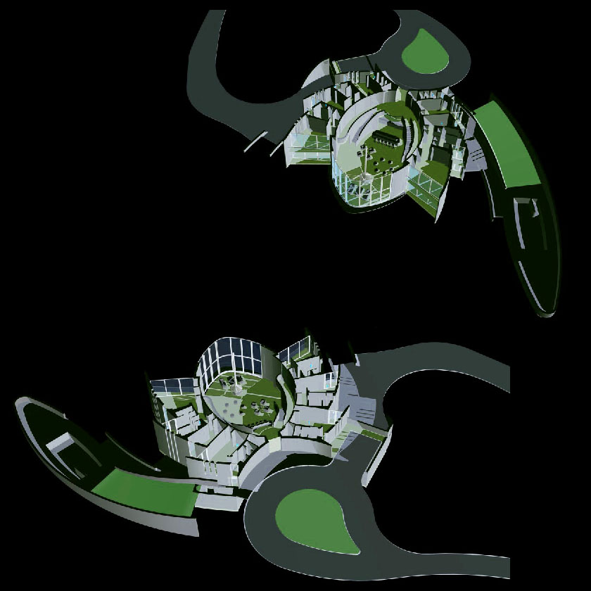 Фокус дома - "Большая Комната" - общественная часть с тремя зонами, такими как: кухня - выделена понижением потолка, центральная часть комнаты - сердце дома - характерна самыми высокими потолками и фронтальная терраса с захватывающим дух панорамным видом долины Акбулак. Вокруг Большой комнаты располагаются частные пространства, такие как спальни, столовая, кабинет, медиа-тв комната, игровая, подсобные и технические помещения. Эти помещения имеют отличные пространственные характеристики несмотря на прямую функциональную связь с Большой комнатой.