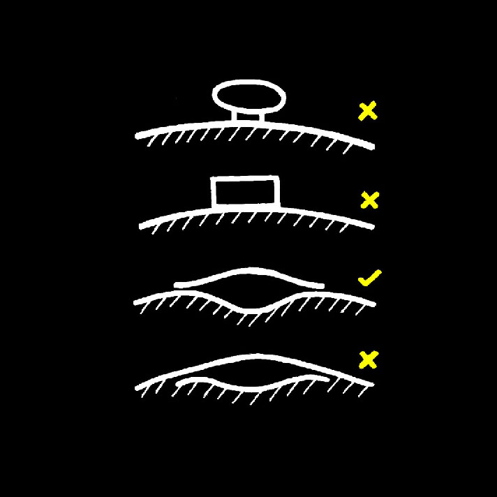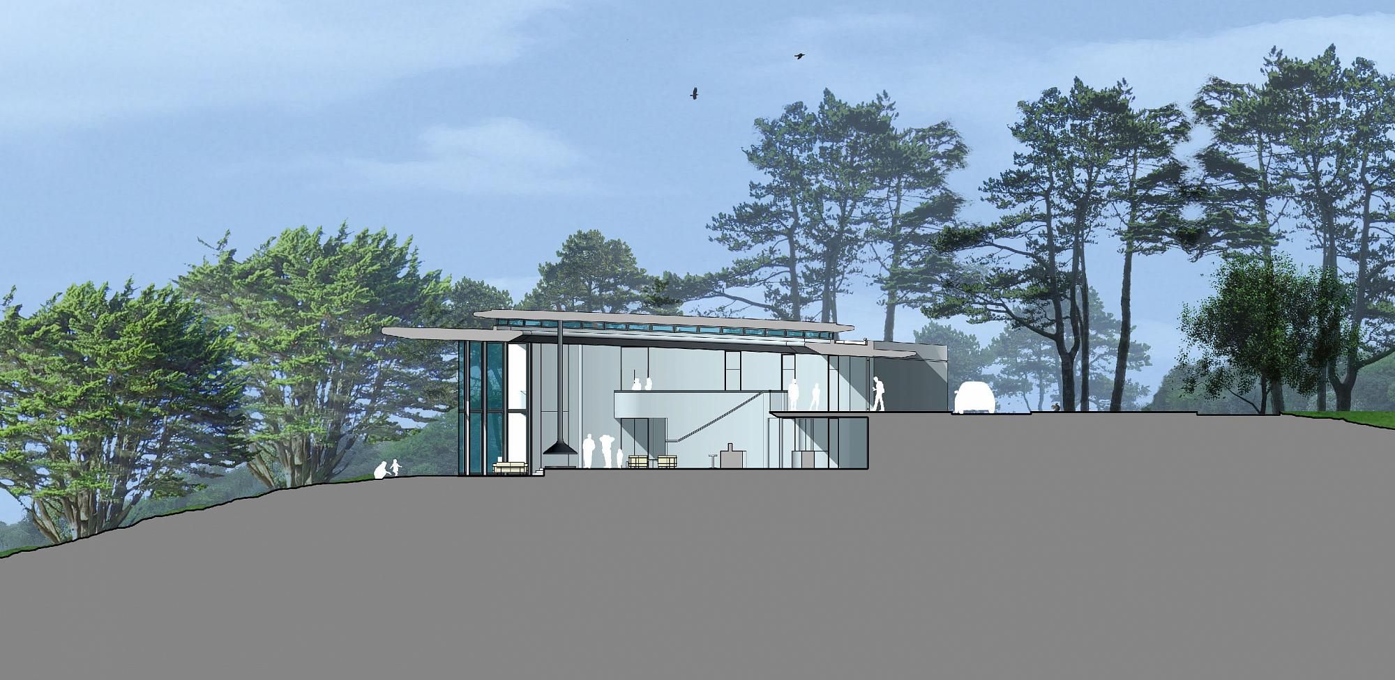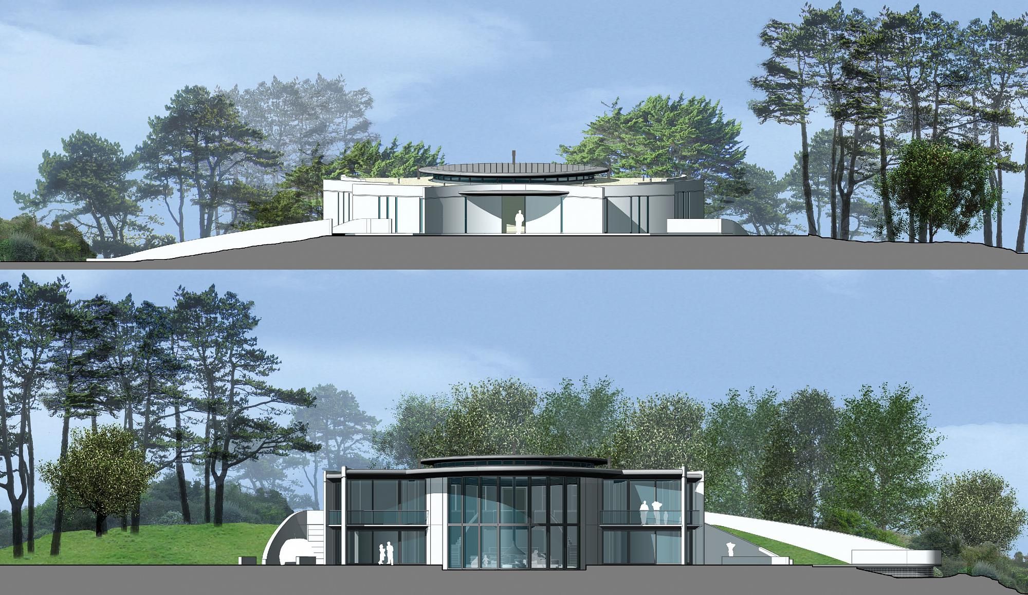 A prominent hilltop site would favour a house that is settled partly into its surrounding land. Other arrangements could appear either too intrusive or would not be able to take advantage of the stunning views from the site.