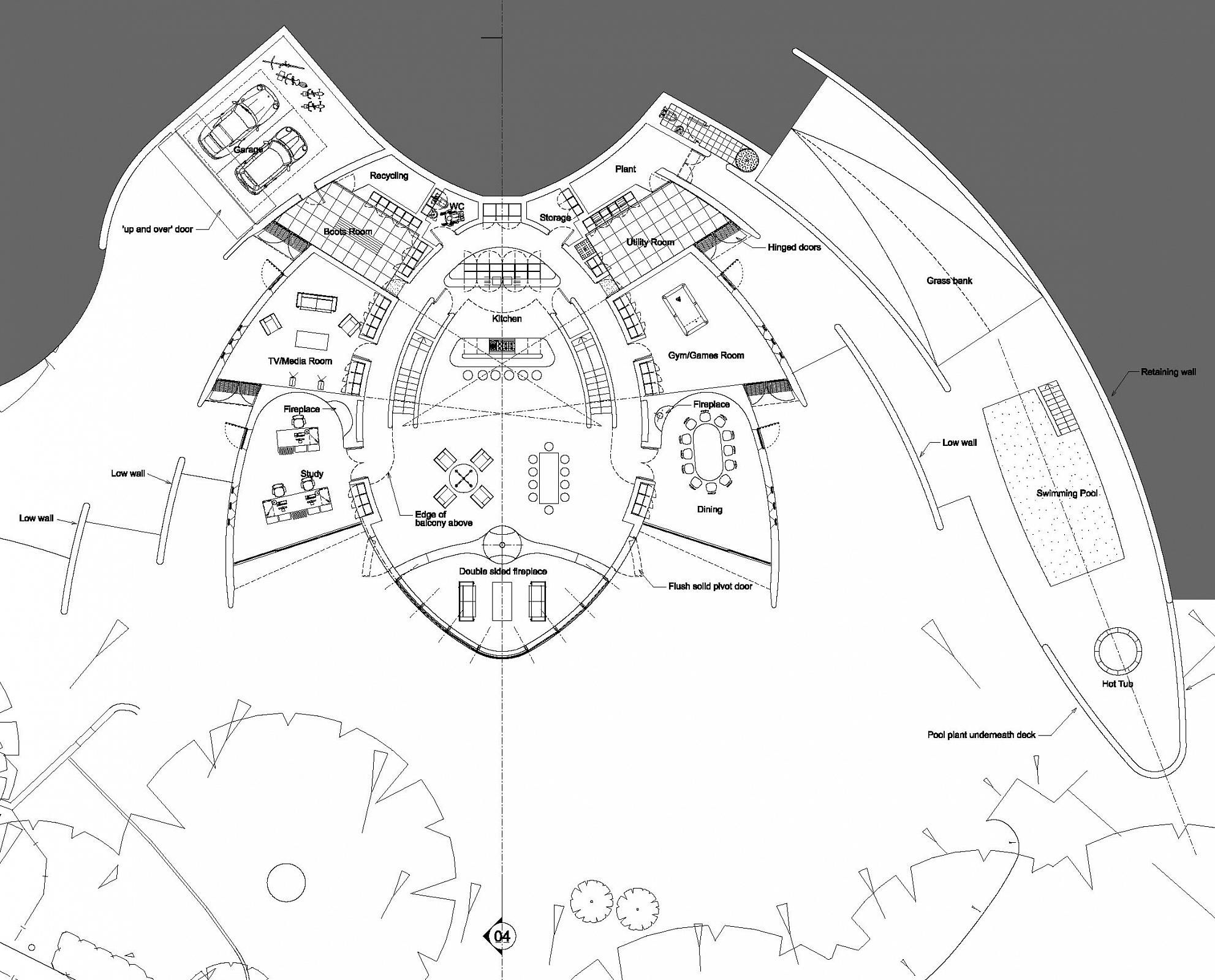 Arranged around the ‘Big Room’ are the more private spaces such as the bedrooms, dining room, study, TV/media room, games room, utility room and plant space.