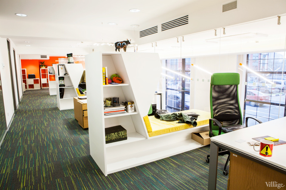 Релаксационные кушетки устроены в качестве разделителей между рабочими местами руководителей проектов. Они же являются центрами неформального общения.