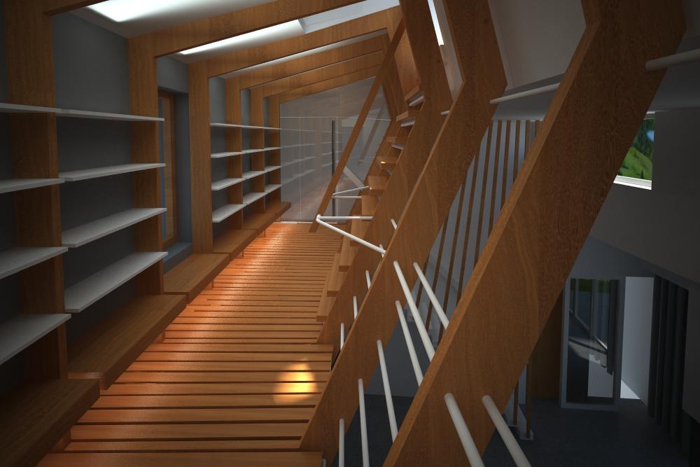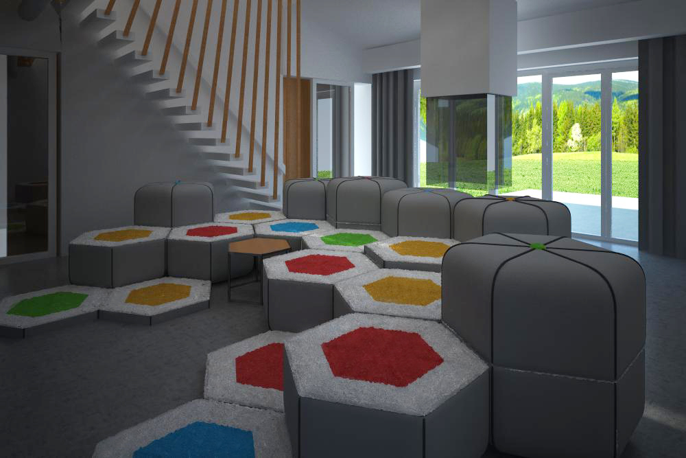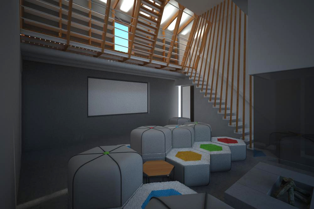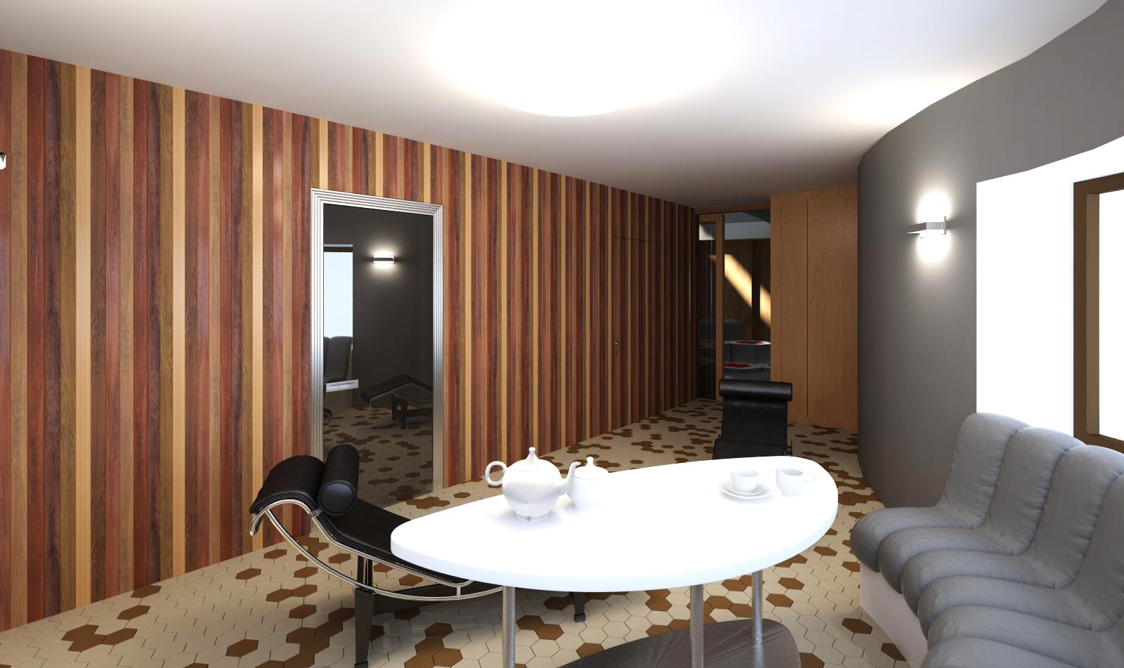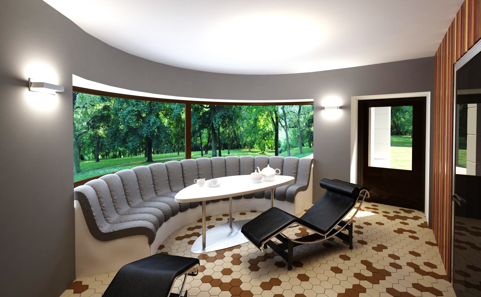 Мебель: Большая часть мебели изготавливается по индивидуальным проектам. Особое внимание - трансформируемая мебель гостиной. Она состоит из отдельных модулей, которые могут штабелироваться (полностью освобождая пространство) и создавать мягкие ландшафты для различного функционала. Две основные конфигурации - "кино" и "камин".