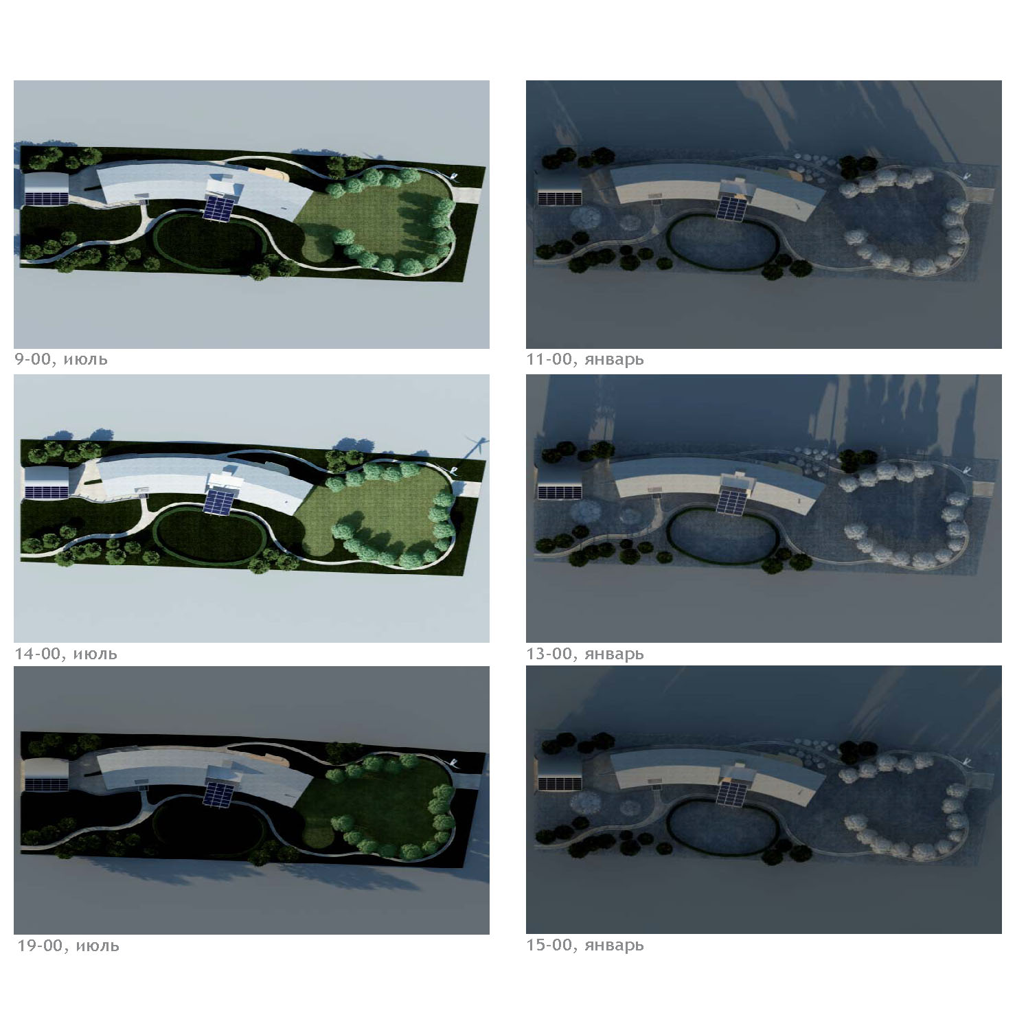 Для полного контроля над атмосферой дома сделали Диаграммы освещенности. Для предотвращения перегрева помещений в летнее время проектом предусмотрены навес и подвижные створки наружных солнцезащитных жалюзи.
