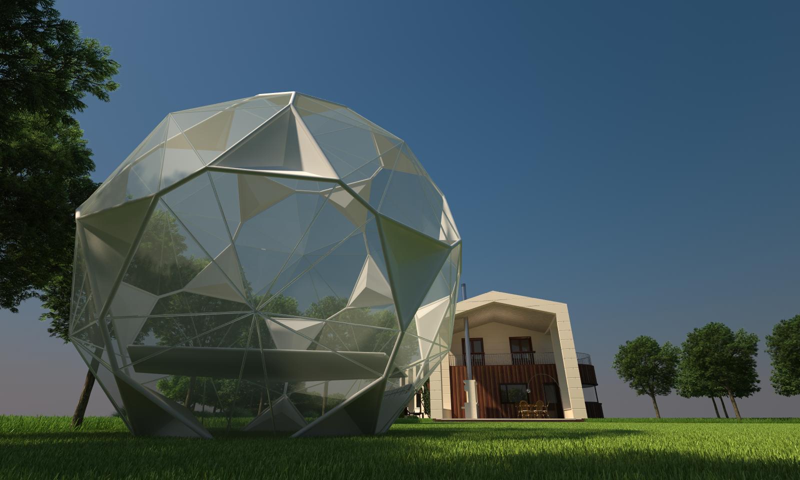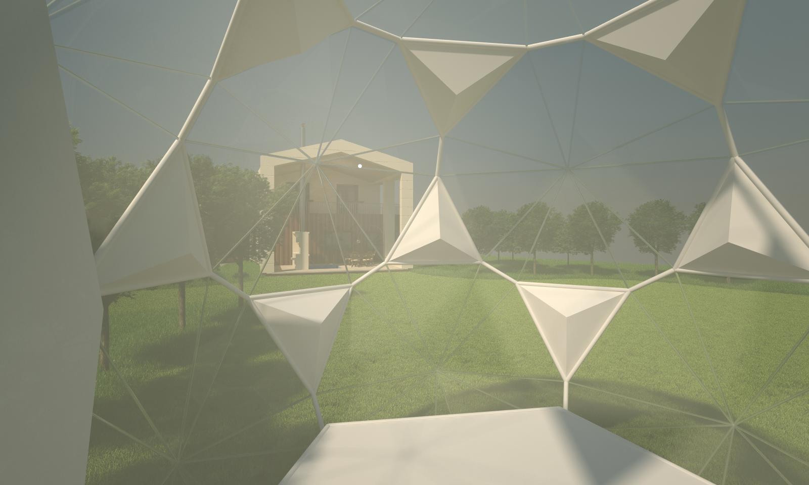 Модульная сборная конструкция из нержавеющей стали. Натяжной пол из  прорезиненной батутной ткани оторван от земли. Конструкция обтянута маскитной сеткой.