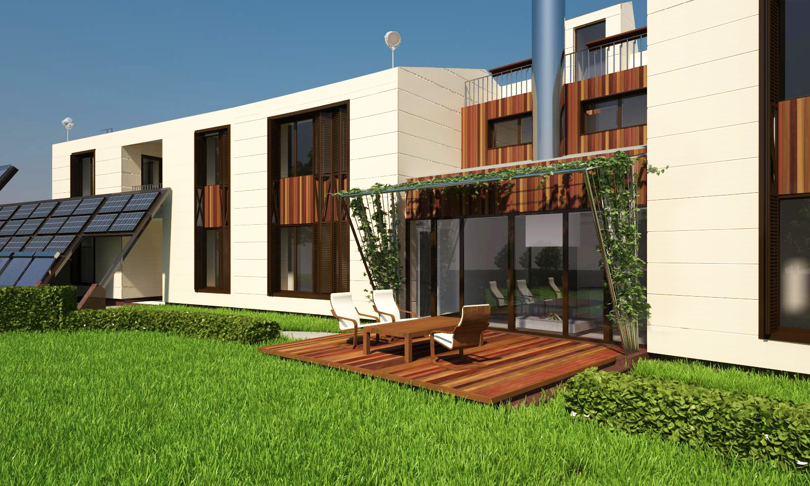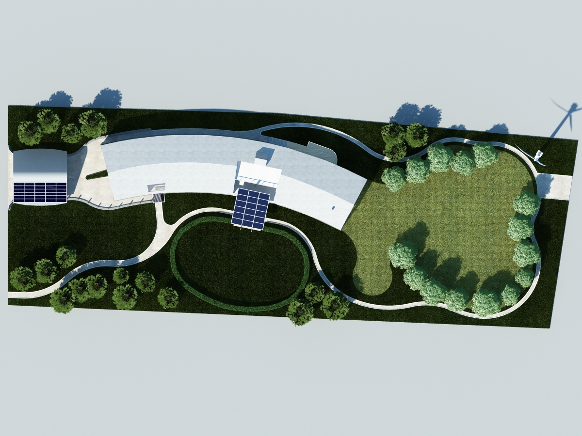 Генплан: Участок состоит из двух земельных лотов (развивается с запада на восток - 80 х 28 метров). Дом и основные вспомогательные элементы благоустройства располагаются по северной границе участка. Такое расположение проявляет самый большой линейный размер землевладения - его длину и зрительно его увеличивает. Протяженная форма узкого (7 метров) корпуса позволяет развернуть все основные помещения в южную сторону - максимального солнечного освещения. Энергия солнца будет использоваться как пассивным - аккумулируя тепло массивными ограждающими конструкциями помещения (ж.б. перекрытия, ребра жесткости...), так и активным образом - через батареи и коллекторы. Солнечные батареи и коллекторы предполагают быть акцентными элементами дизайна - навесами и перголами (заменяя, где это возможно, традиционные покрытия).