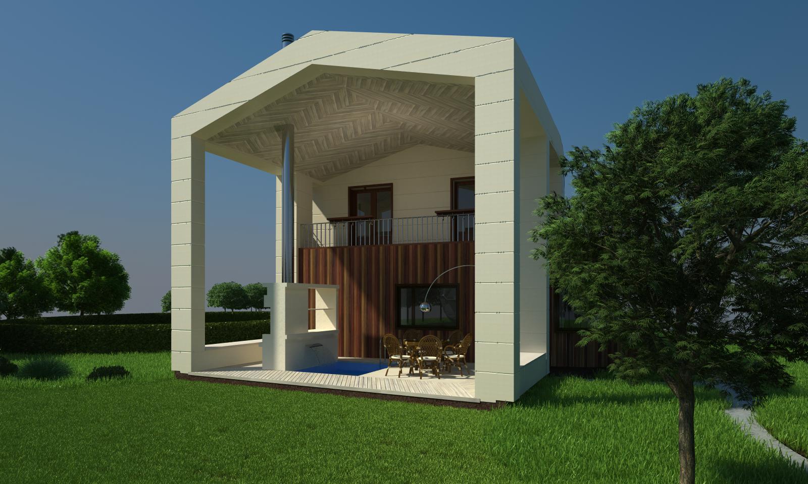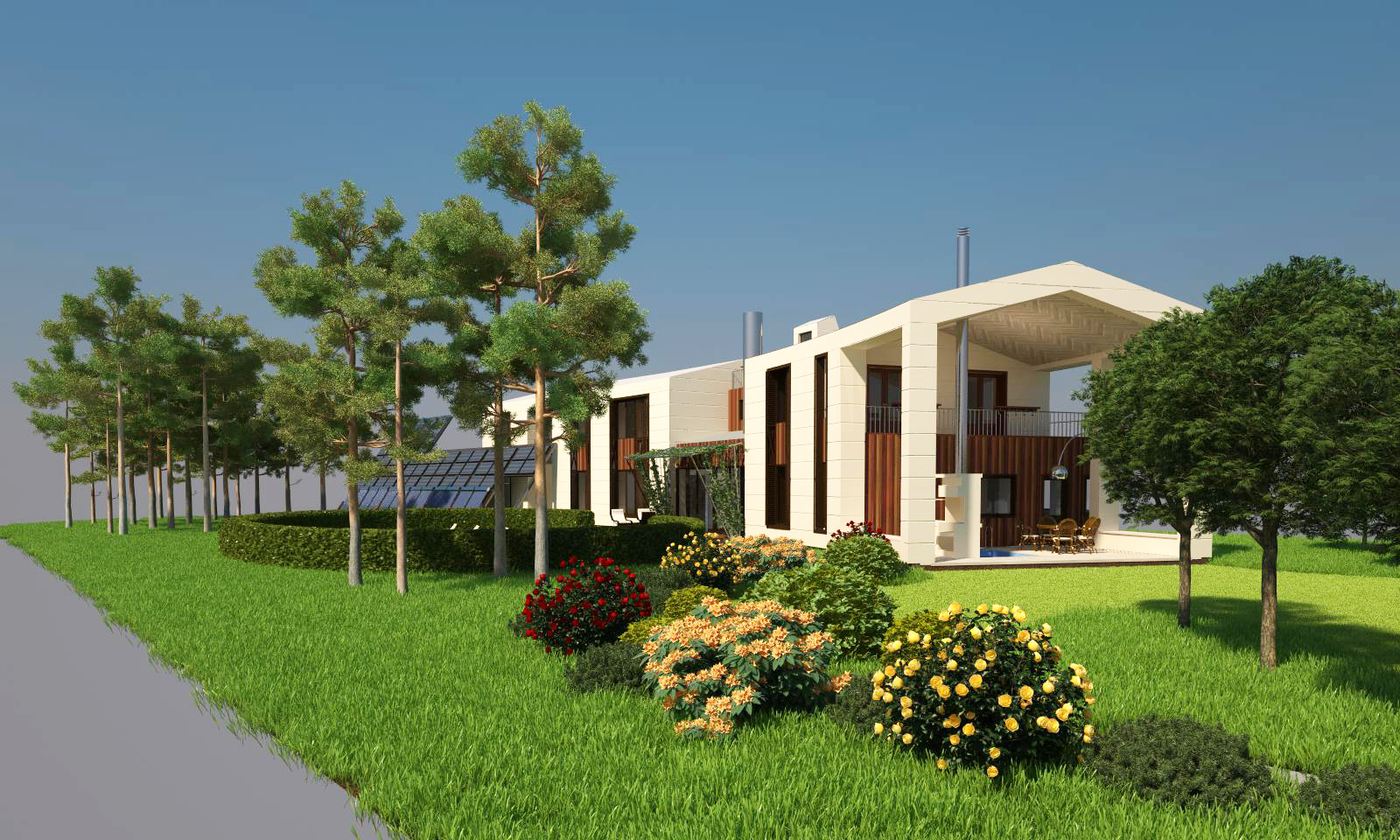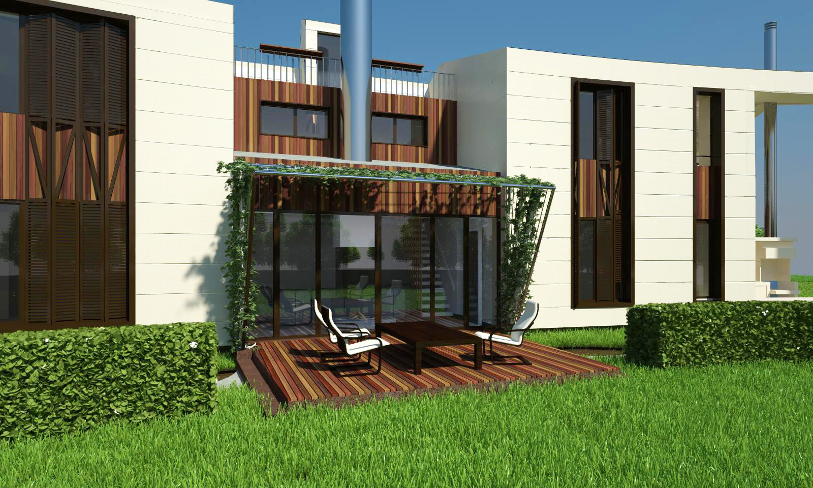 Расположение помещений и веранд дома используют эту ситуационную особенность как преимущество. Расположив основные помещения дома на “стыке” участков мы получаем уникальное преимущество - вид на соседние участки, исключающий застройку непосредственно перед окнами нашего дома, т.к. согласно действующим нормативам, соседствующие застройщики (обладая стандартным “одинарным” земельным лотом) обязаны отступить потенциальной застройкой минимум на 3 метра от границы участков.