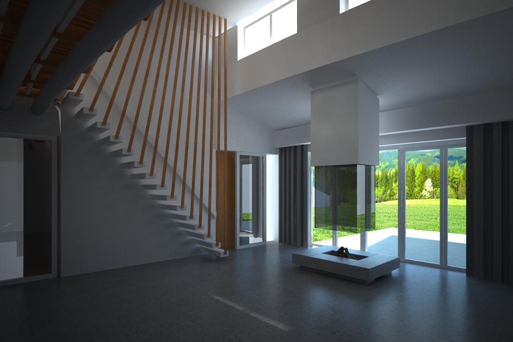 Здание имеет широтную ориентацию - основные жилые помещения обращены на юг. Спальные комнаты и гостиная - получают самый привлекательный свет из возможных. Это многоплановая перспектива через южную поляну участка на лес и реку. На эксплуатируемой крыше гостиной, на отметке около 5-и метров, организована веранда с панорамным видом. На восток обращен навес над балконом второго этажа и дощатой террасой бани и барбекю. Под ним же располагается всесезонная открытая купель-фонтан. Восточный фасад обращен в сторону колокольни и восточной поляны - это самое большое открытое пространство участка - предназначено для спортивных игр и развлечений. Образ дома следует базовому архетипу здания, объединенного большой крышей. Зона парковки, солярий верхней террасы и навес для зоны барбекю комфортно размещаются под линией скатных конструкций, создающих атмосферу гостеприимства.