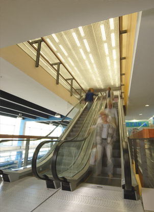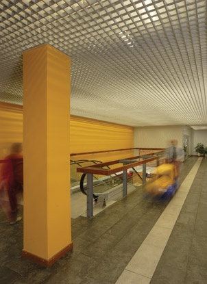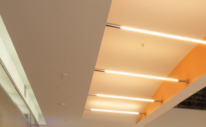 В работе над проектом интерьеров ТК "Вертикаль" превалировал предмет ремесла. Здесь целью архитектурного проектирования было превратить объект строительства в экономически оправданный продукт. Мы, обладая минимальным строительным бюджетом, реализовали самые эффективные с точки зрения экономики строительства решения - обладая уникальным ноу-хау, сделали архитектурное качество доступным. Например, проведя тестирование систем решетчатого подвесного потолка (Грильята) в пожарных лабораториях, доказали, что спринклерные головки могут функционировать в запотолочном пространстве. Таким образом, Клиент сэкономил значительное время и средства на монтаже и классе спринклерных головок. В этом же запотолочном пространстве решетчатого потолка мы разместили люминисцентные светильники (на самой простой арматуре) - таким образом, алюминиевая решетка подвесного потолка стала единым эффектным светильником, дающим посетителю при обзоре в движении интересный оптический эффект "убегающей" световой волны. Заслуживает внимания также работа над изготовлением светильников для главной галереи пассажа. Это тонкие открытые люминесцентные трубки, посаженные в индивидуально изготовленные перфорированные стальные гнезда стартеров. Отражателем для светильников стала волна гипсокартонного подшивного потолка. Таким образом, мы позволили заказчику отказаться от дорогостоящих импортных светильников и получить уникальный дизайн.