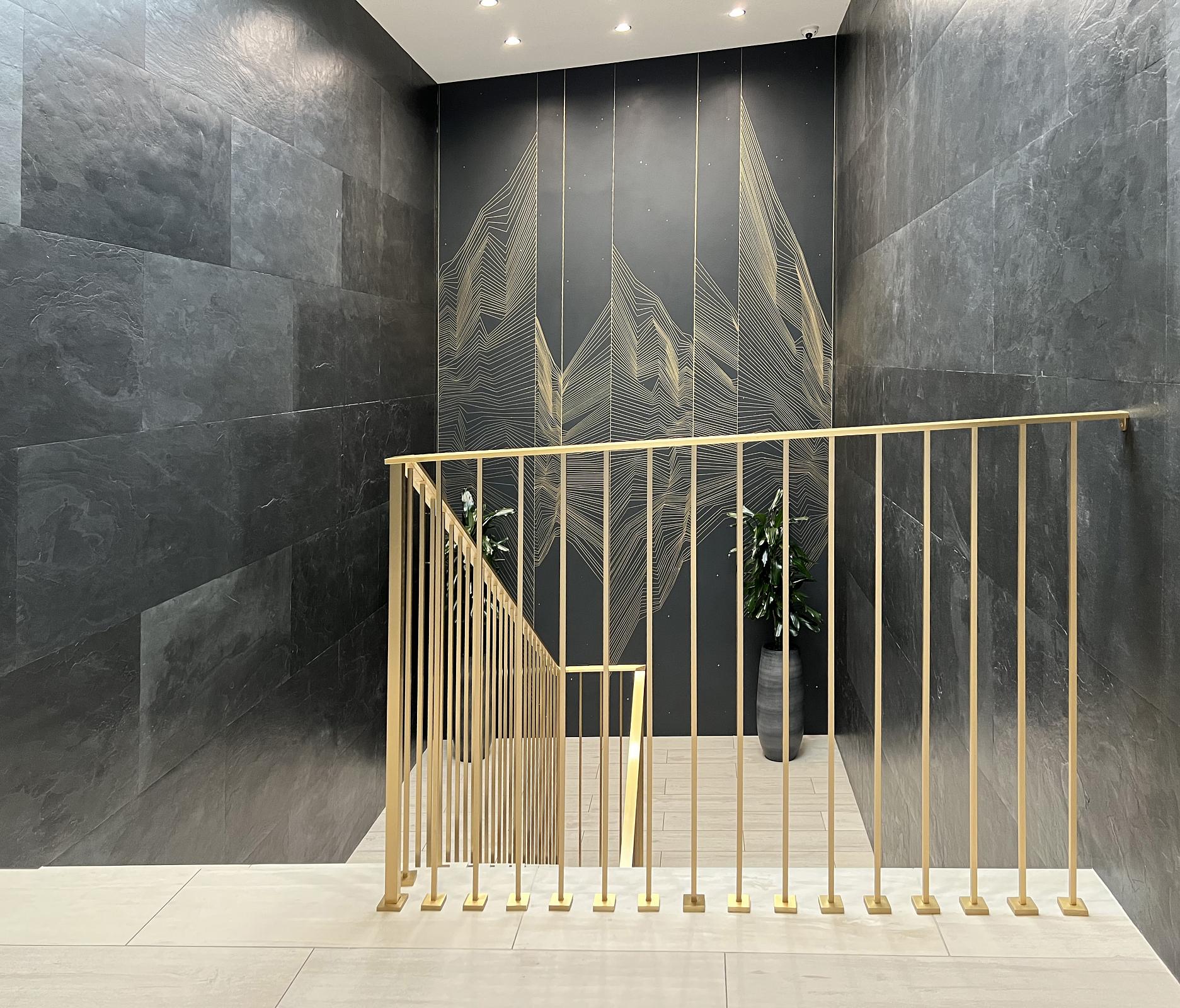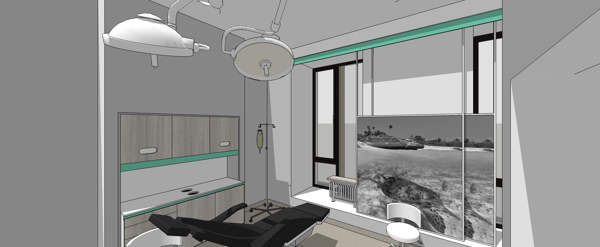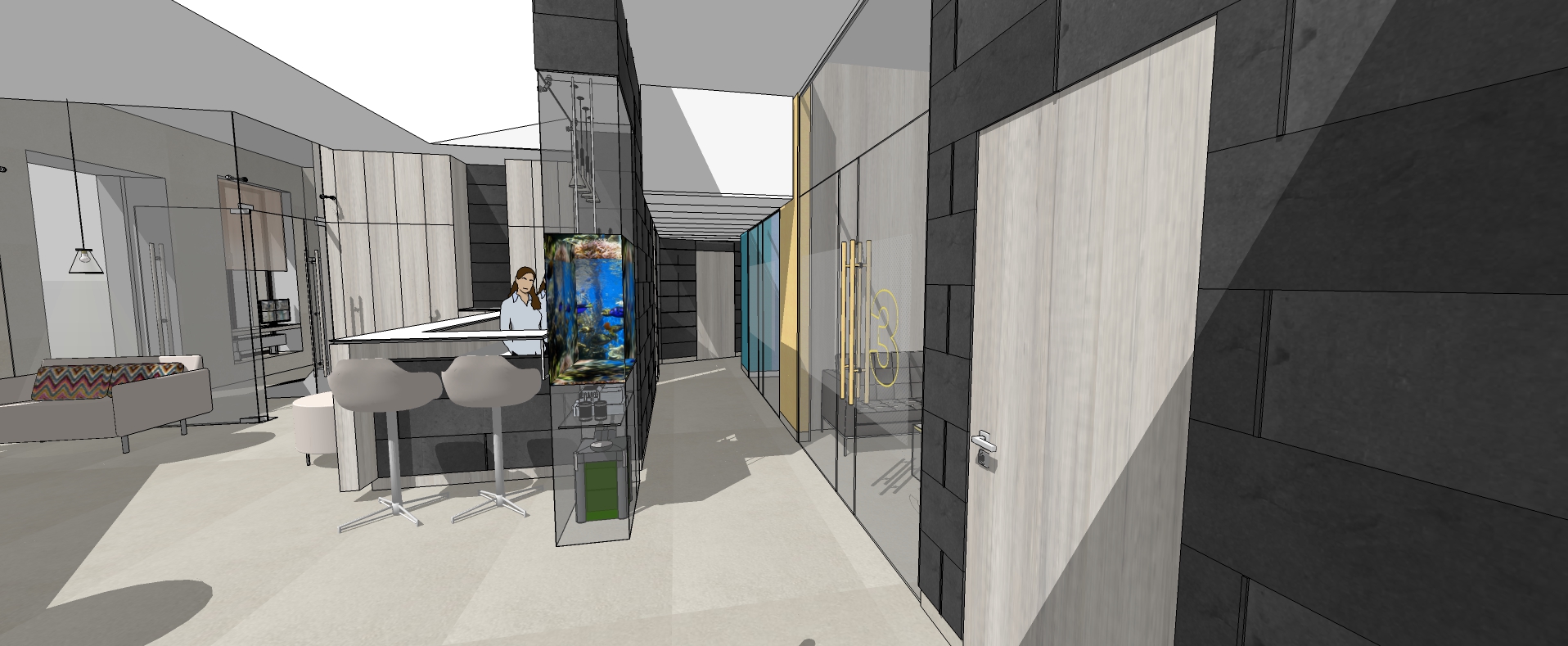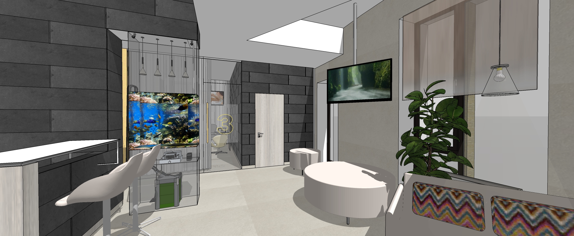 Отделка стен стоматологической клиники натуральным камнем - черный сланец, дизайн пола и зон повышенной проходимости - крупноформатный керамогранит 5мм. Системы освещения - диодные лайтбоксы с точной цветопередачей. Аквариум встроенный с системой самоочистки и автоматизированным терморегулированием.