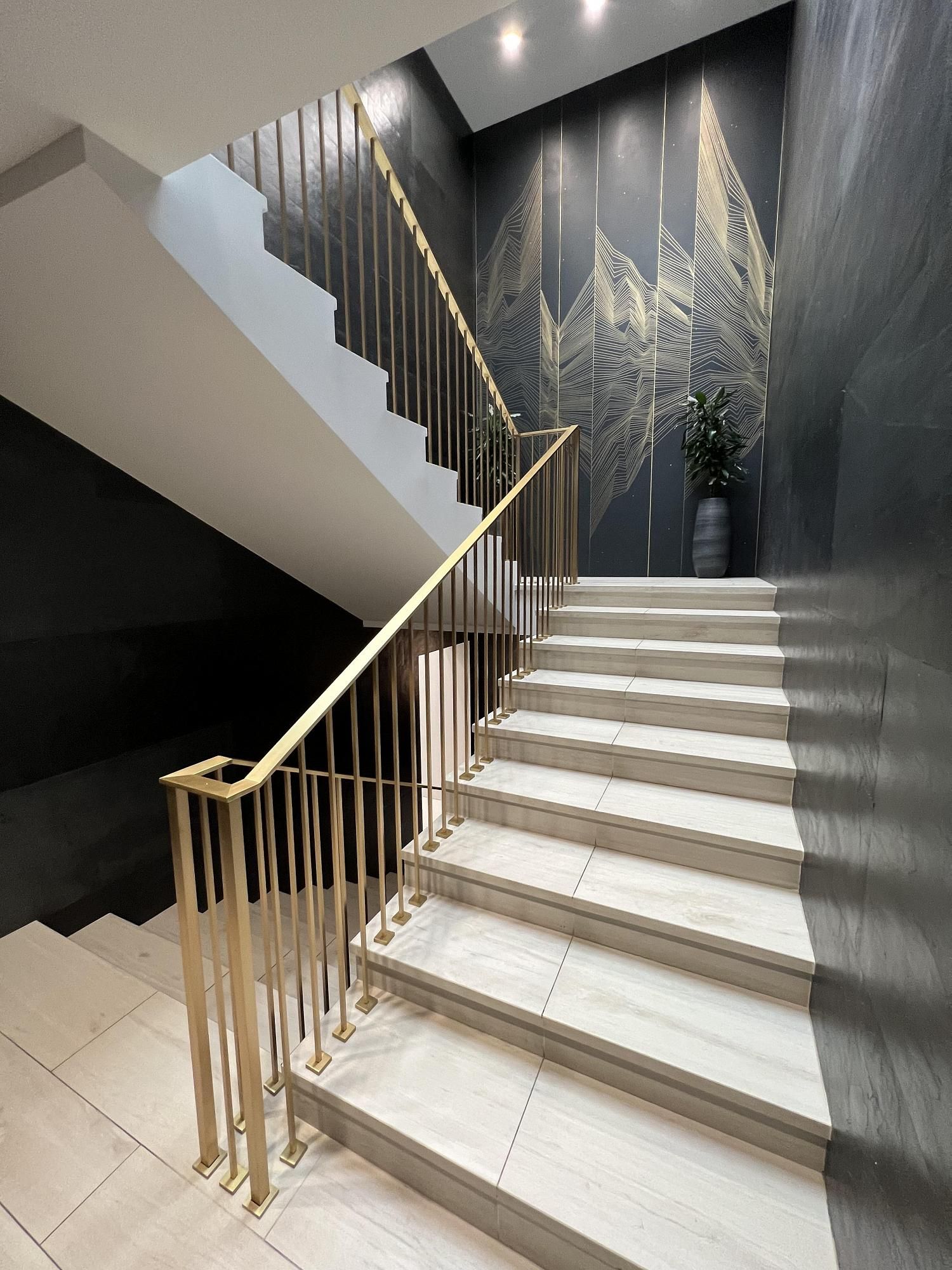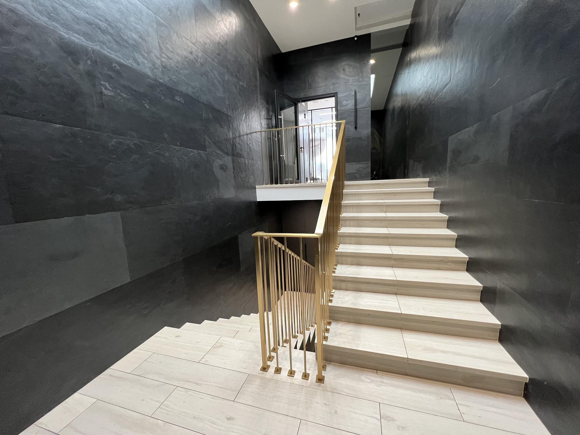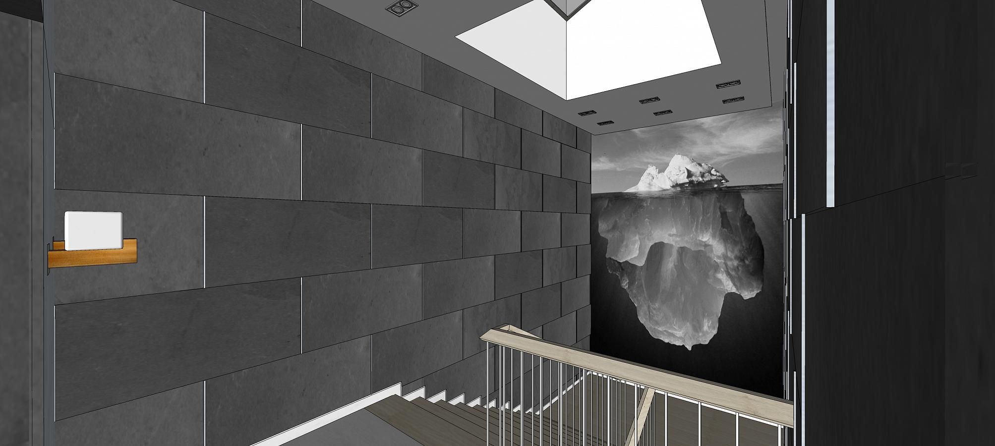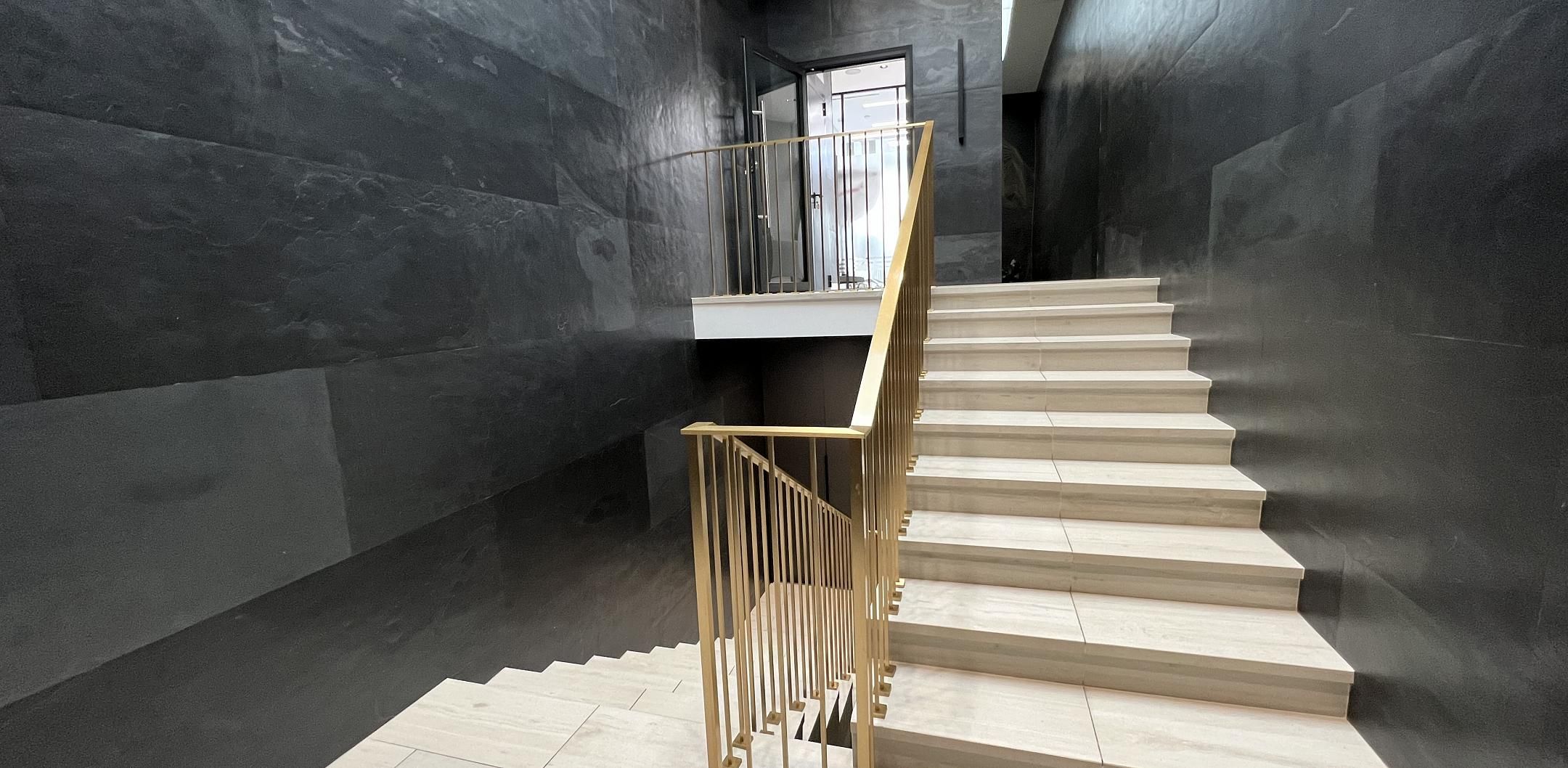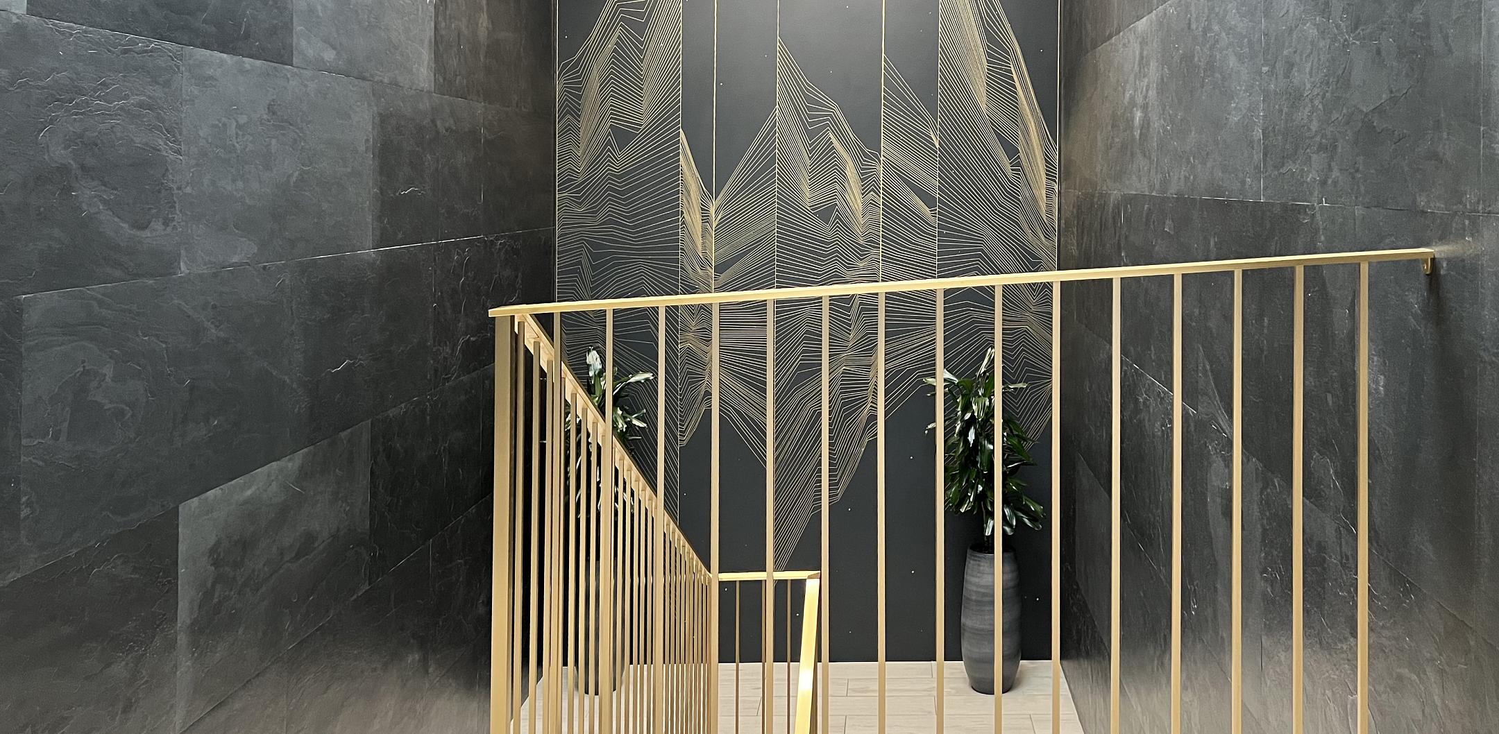 Отделка стен стоматологической клиники натуральным камнем - черный сланец, дизайн пола и зон повышенной проходимости - крупноформатный керамогранит 5мм. Системы освещения - диодные лайтбоксы с точной цветопередачей. Аквариум встроенный с системой самоочистки и автоматизированным терморегулированием.
